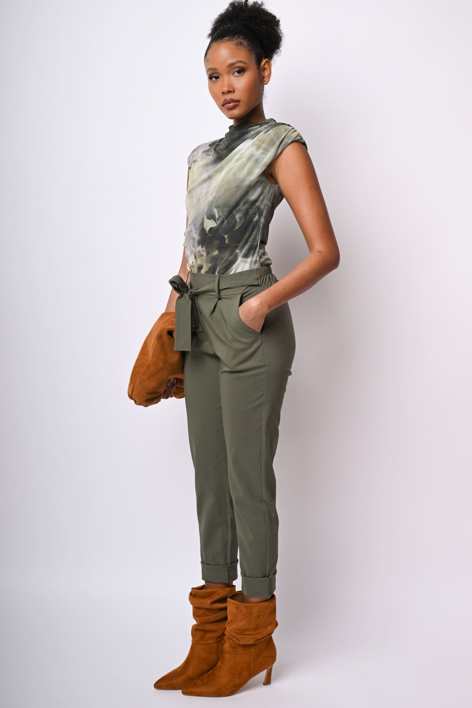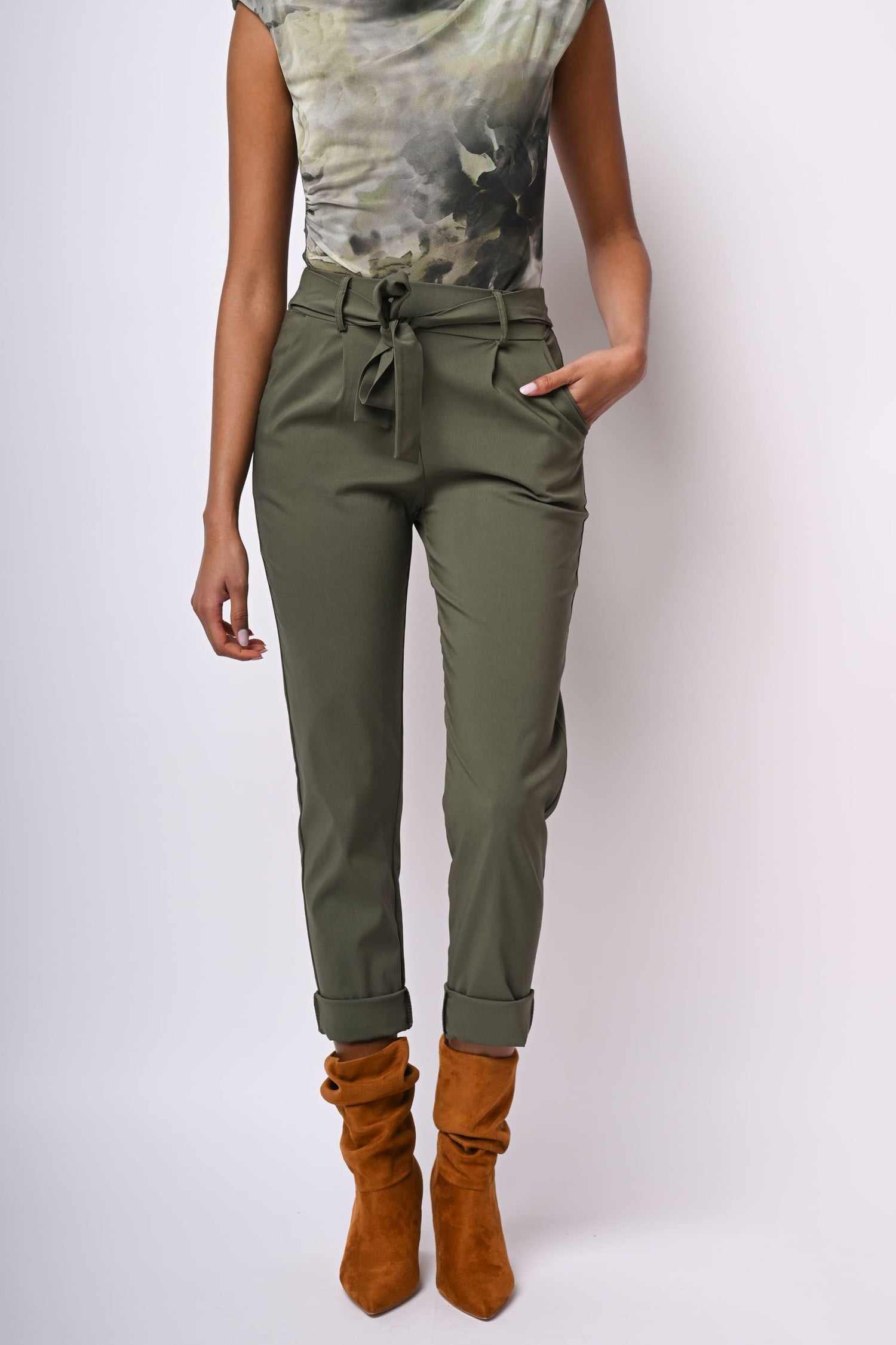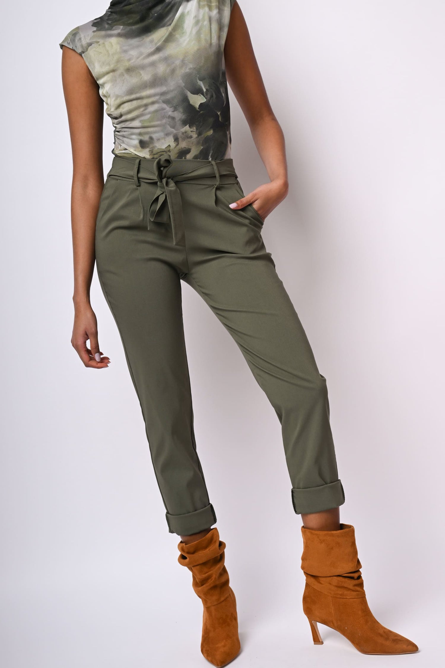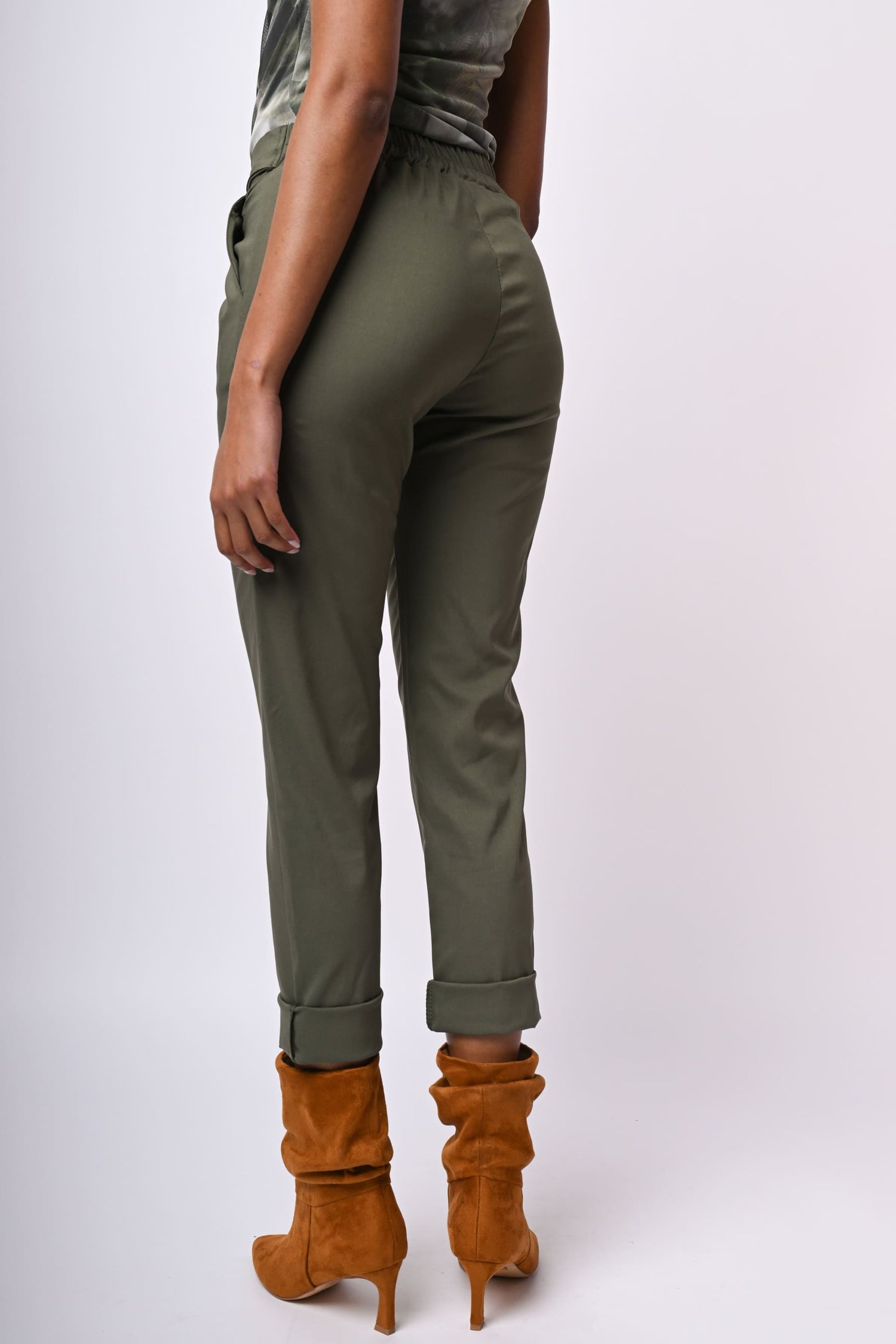 Pantaloni misto viscosa stretch verde militare con vita elasticizzata, cintura coordinata da annodare, tasche laterali, pinces frontali e gamba leggermente morbida con risvolto allorlo.