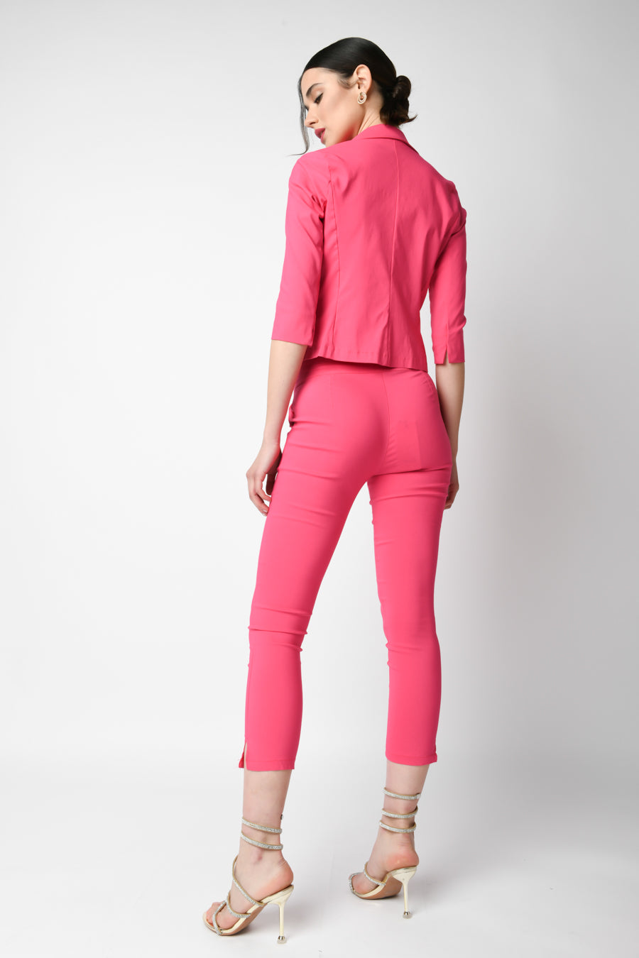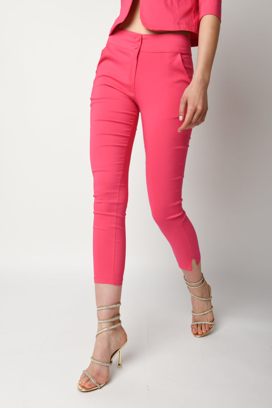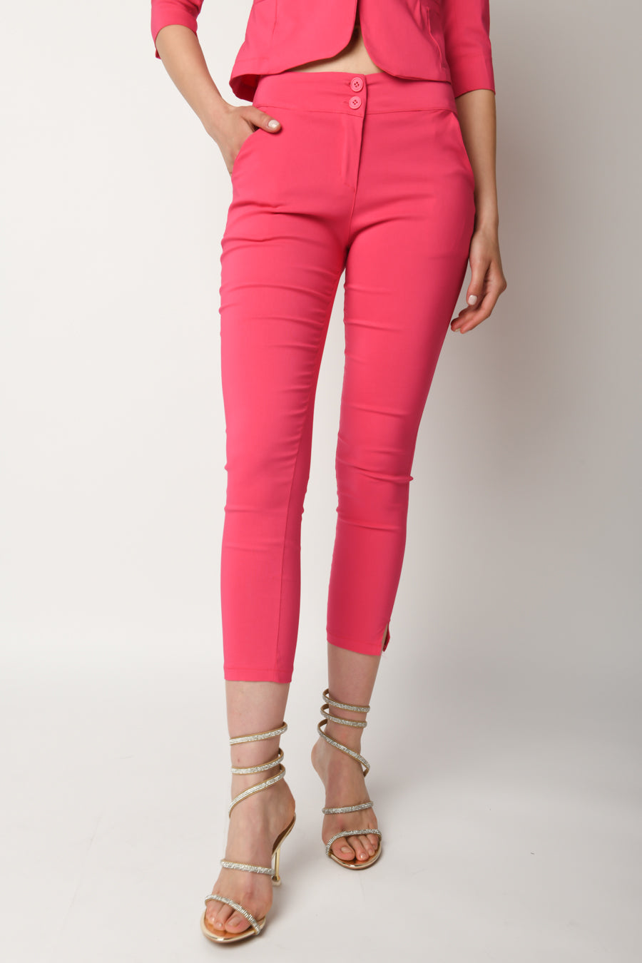 Pantaloni slim-fit in misto viscosa stretch fucsia con bottoni e zip, di chiusura, tasche laterali, spacchetti laterali e gamba leggermente crop.