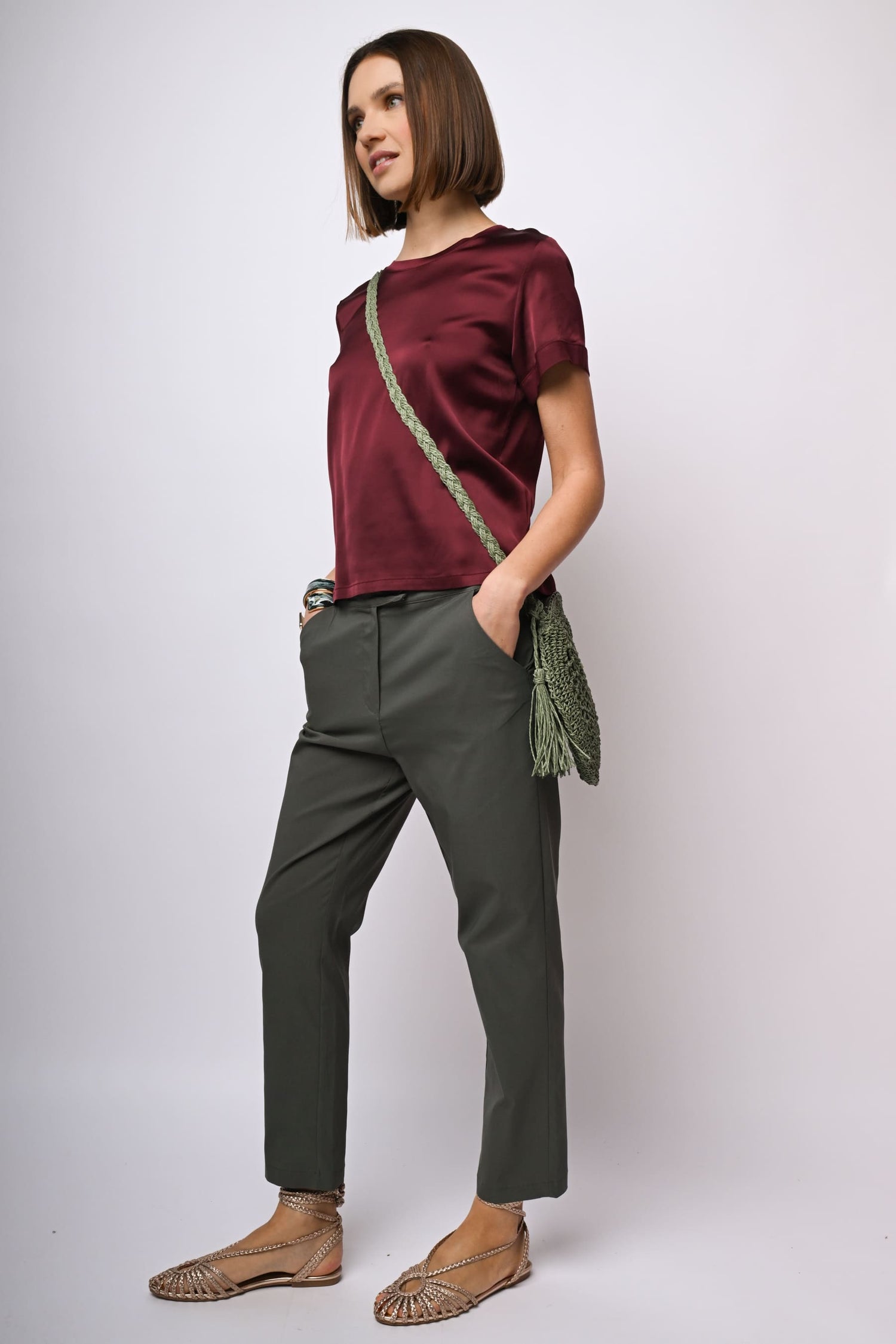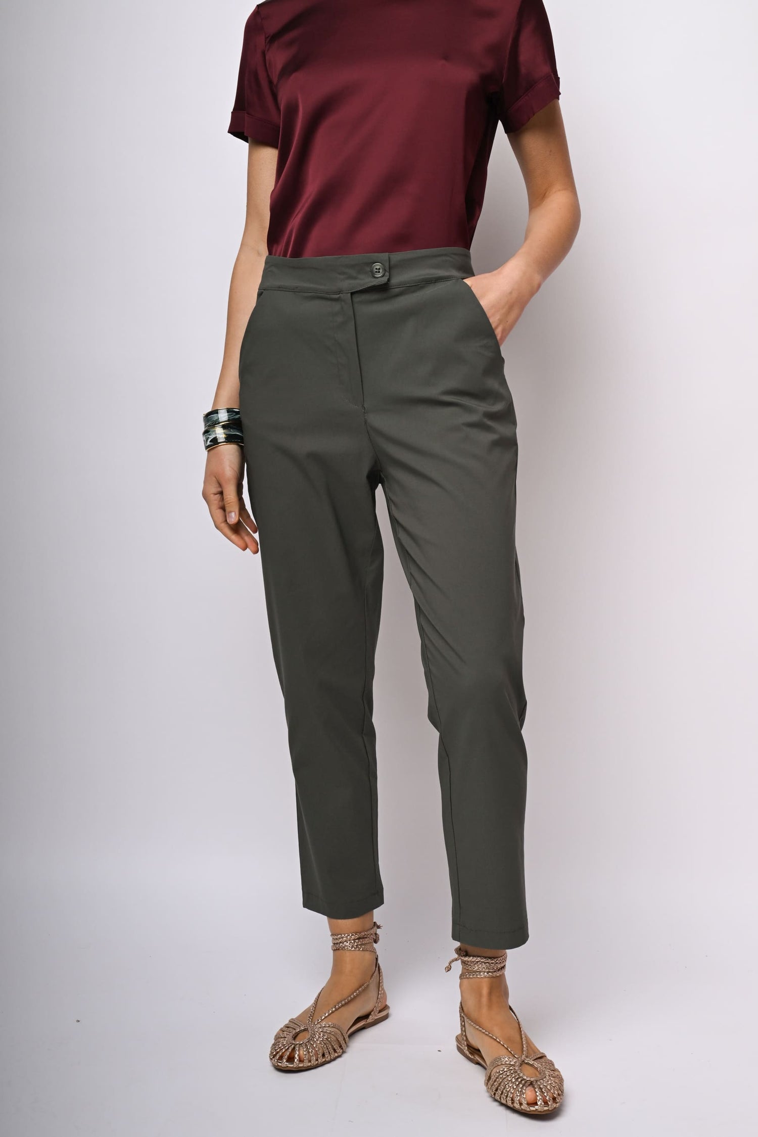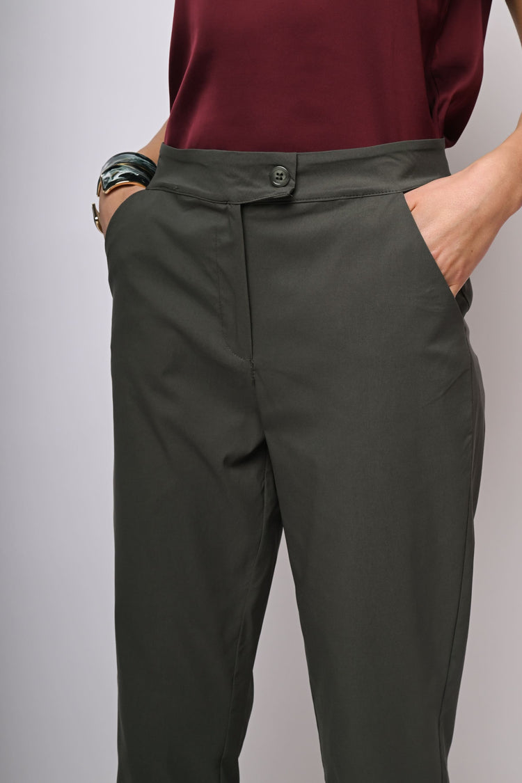 Pantaloni misto viscosa stretch verde militare con bottone, cinturino e zip di chiusura, tasche laterali, tasche posteriori a filetto e gamba dritta.