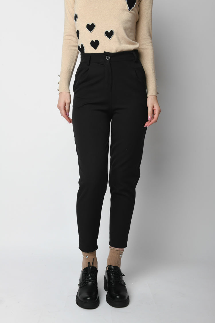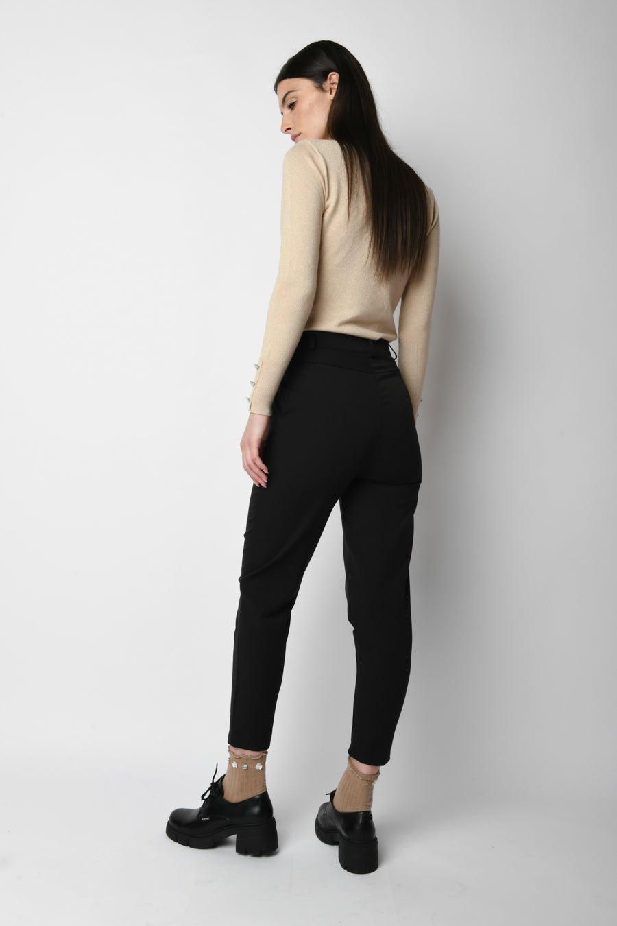 Pantaloni slim-fit in tessuto stretch nero con vita alta, passanti per cintura, chiusura con bottone e zip, tasche laterali e pinces frontali.