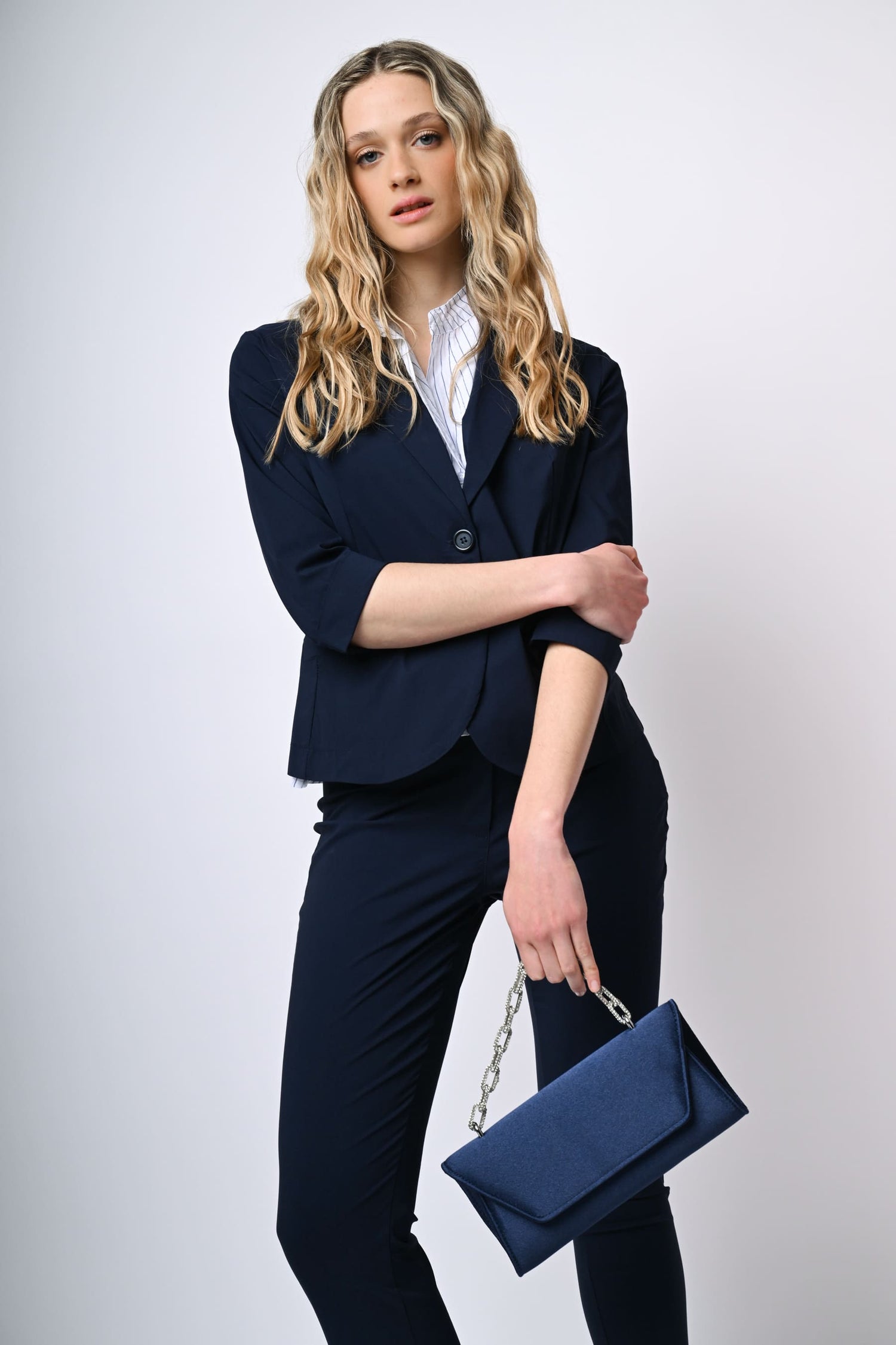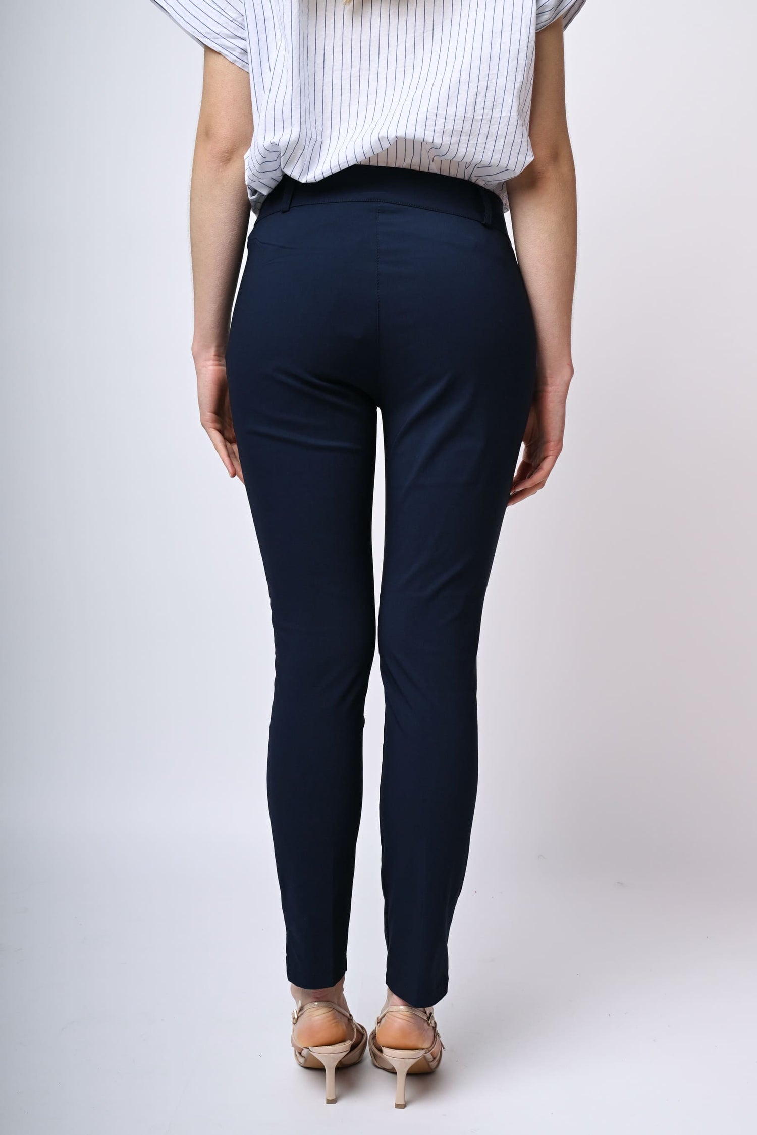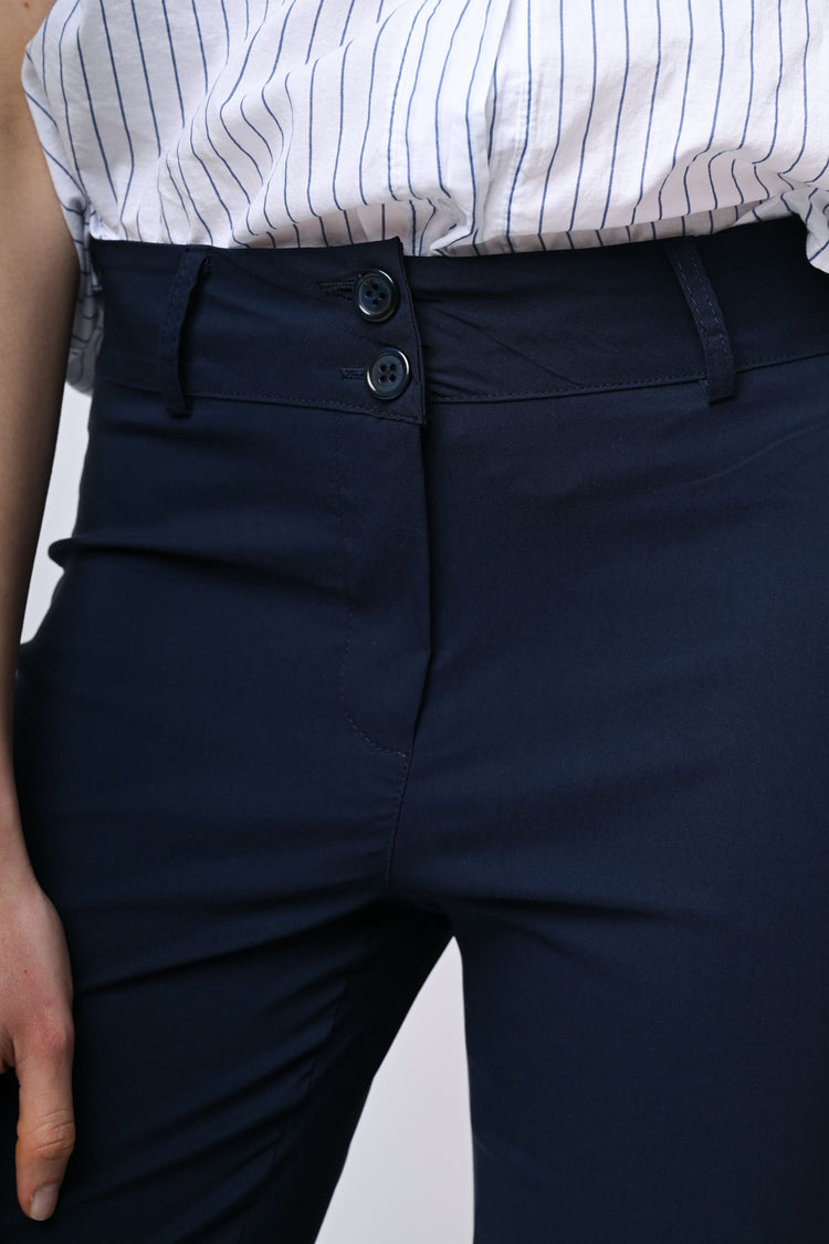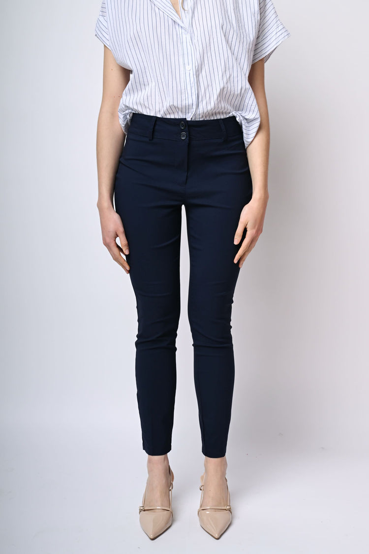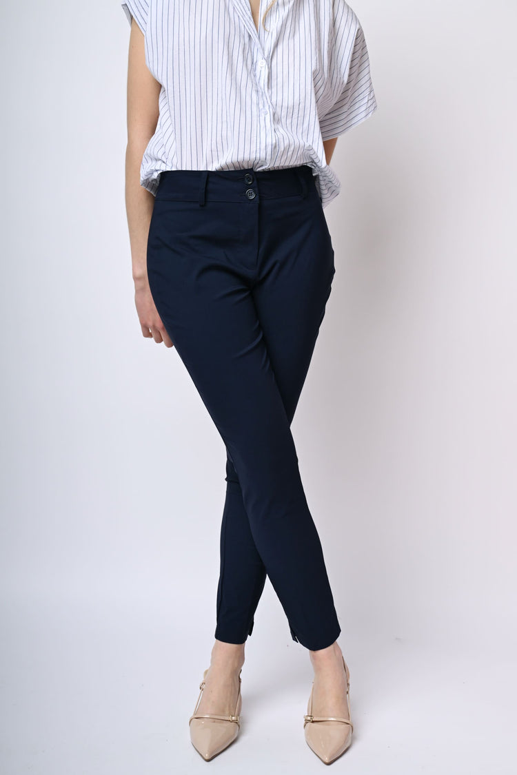 Pantaloni slim-fit misto viscosa stretch blu con passanti per cintura, due bottoni e zip di chiusura.