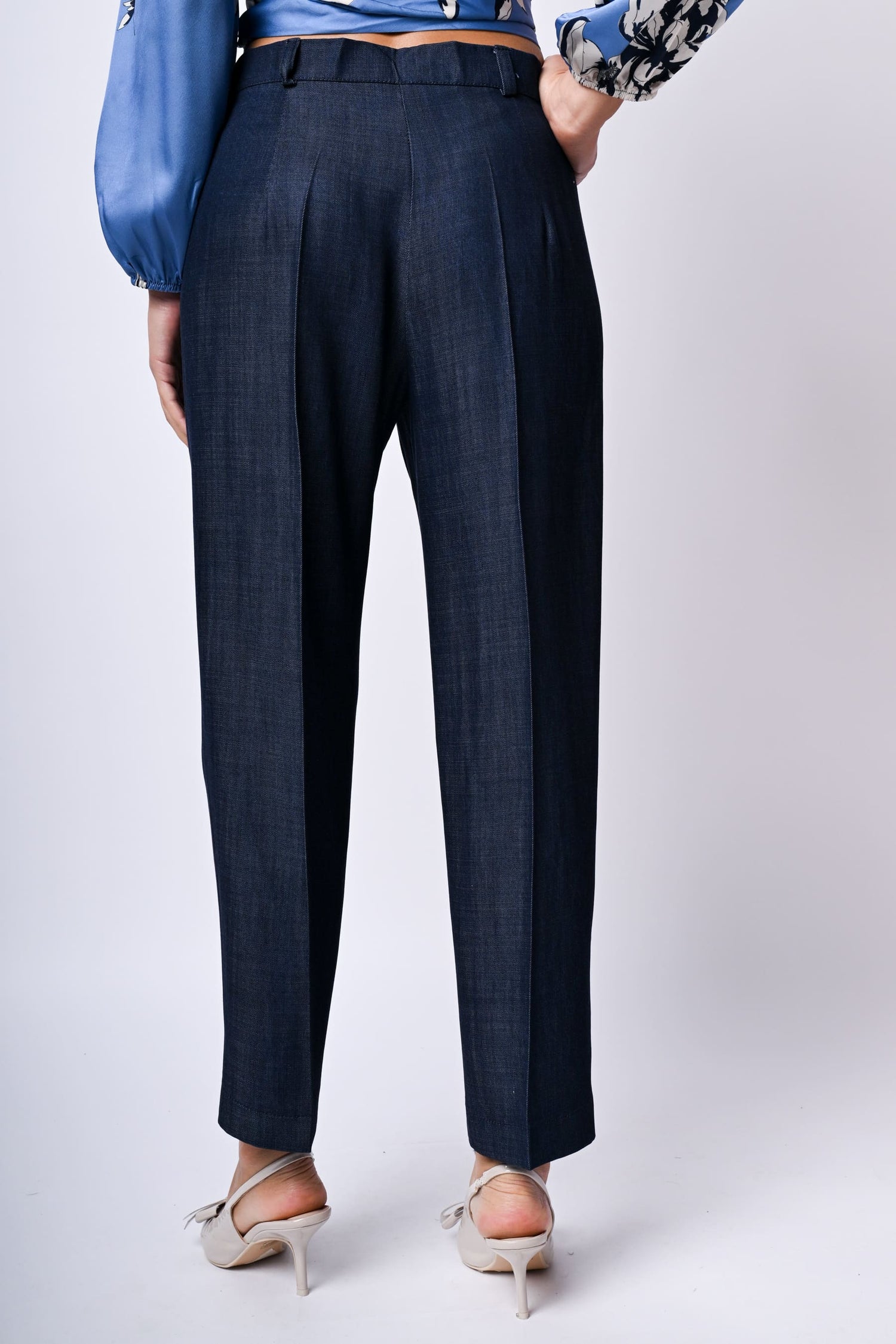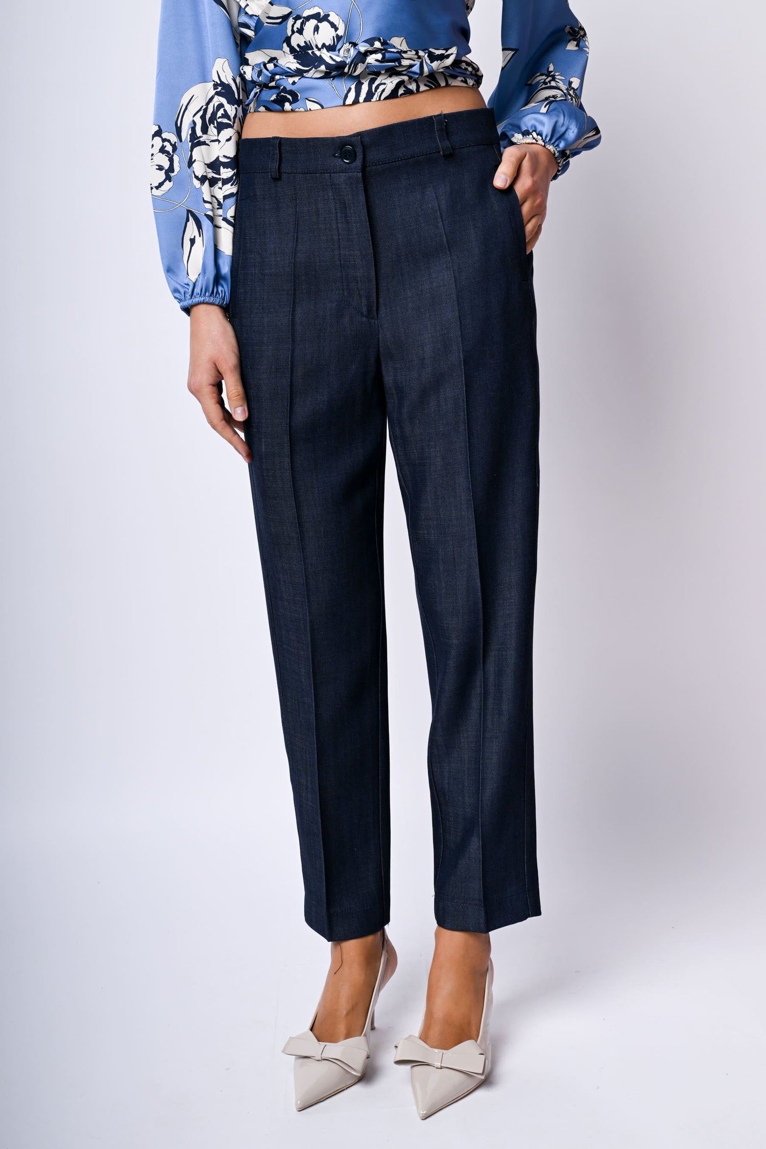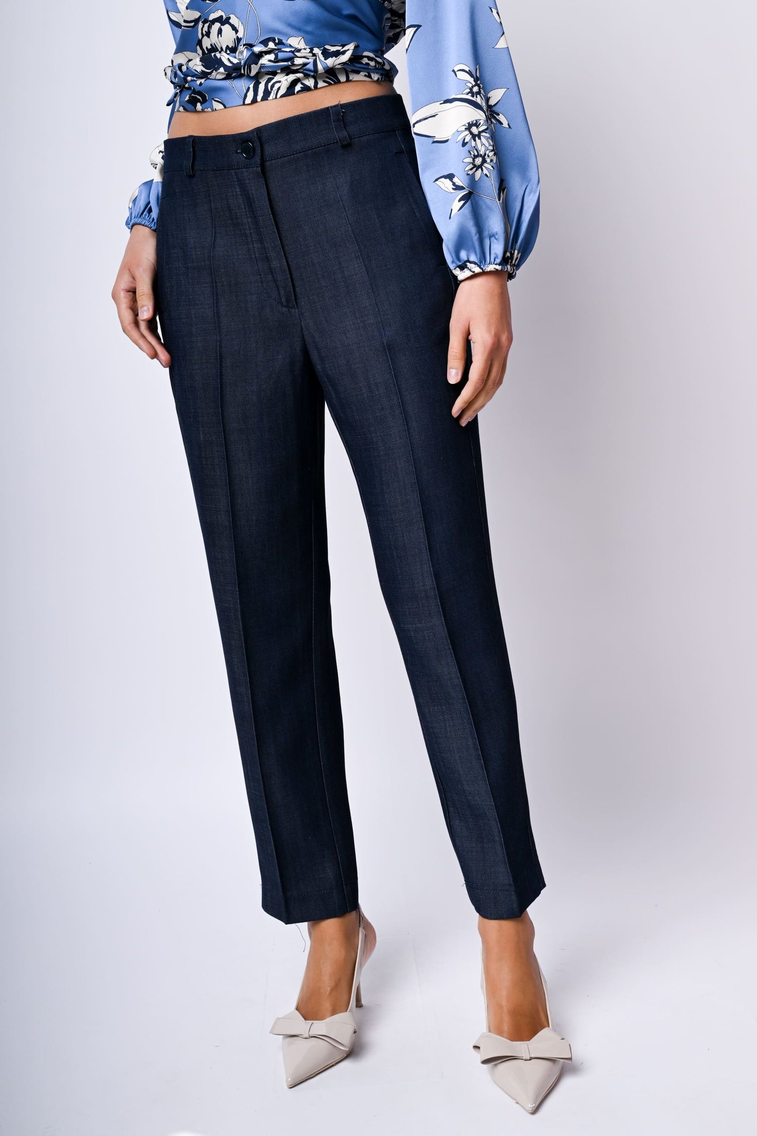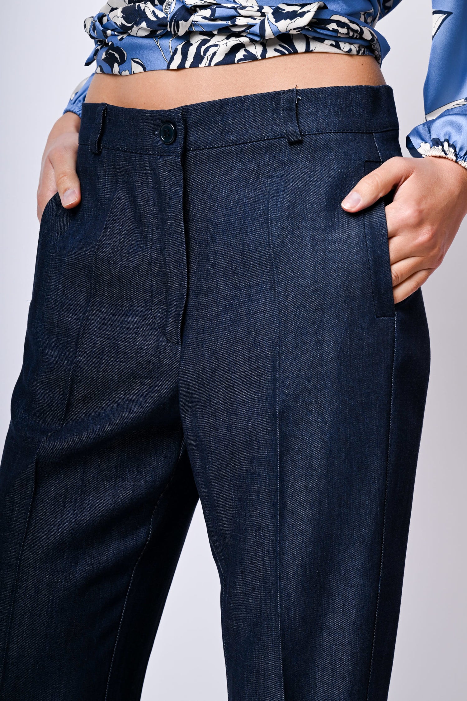 Pantaloni a gamba dritta in tencel blu con passanti per cintura, chiusura con bottone e zip, tasche laterali e piega stirata.