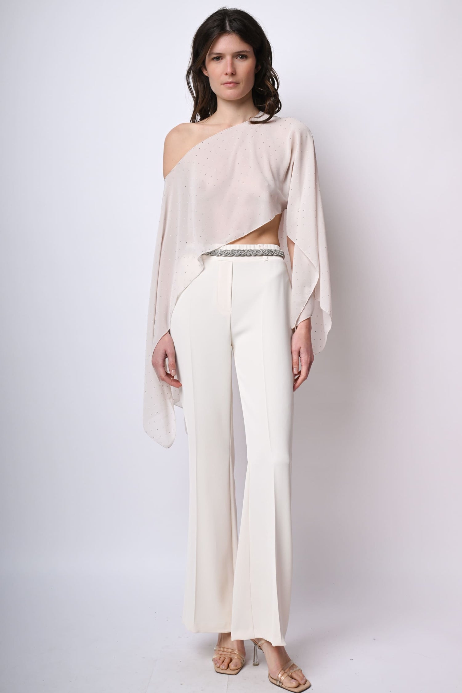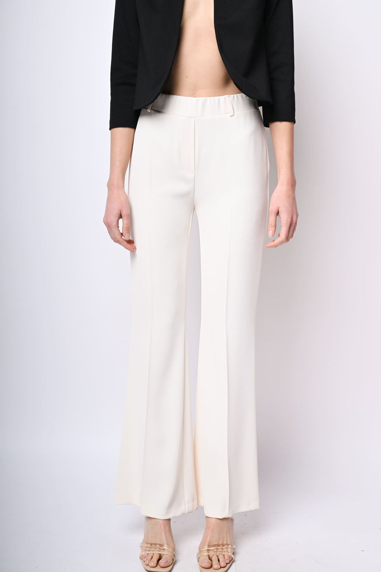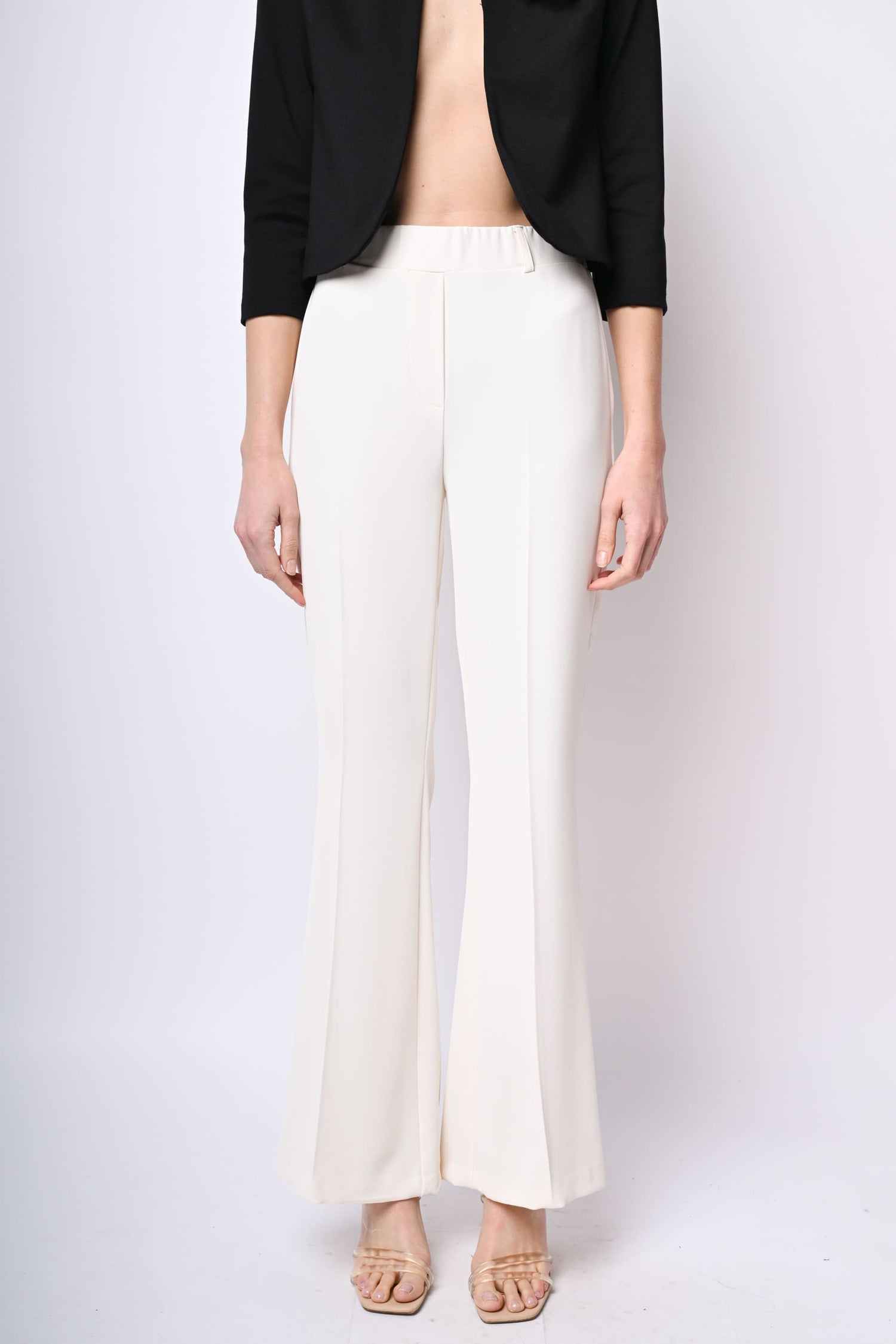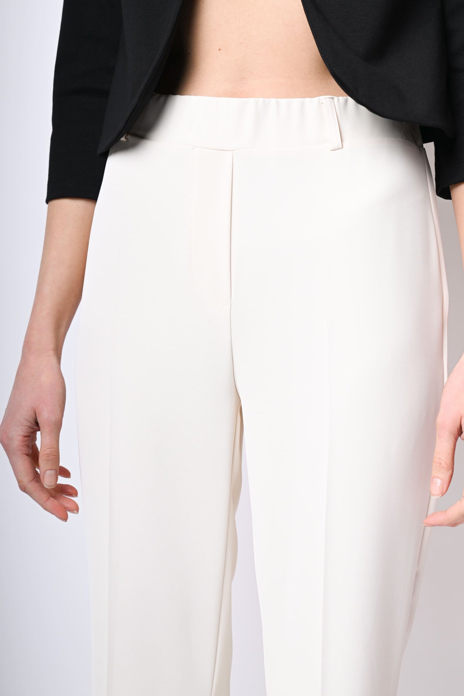 Pantaloni in cady bianco con vita elasticizzata, passanti per cintura e gamba svasata con piega stirata.