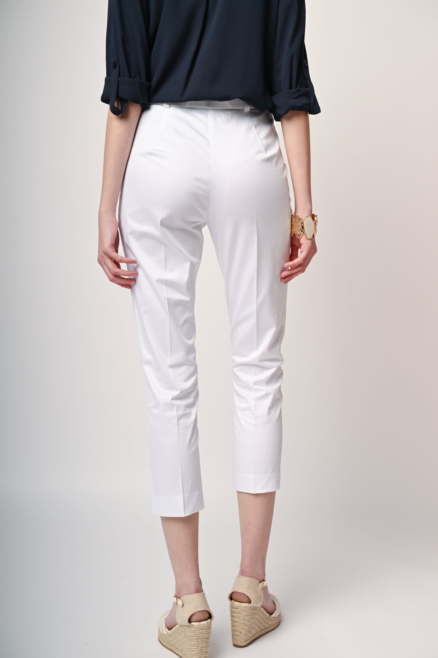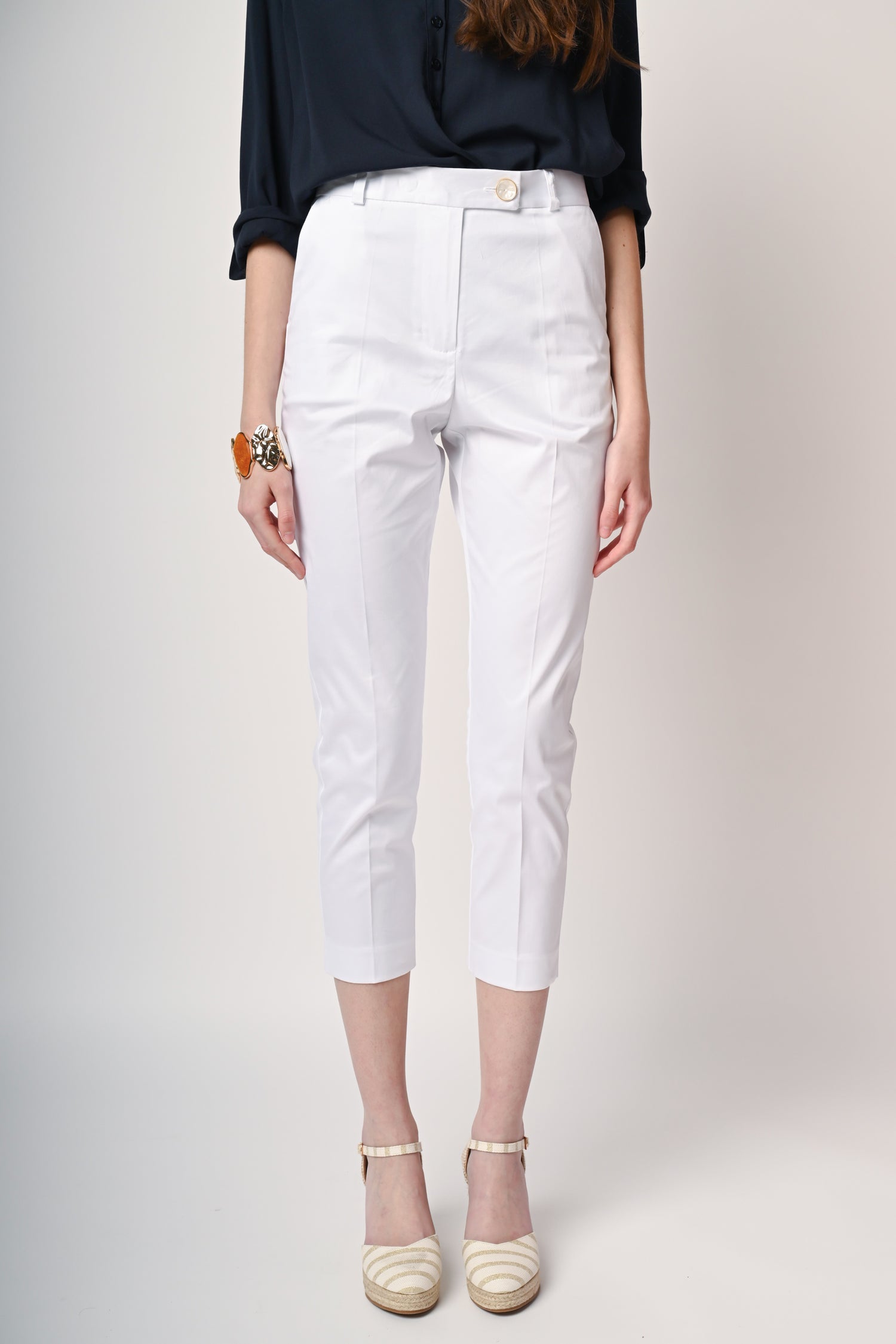 Pantaloni slim-fit crop in cotone stretch bianco con passanti per cintura, chiusura con cinturino, bottone e zip, tasche laterali e piega stirata.