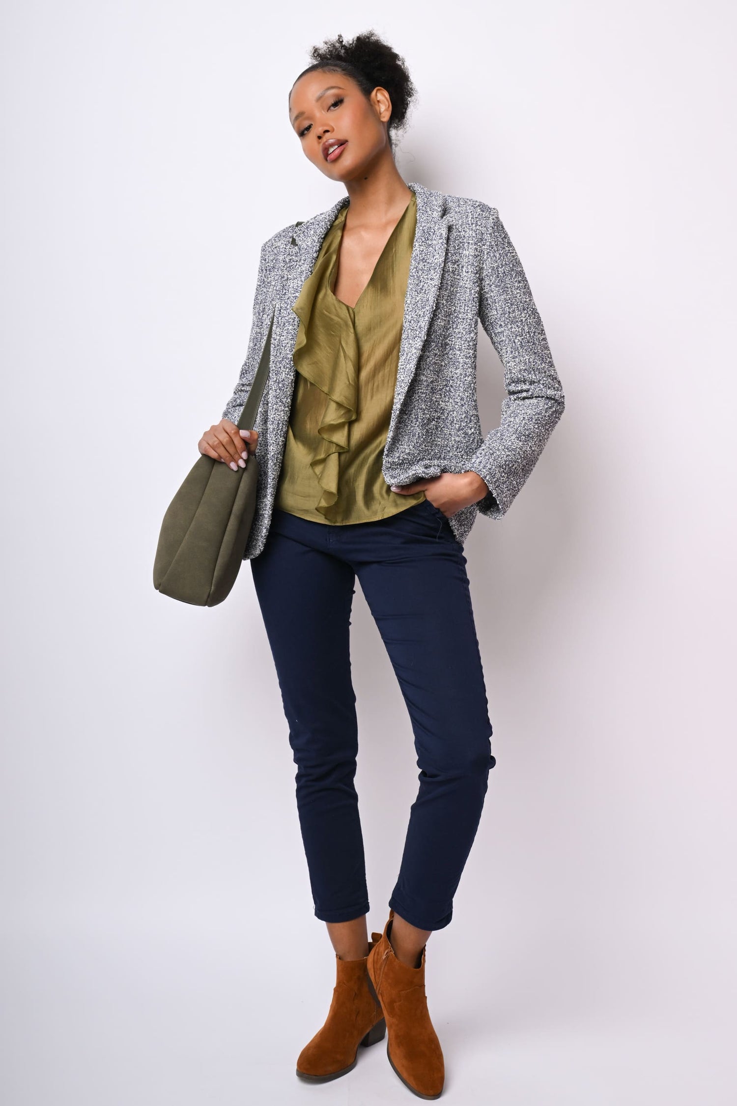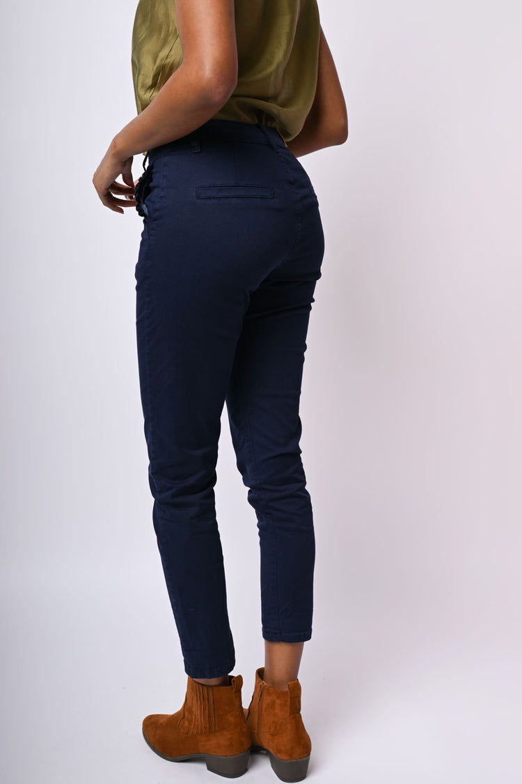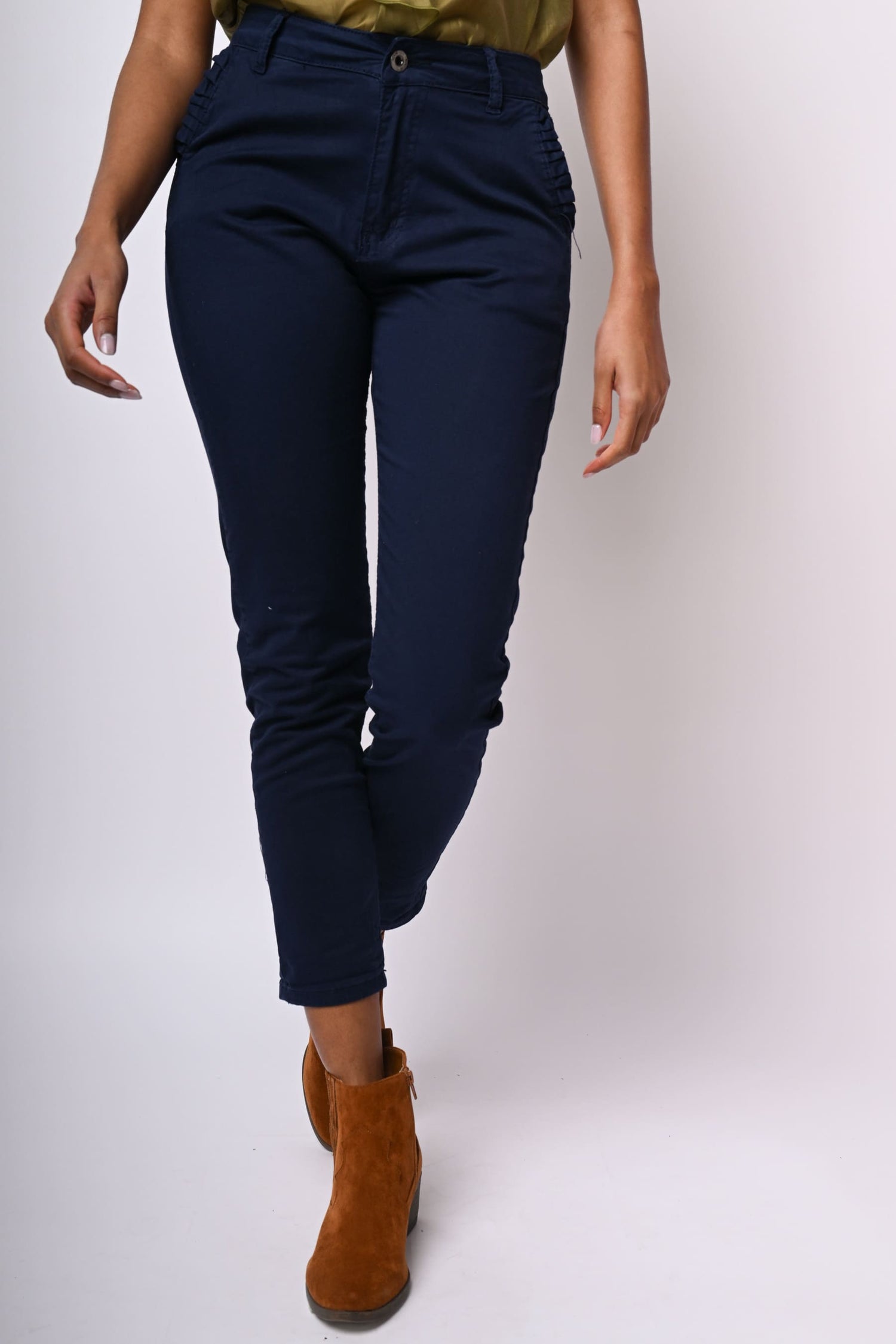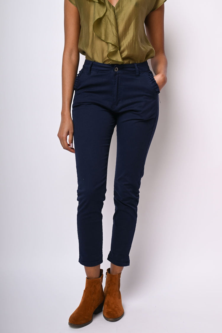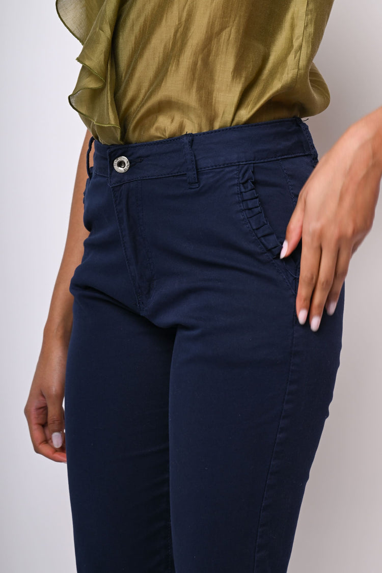 Pantaloni chino in cotone stretch blu con passanti per cintura, chiusura con bottone e zip, tasche laterali con rouches, tasche a filetto posteriori, etichetta con logo sul retro e gamba dritta con risvolto al fondo.