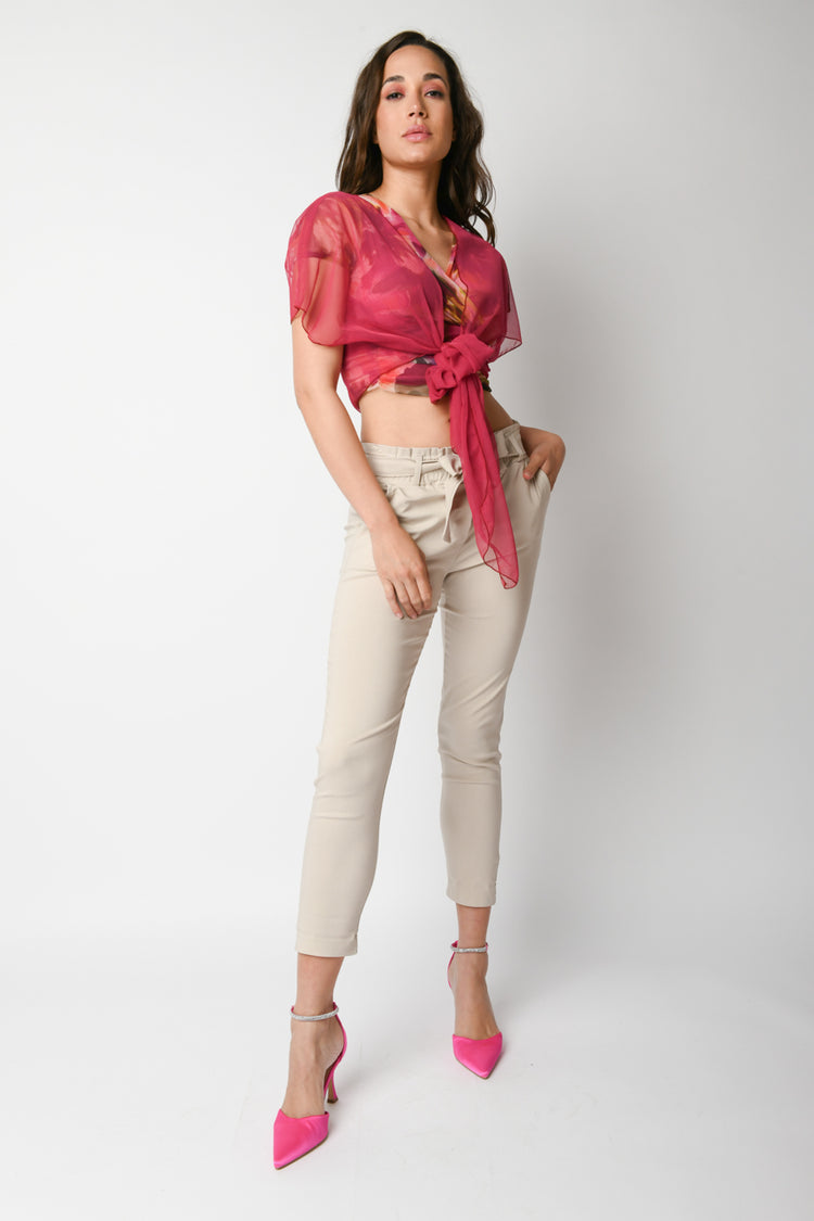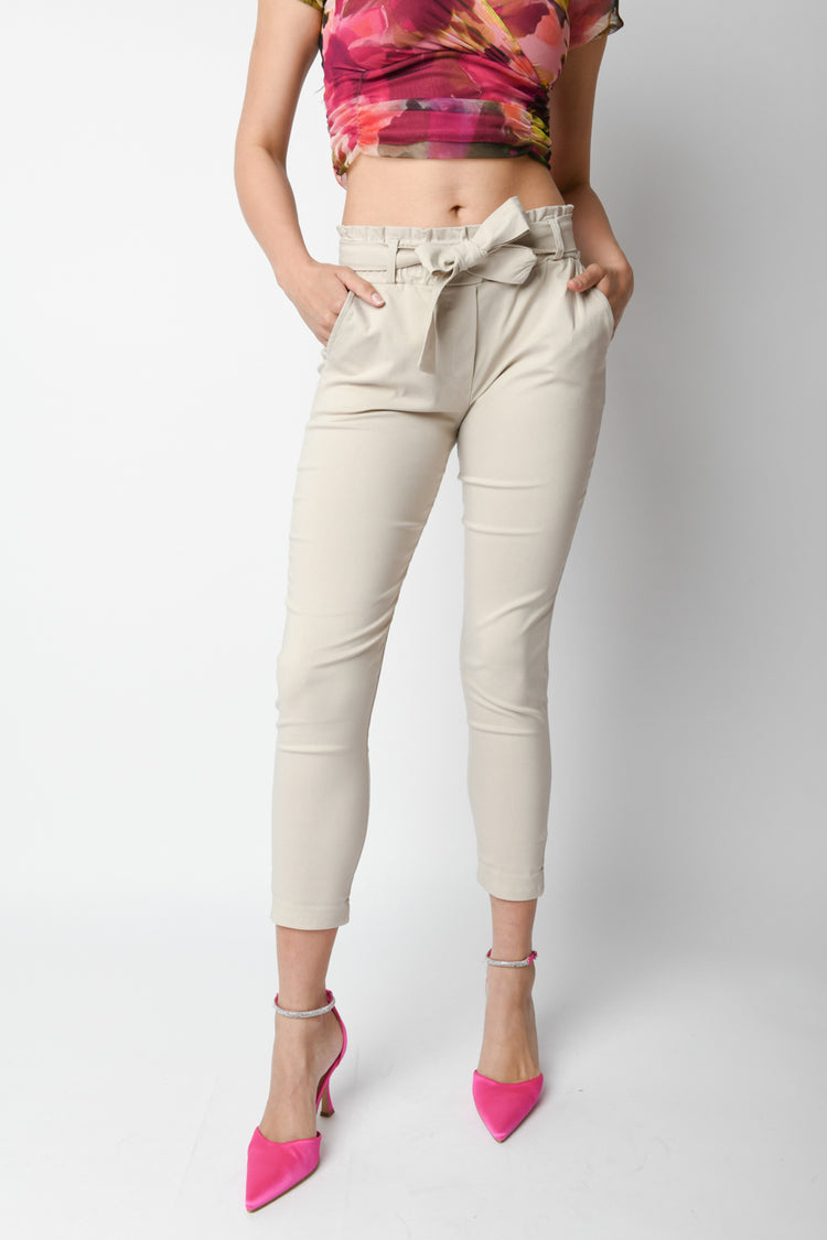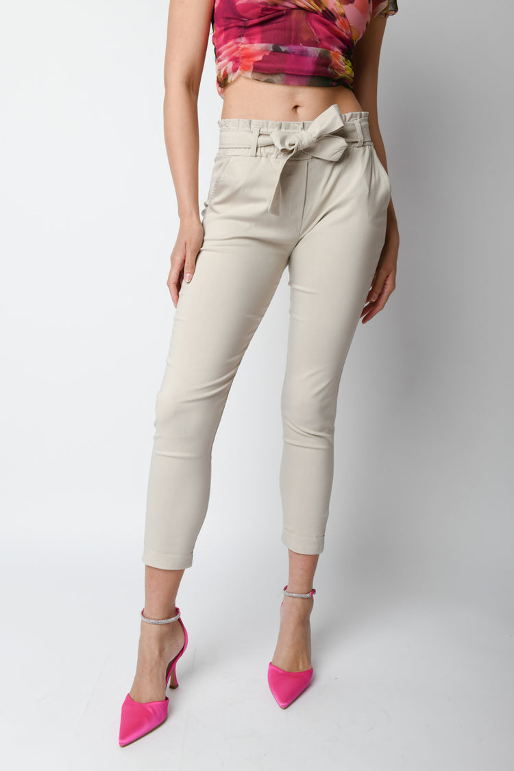 Pantaloni misto viscosa stretch beige con vita alta elasticizzata, cintura coordinata da annodare, tasche laterali, pinces frontali e gamba aderente.