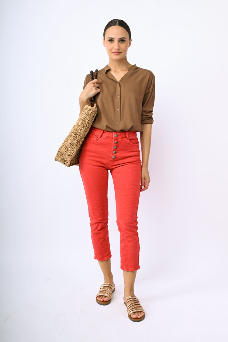 Jeans slim-fit e crop in denim stretch rosso con passanti per cintura, chiusura con bottoni argentati, taglio cinque tasche ed etichetta-logo sul retro.