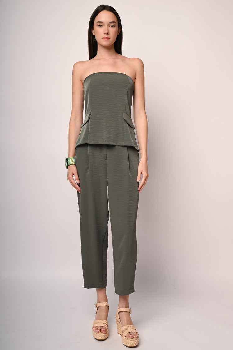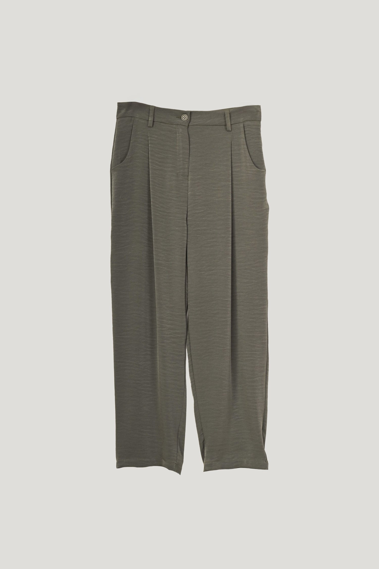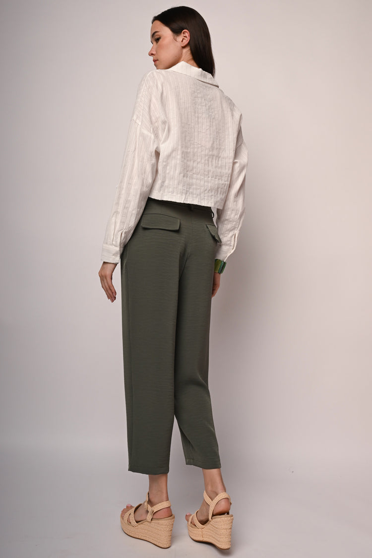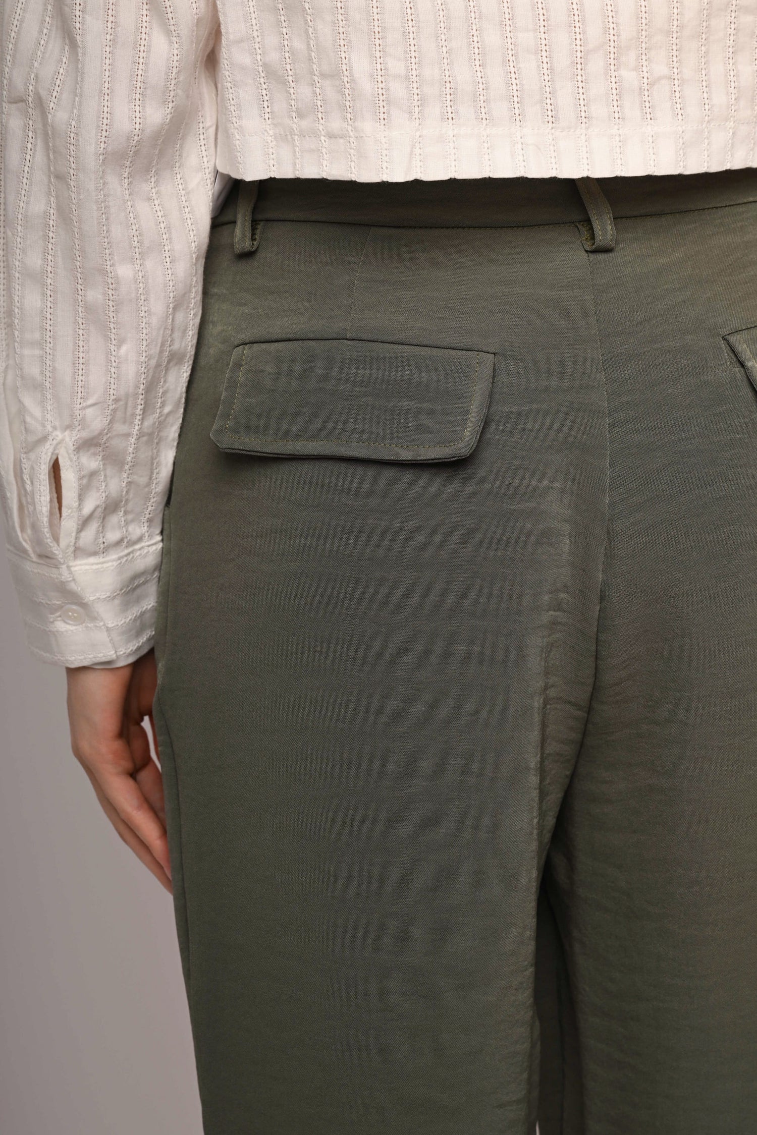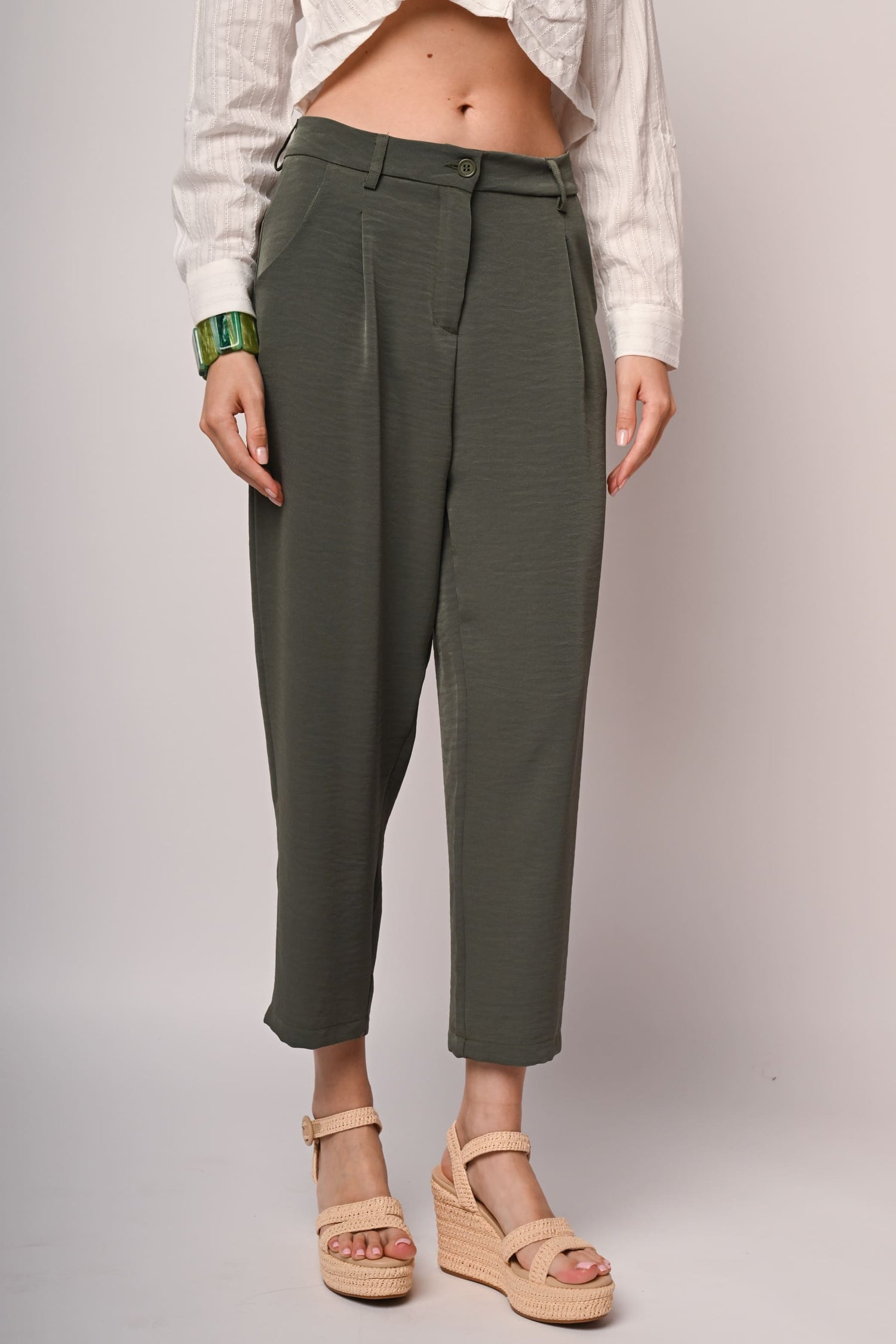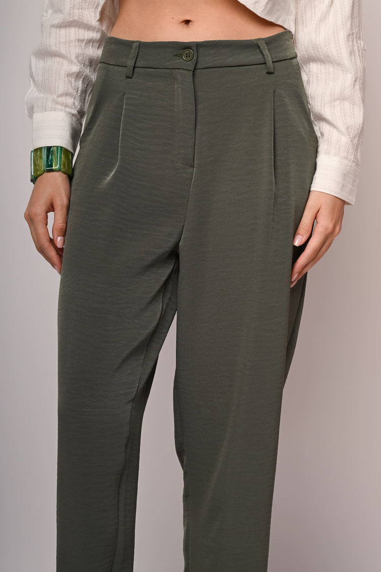 Pantaloni in tessuto verde oliva con passanti per cintura, chiusura con bottone e zip, tasche laterali, tasche posteriori con risvolto e gamba ampia e dritta con pinces frontali e piega stirata.