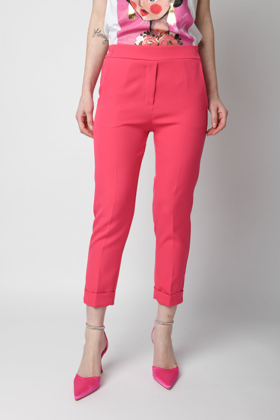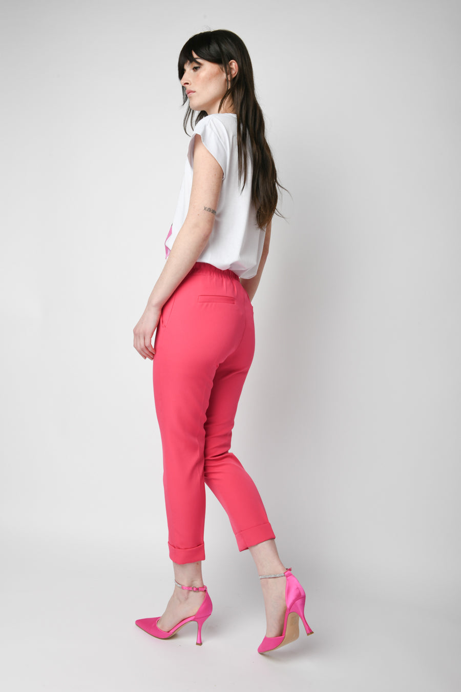 Pantaloni slim-fit in tessuto stretch fucsia con vita elasticizzata sul retro, tasche laterali, tasche a filetto sul retro, piega stirata e risvolto al fondo.