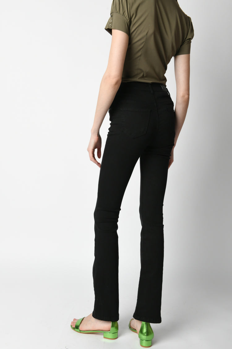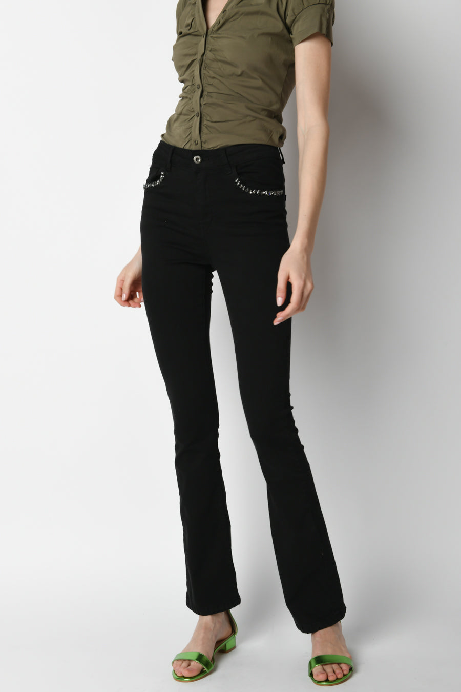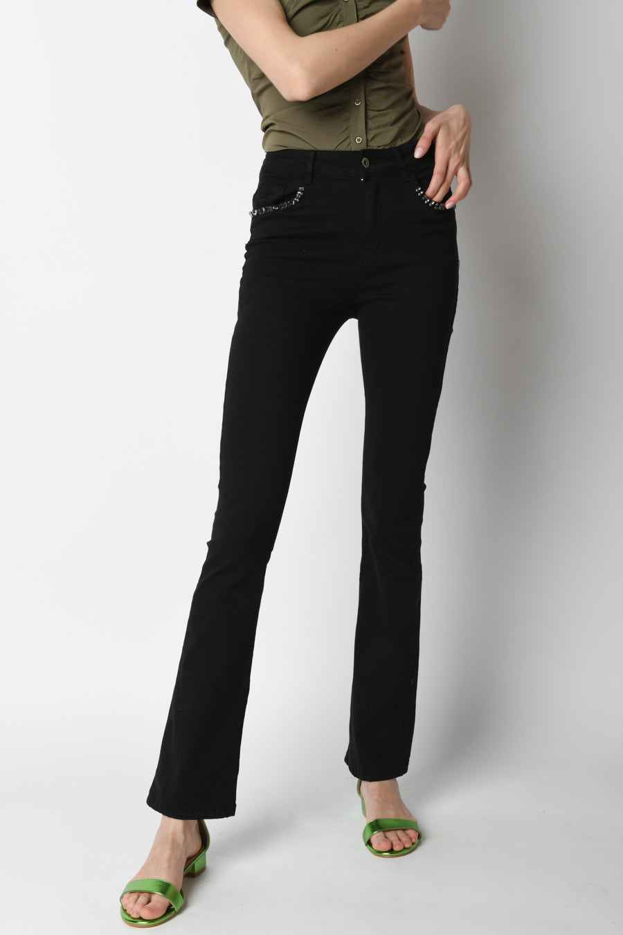 Jeans in cotone stretch nero con passanti per cintura, chiusura con bottone e zip, taglio cinque tasche, cristalli decorativi sul profilo della tasche frontali, etichetta-logo sul retro e gamba svasata.