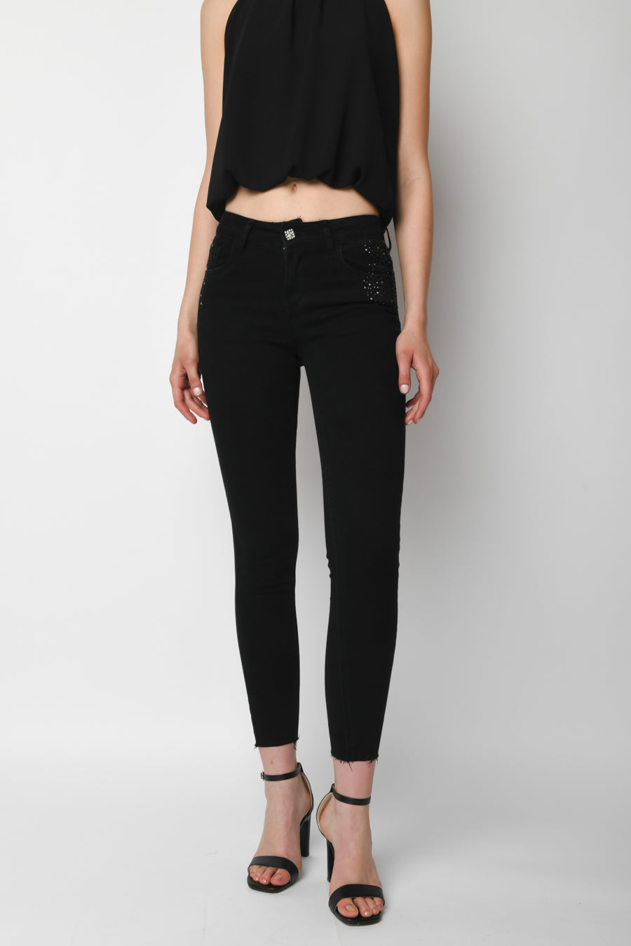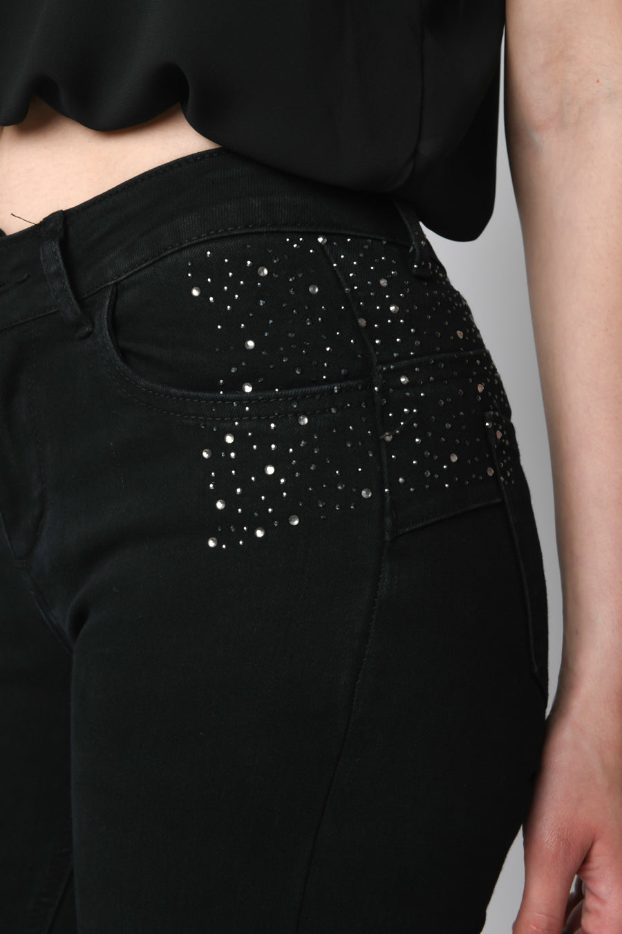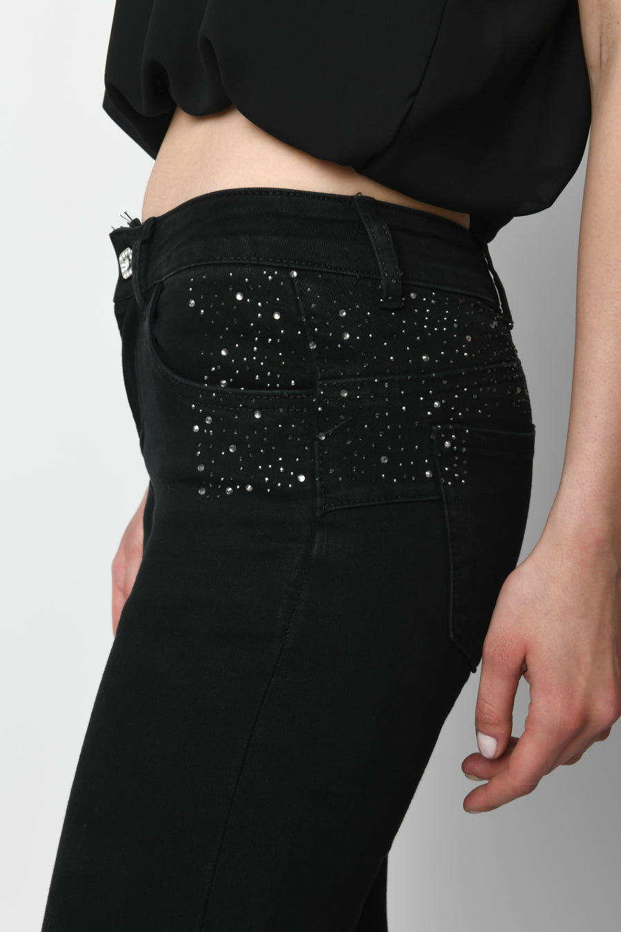 Jeans skinny in cotone stretch nero con passanti per cintura, chiusura con bottone gioiello e zip, taglio cinque tasche, strass decorativi ai lati, placca logo sulla tasca posteriore e orlo a taglio vivo.