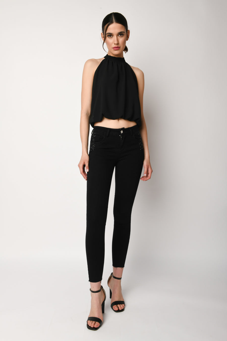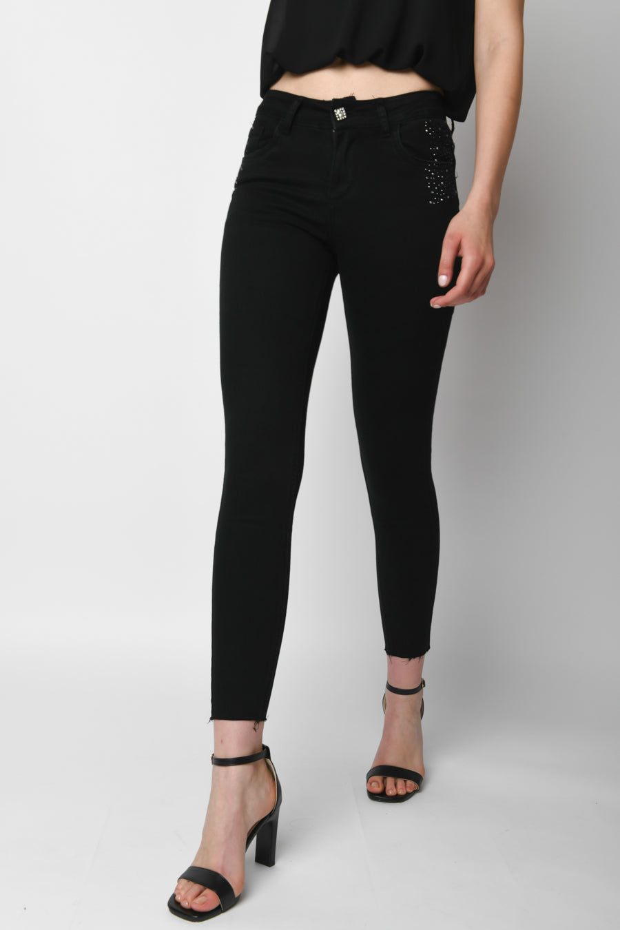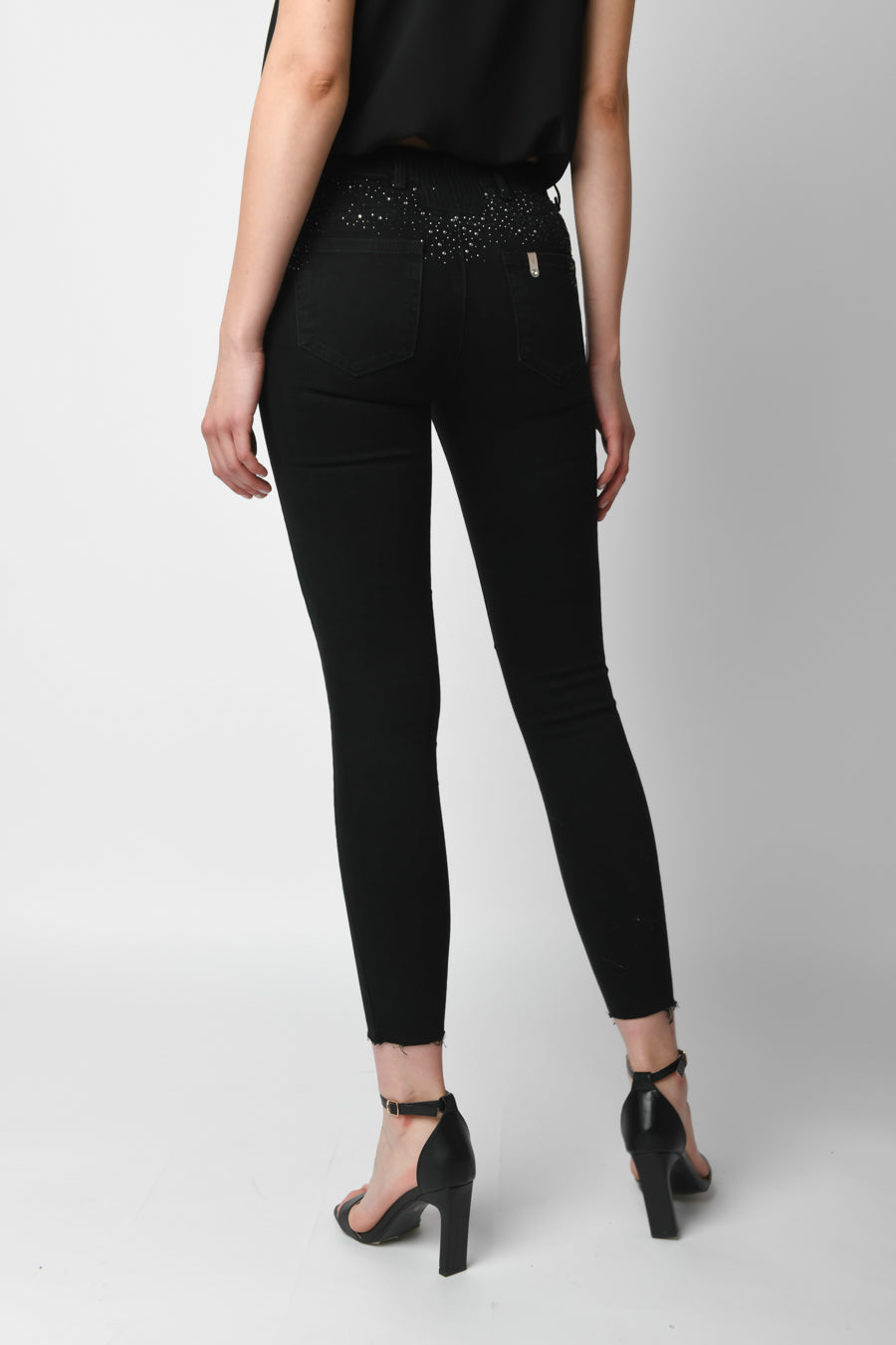 Jeans skinny in cotone stretch nero con passanti per cintura, chiusura con bottone gioiello e zip, taglio cinque tasche, strass decorativi ai lati, placca logo sulla tasca posteriore e orlo a taglio vivo.