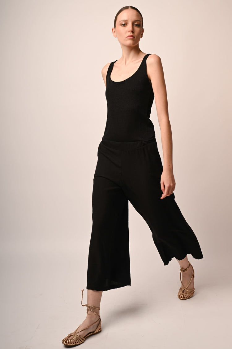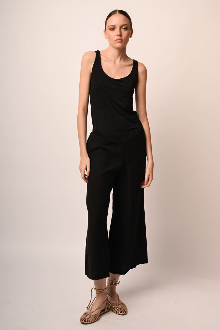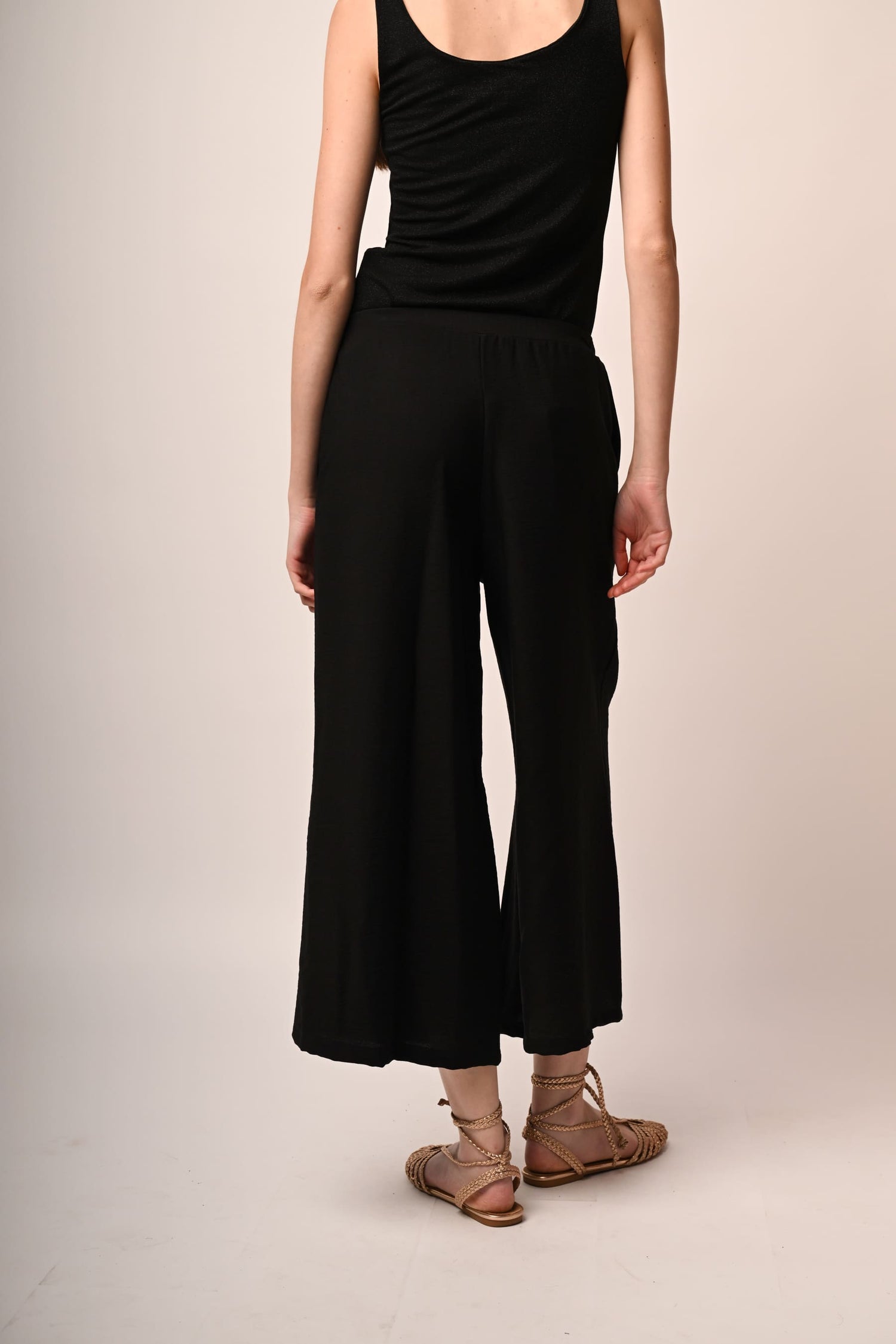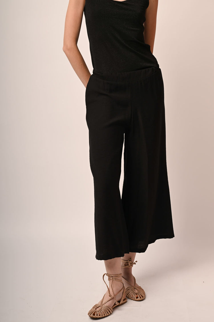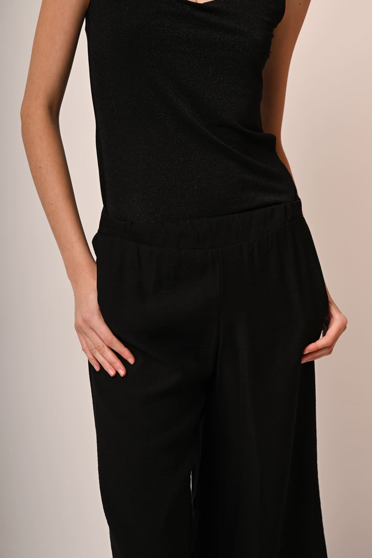 Pantaloni misto viscosa e nylon nero con vita elasticizzata, tasche laterali e gamba ampia, dritta e crop.