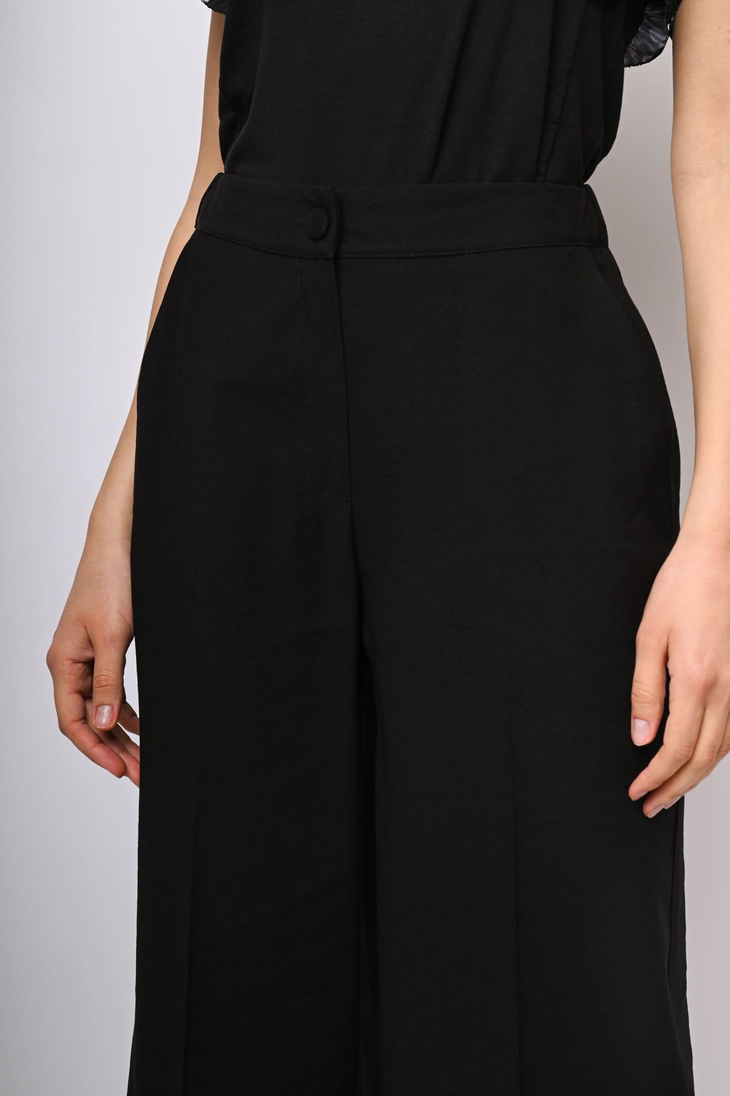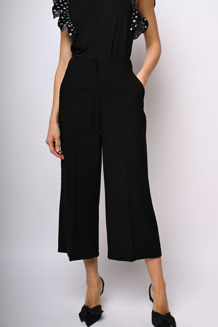 Pantaloni crop misto viscosa nero con vita elasticizzata sul retro, bottone e zip di chiusura, tasche laterali, gamba ampia con piega stirata e tasche posteriori a filetto.