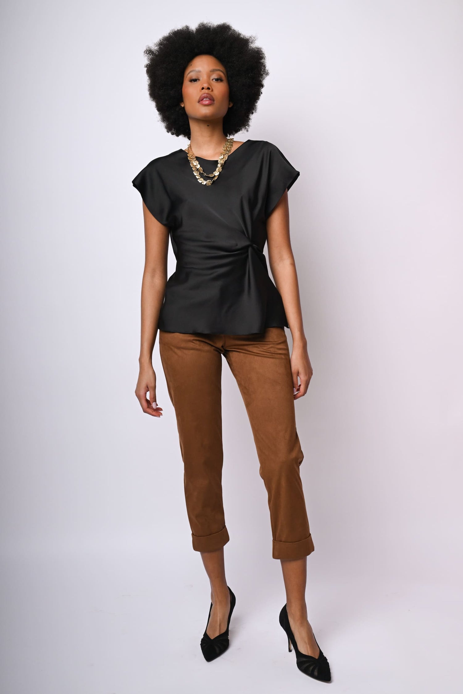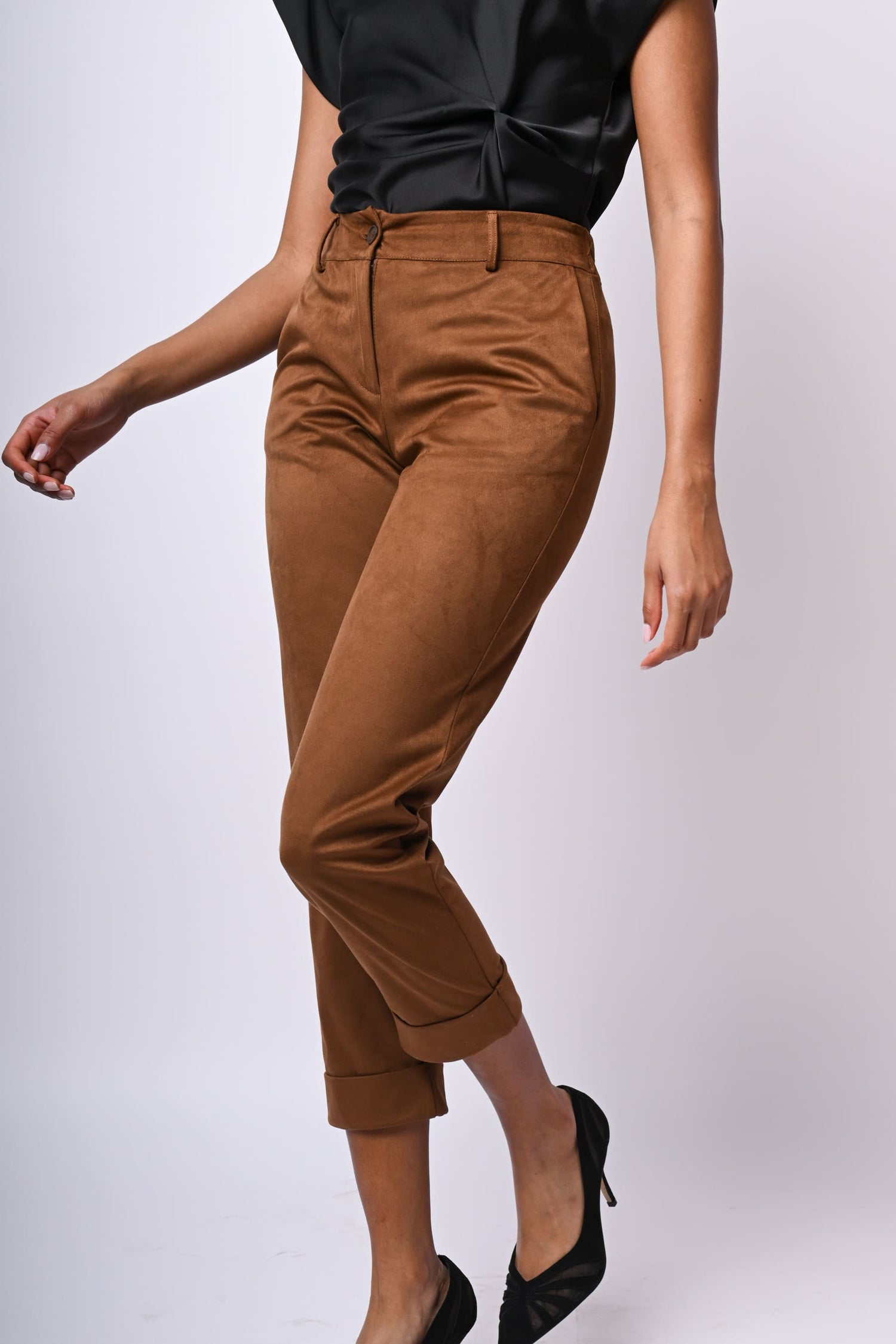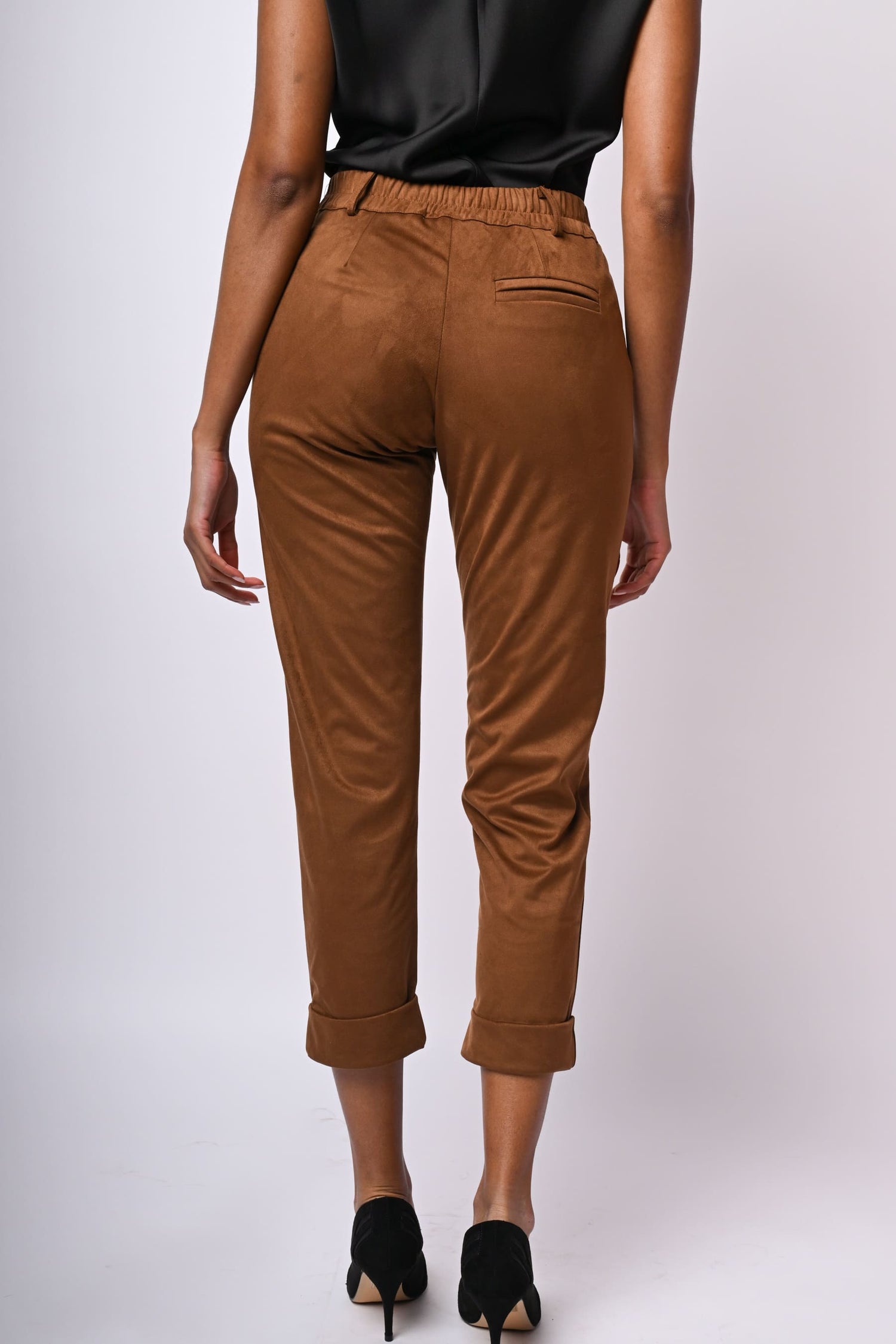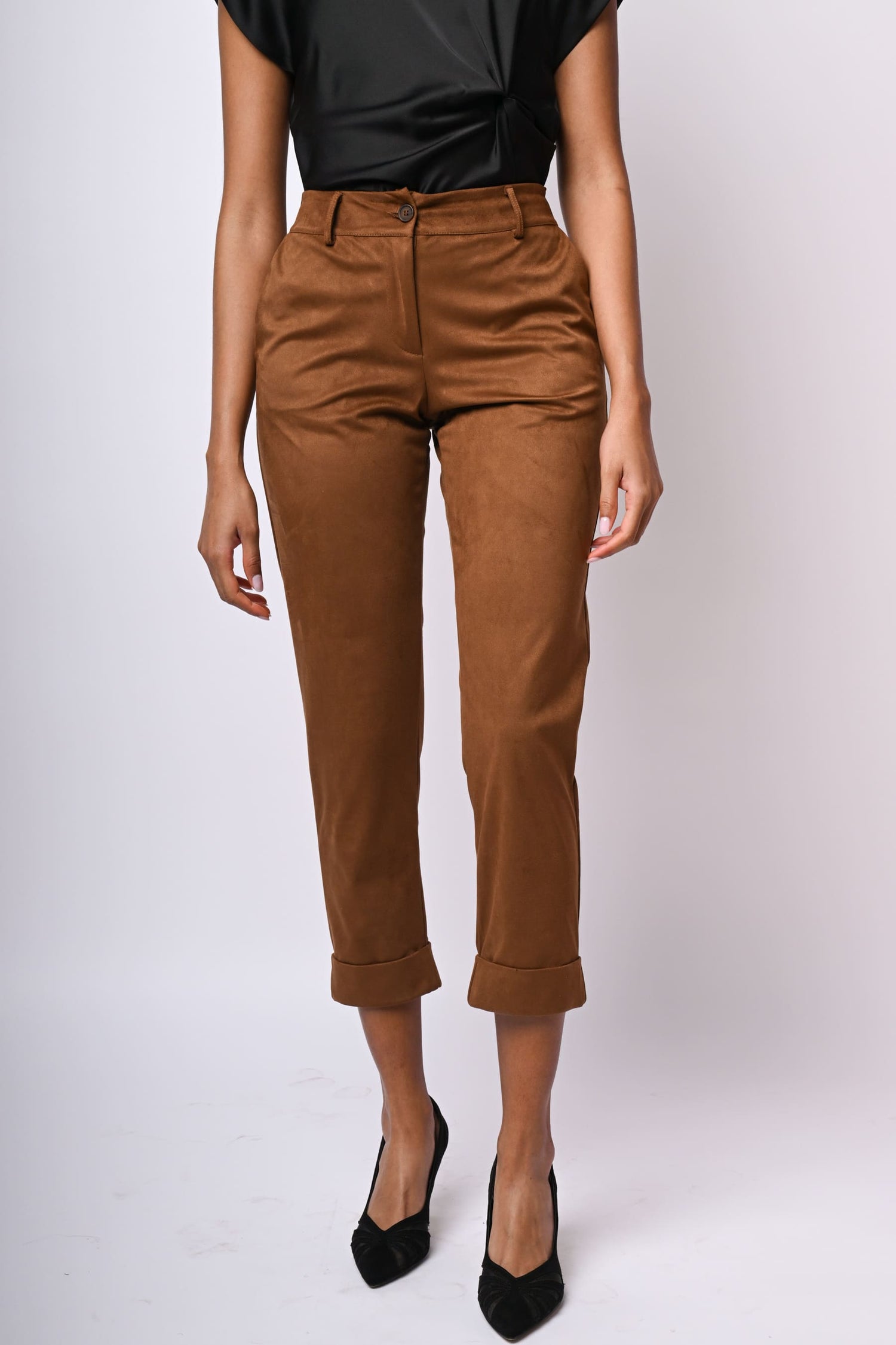 Pantaloni in similpelle scamosciata stretch color cuoio con vita elasticizzata sul retro, passanti per cintura, chiusura con bottone e zip, tasche laterali, tasca posteriore a filetto, gamba dritta e leggermente crop con risvolto.