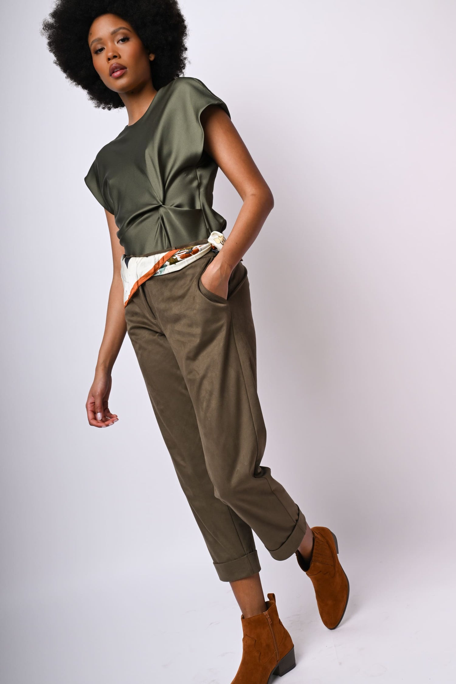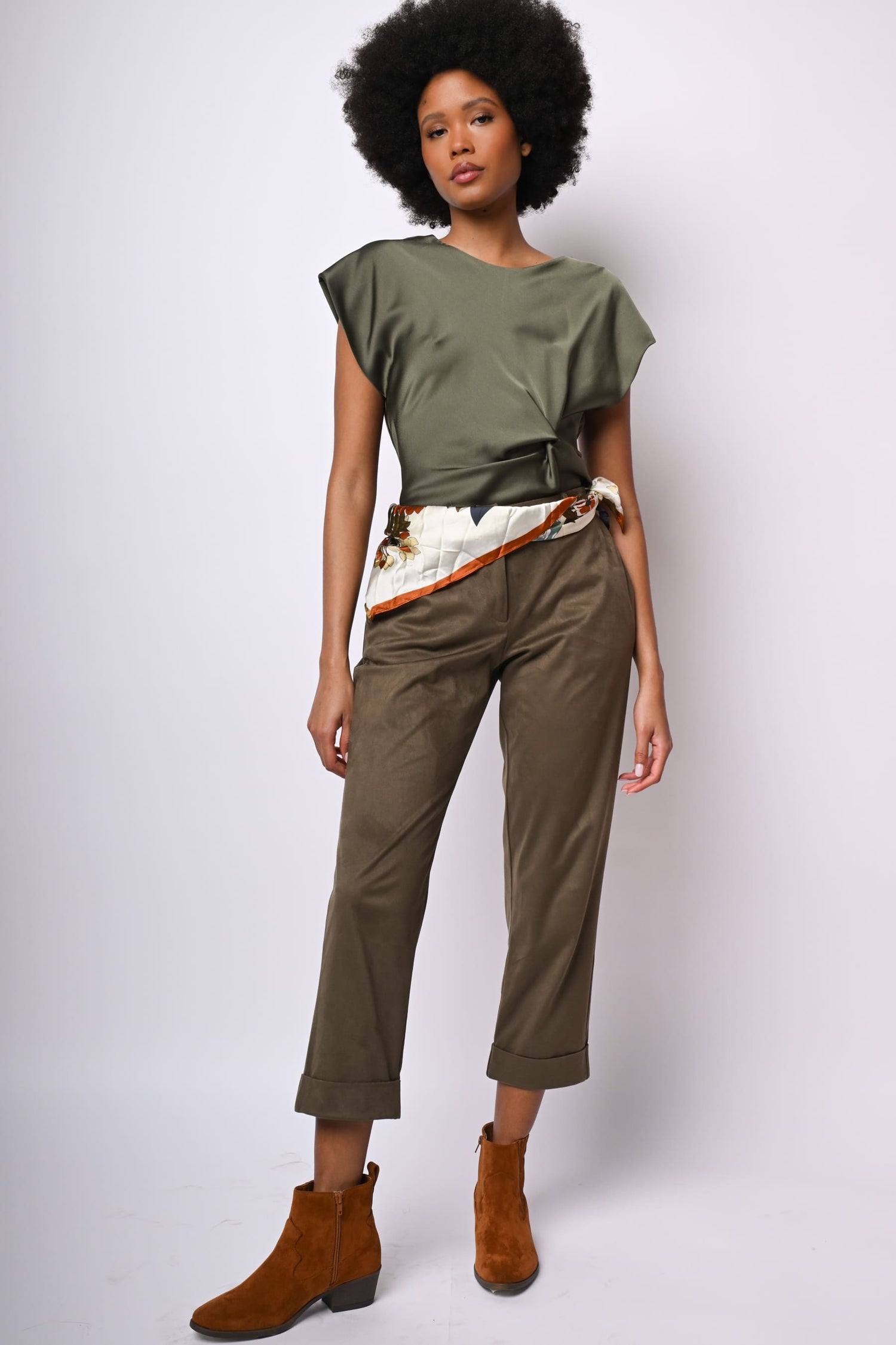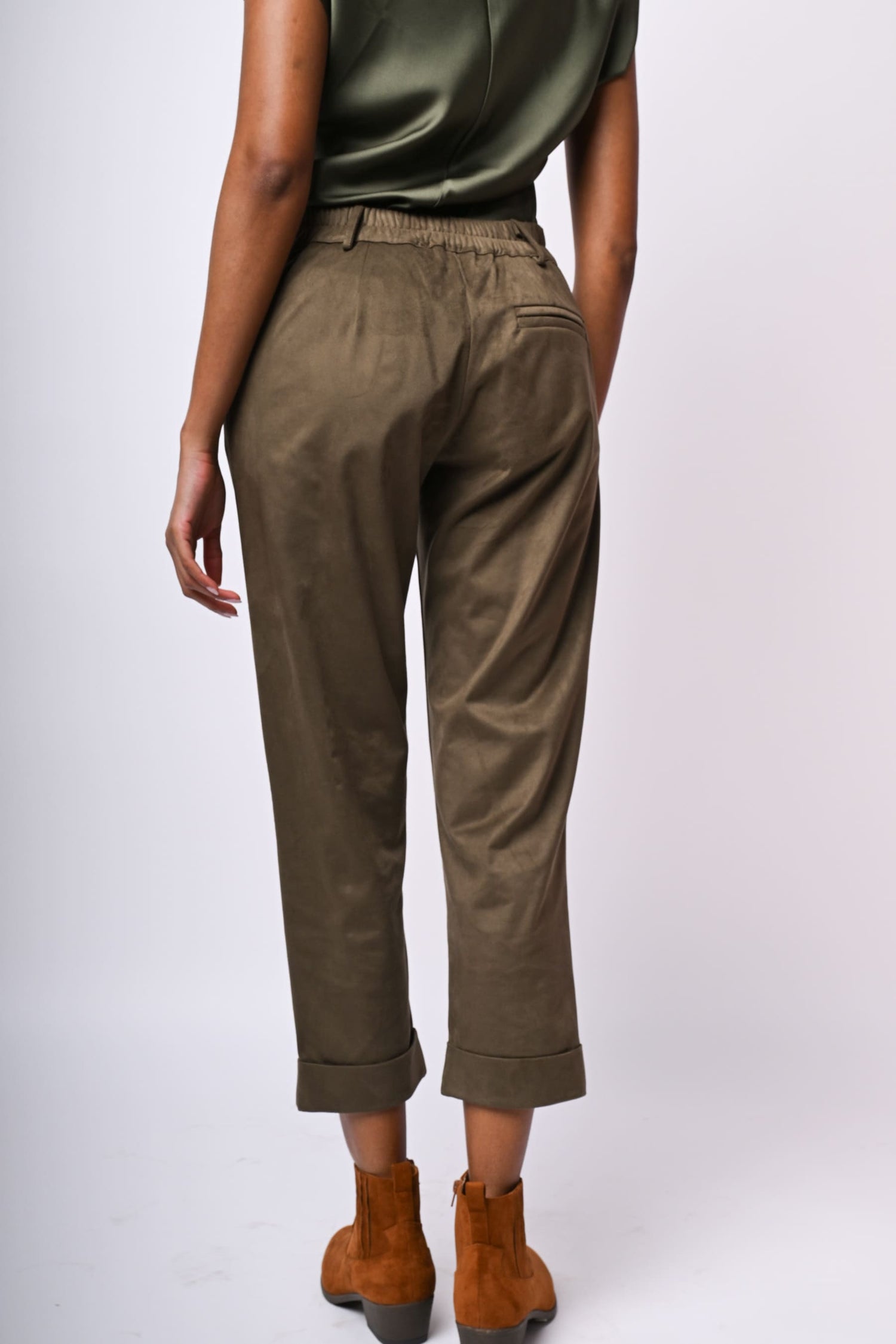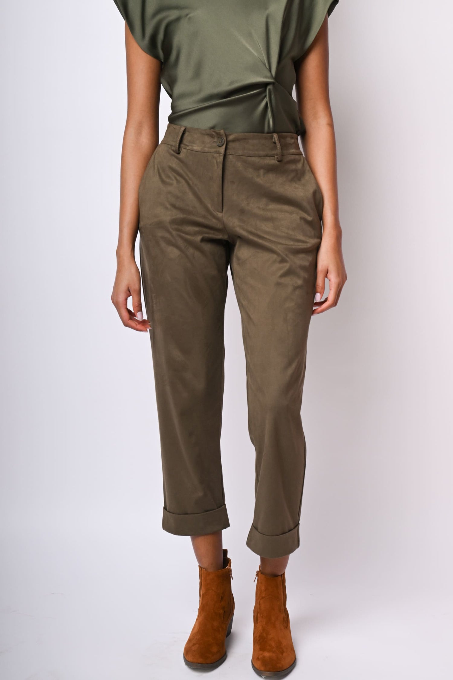 Pantaloni in similpelle scamosciata stretch verde militare con vita elasticizzata sul retro, passanti per cintura, chiusura con bottone e zip, tasche laterali, tasca posteriore a filetto, gamba dritta e leggermente crop con risvolto.