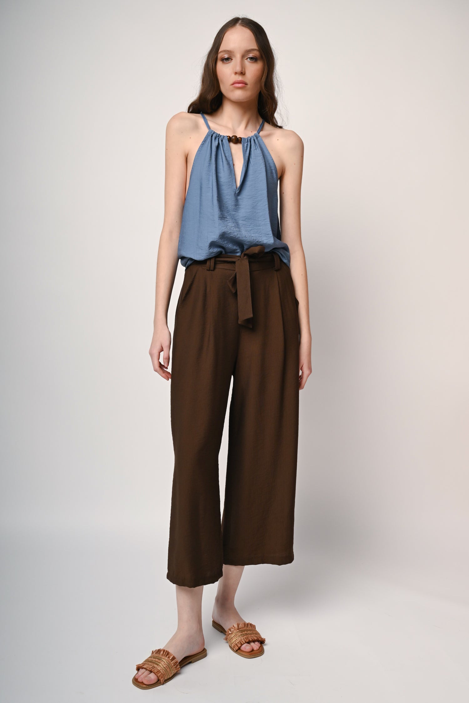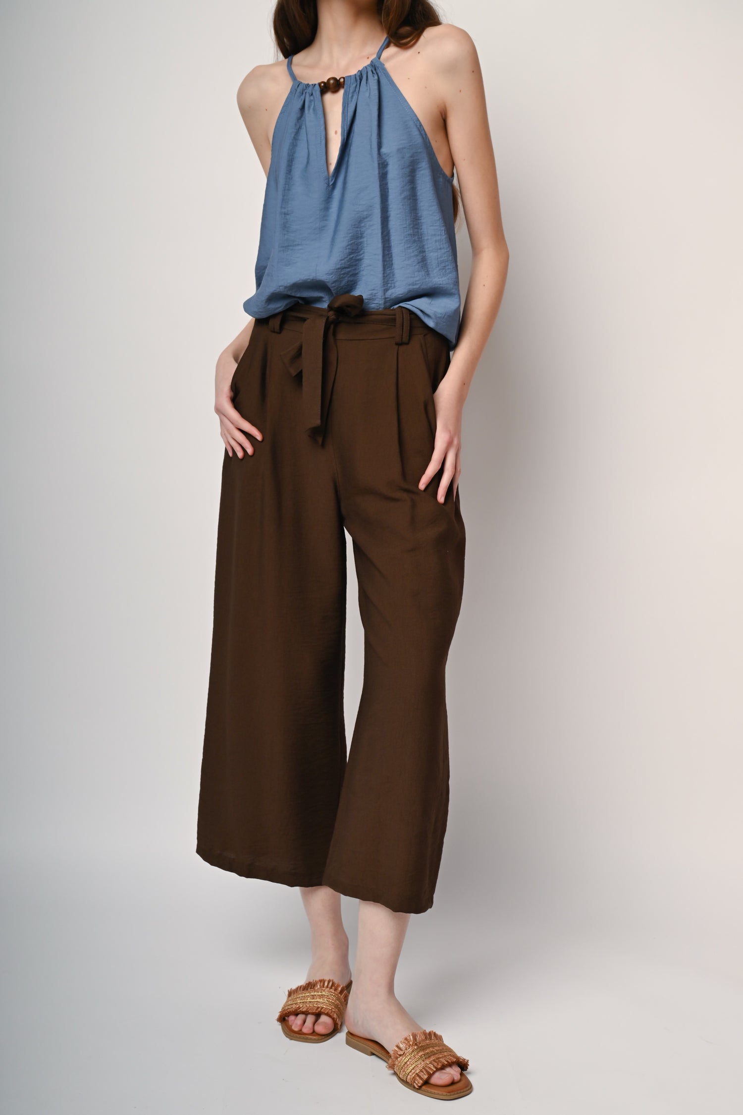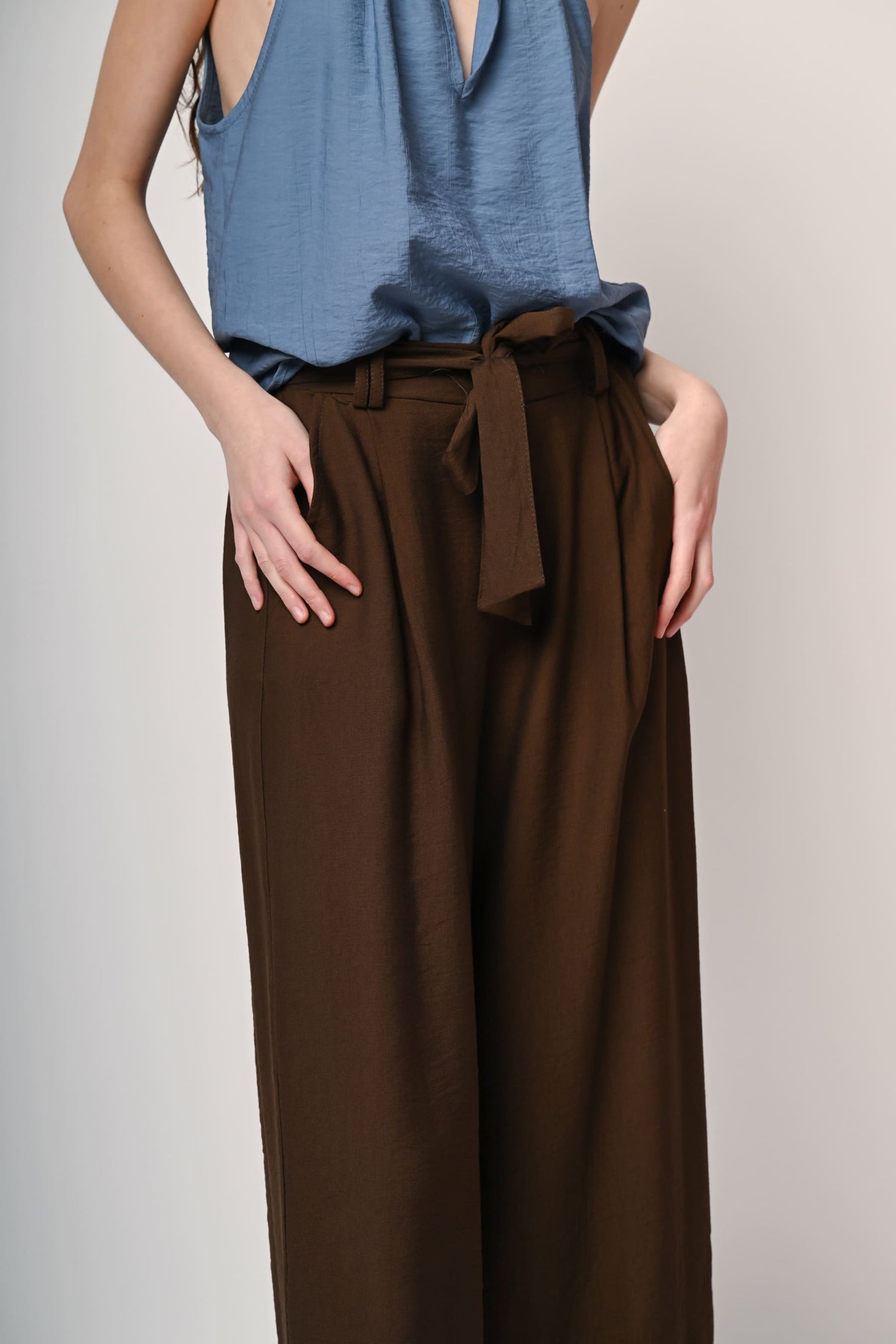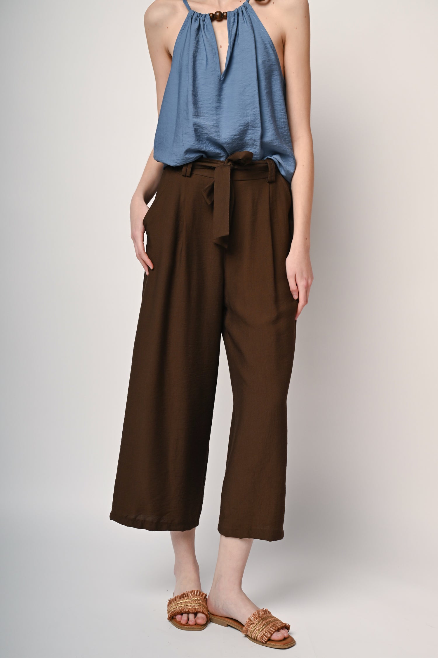 Pantaloni crop a gamba ampia e morbida in misto viscosa marrone con vita elasticizzata sul retro, cintura coordinata da annodare, tasche laterali e pinces frontali.