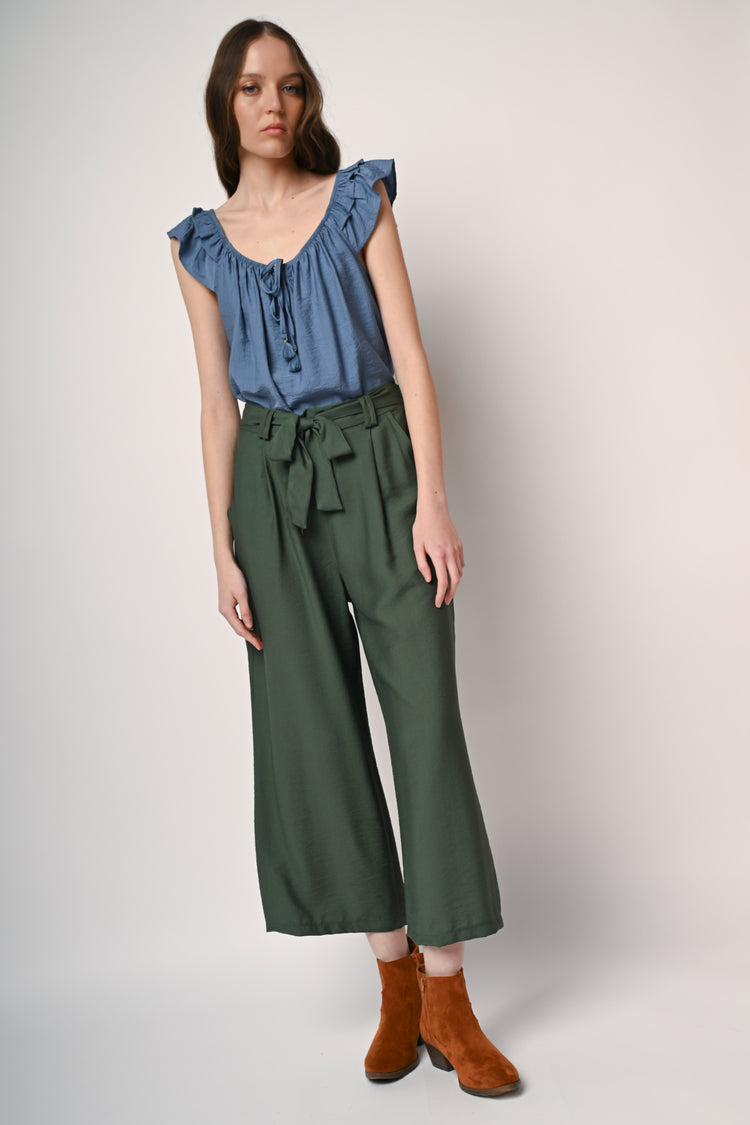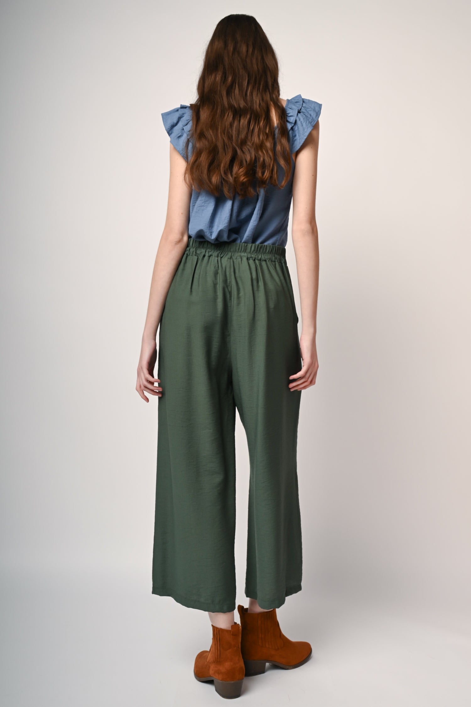 Pantaloni crop a gamba ampia e morbida in misto viscosa verde con vita elasticizzata sul retro, cintura coordinata da annodare, tasche laterali e pinces frontali.
