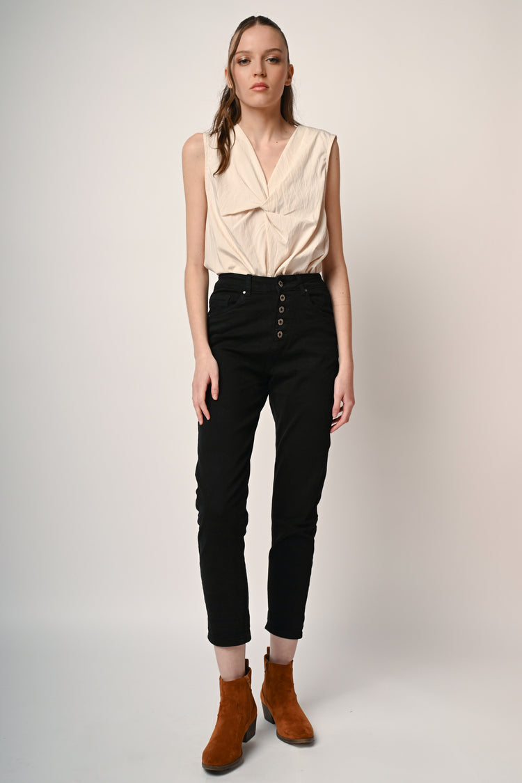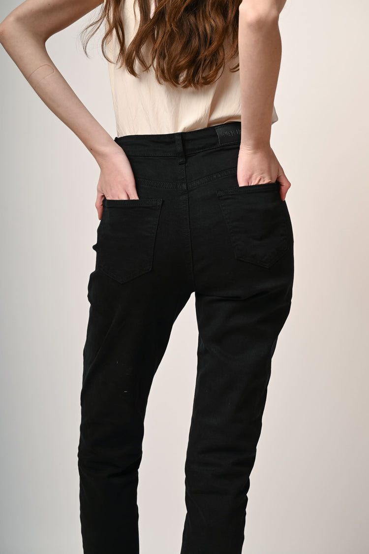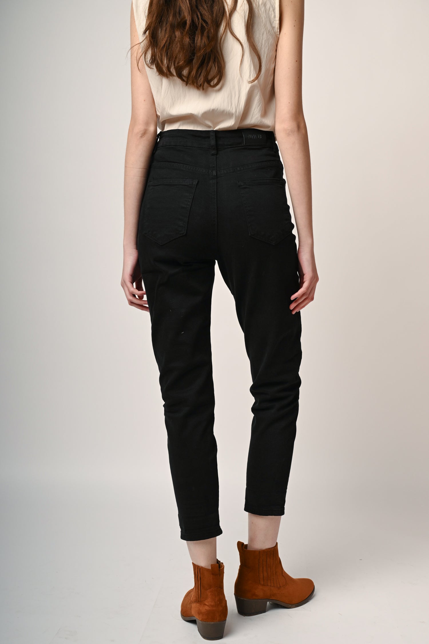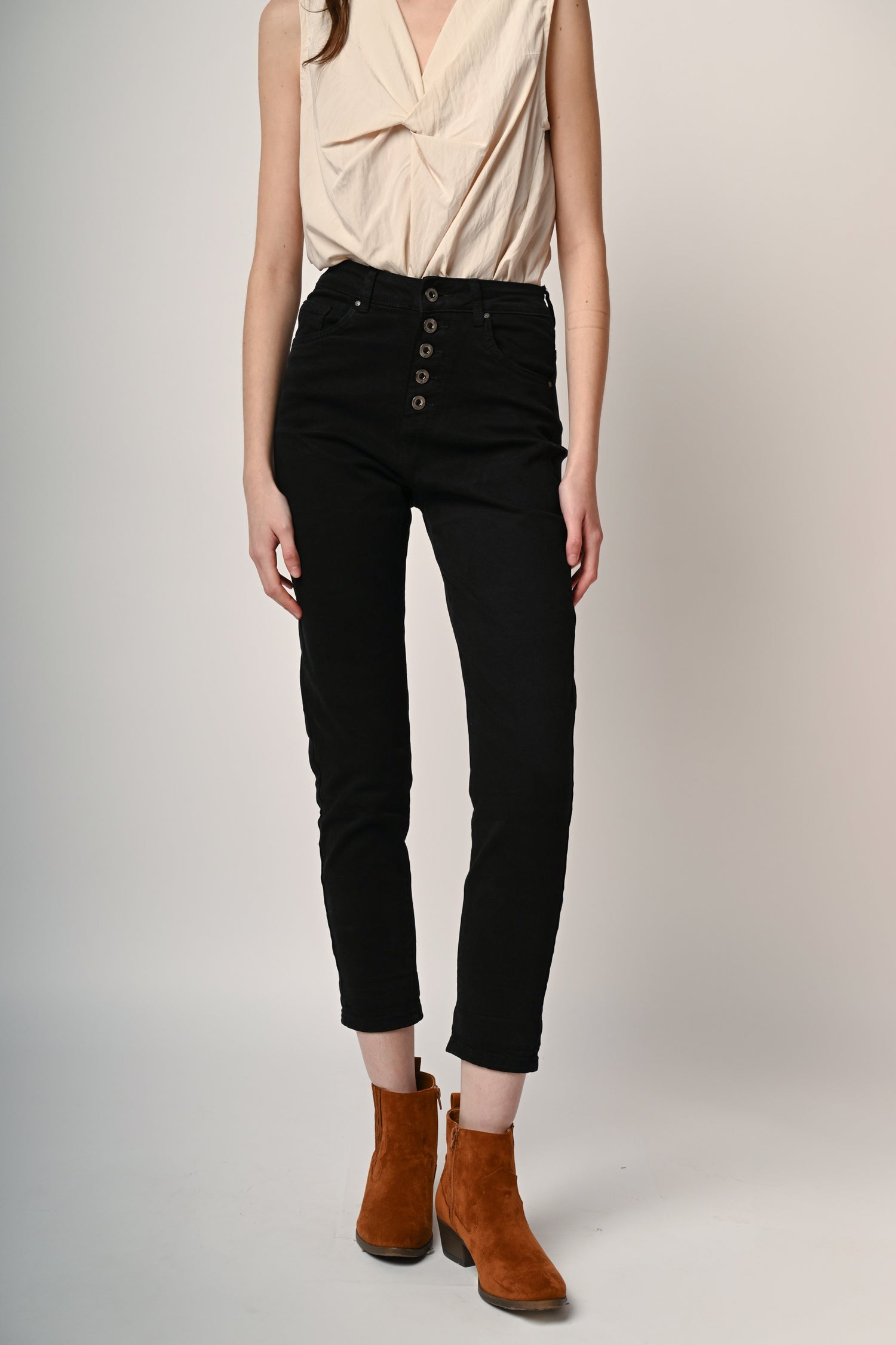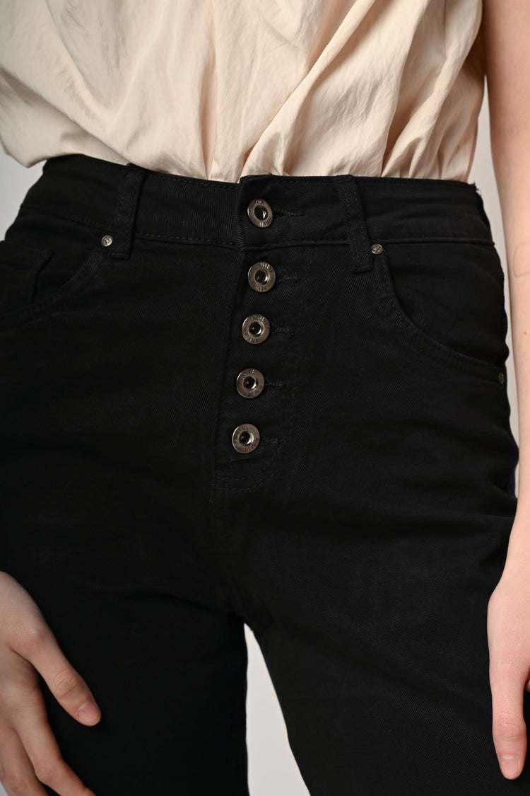 Pantaloni in drill di cotone stretch nero con passanti per cintura, chiusura con bottoni, taglio cinque tasche, etichetta con logo sul retro e gamba dritta, leggermente crop con risvolto allorlo.