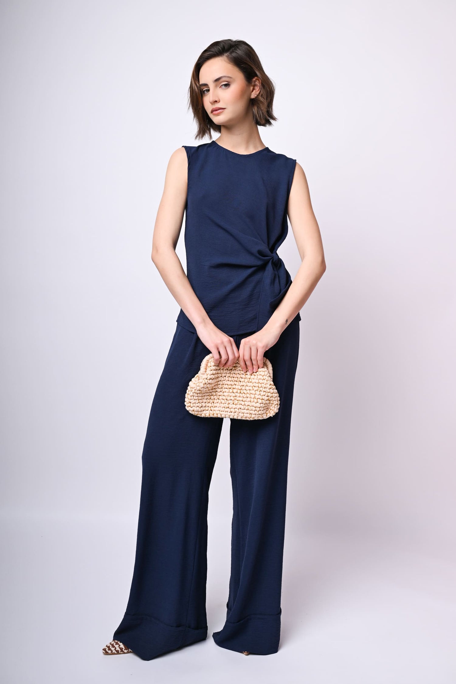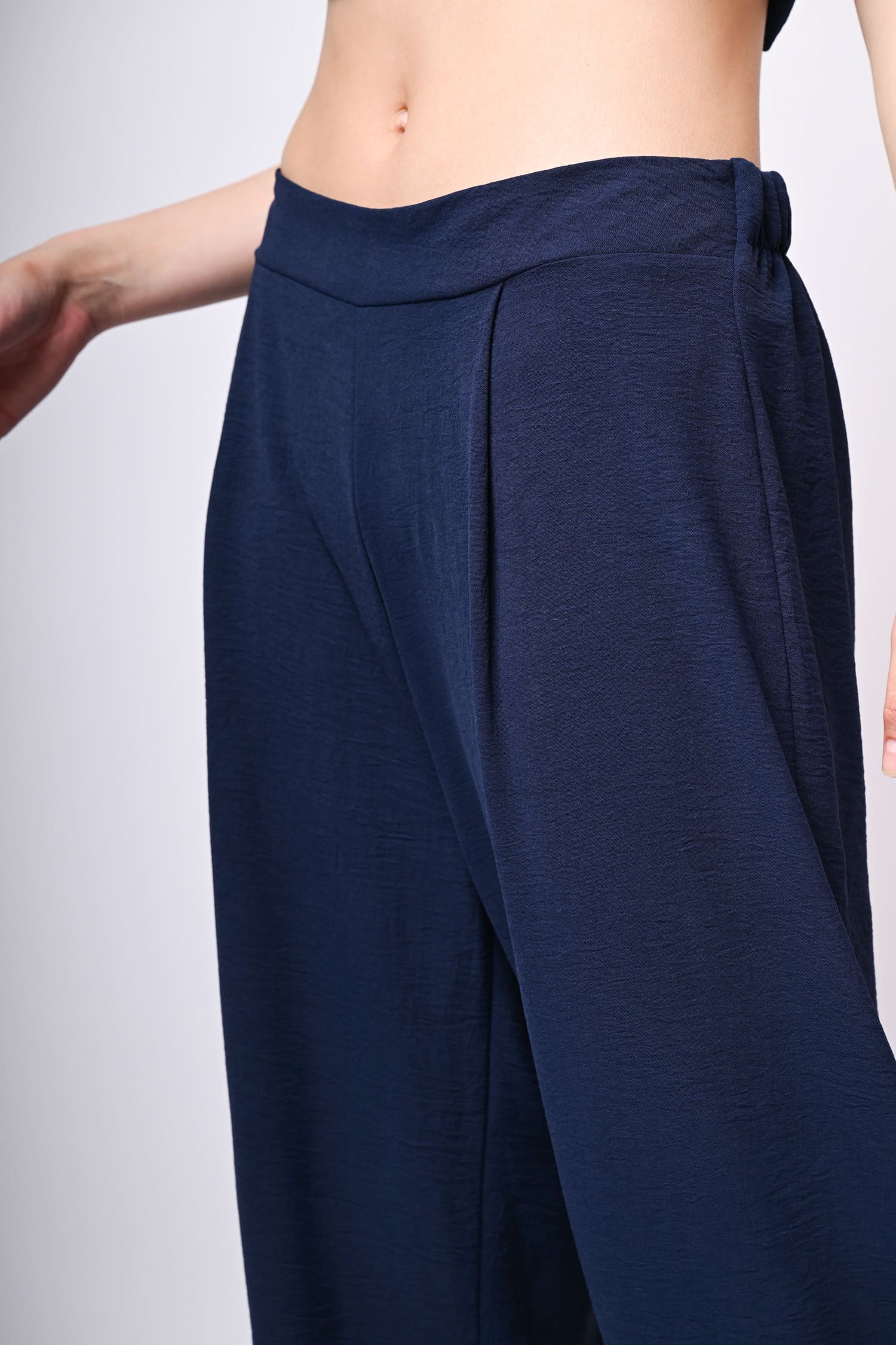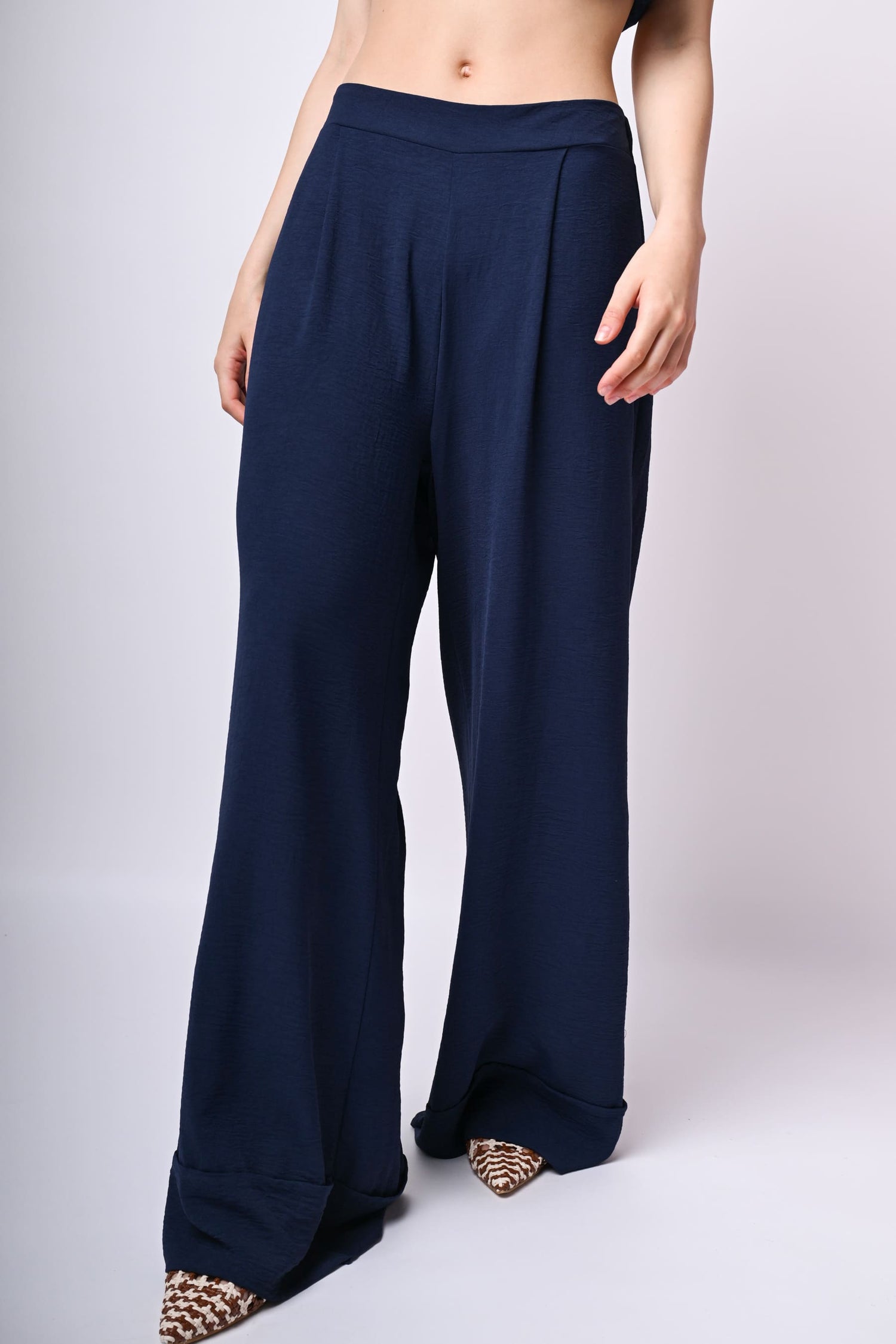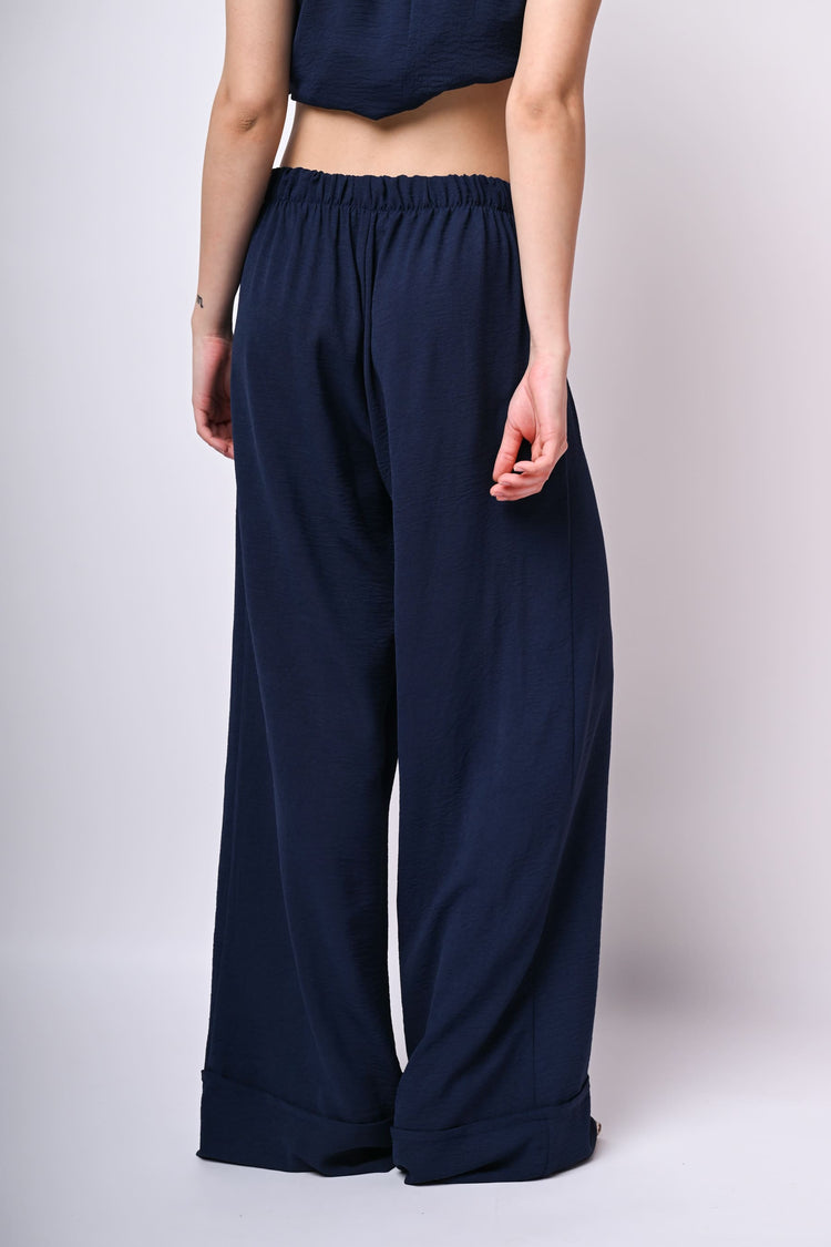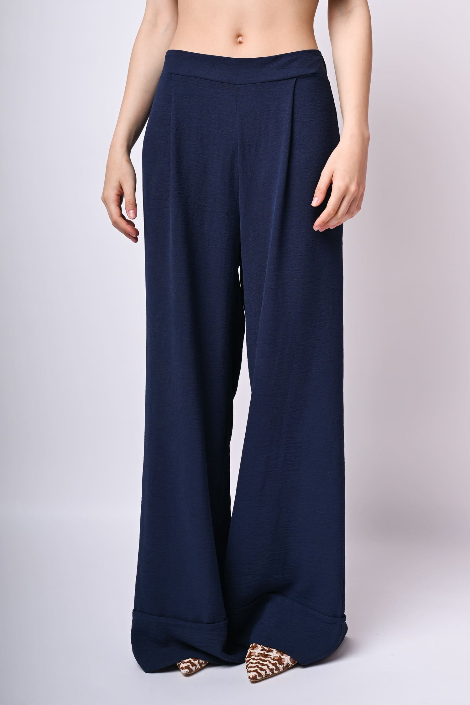 Pantaloni palazzo in tessuto blu con vita elasticizzata sul retro, pieghe sul davanti e risvolto al fondo.