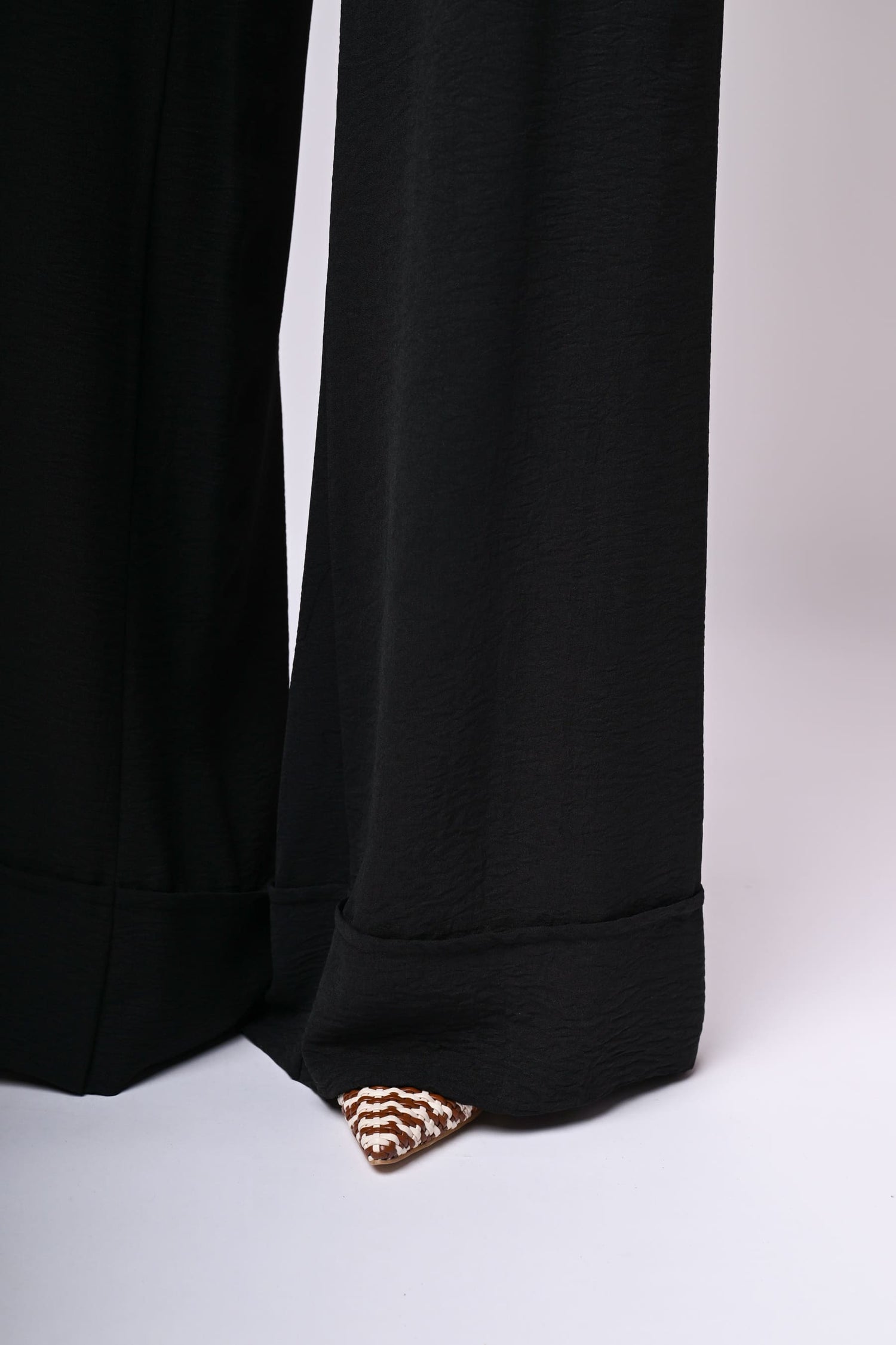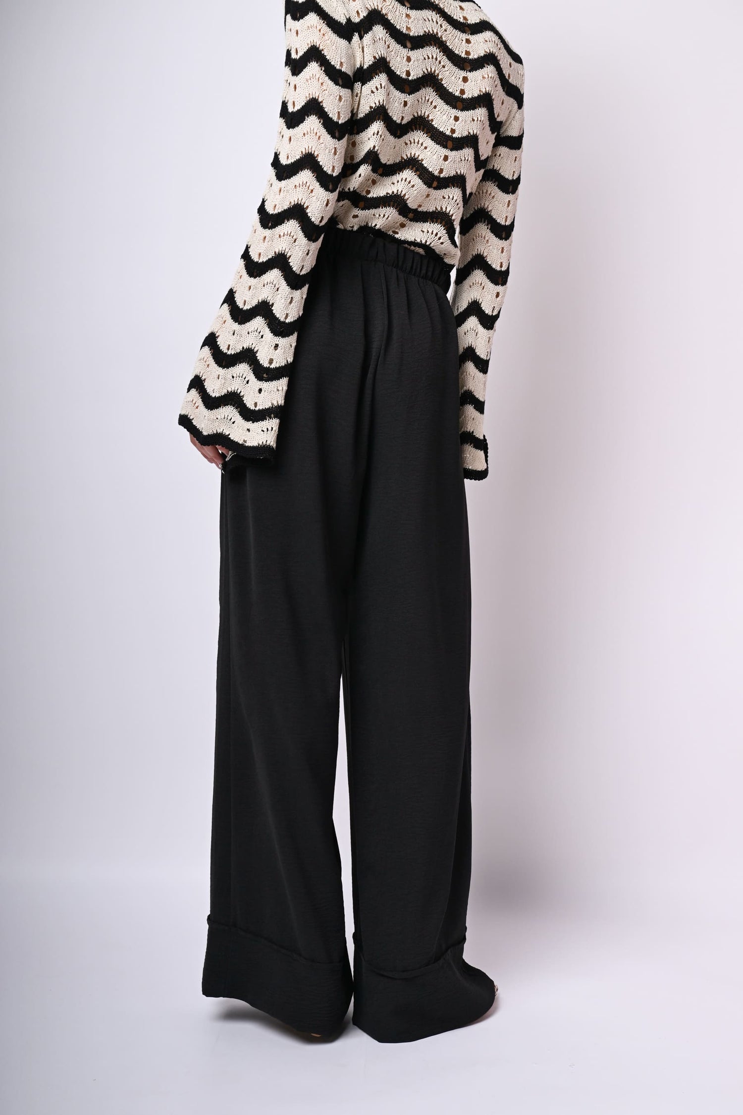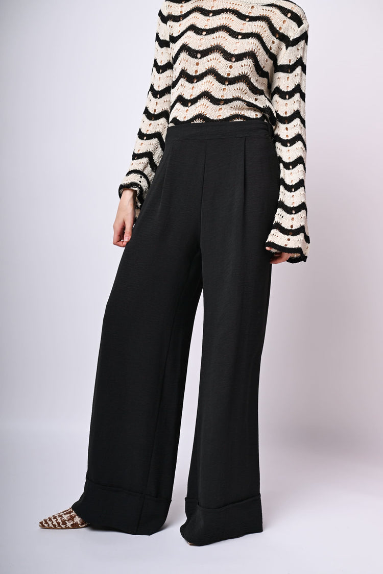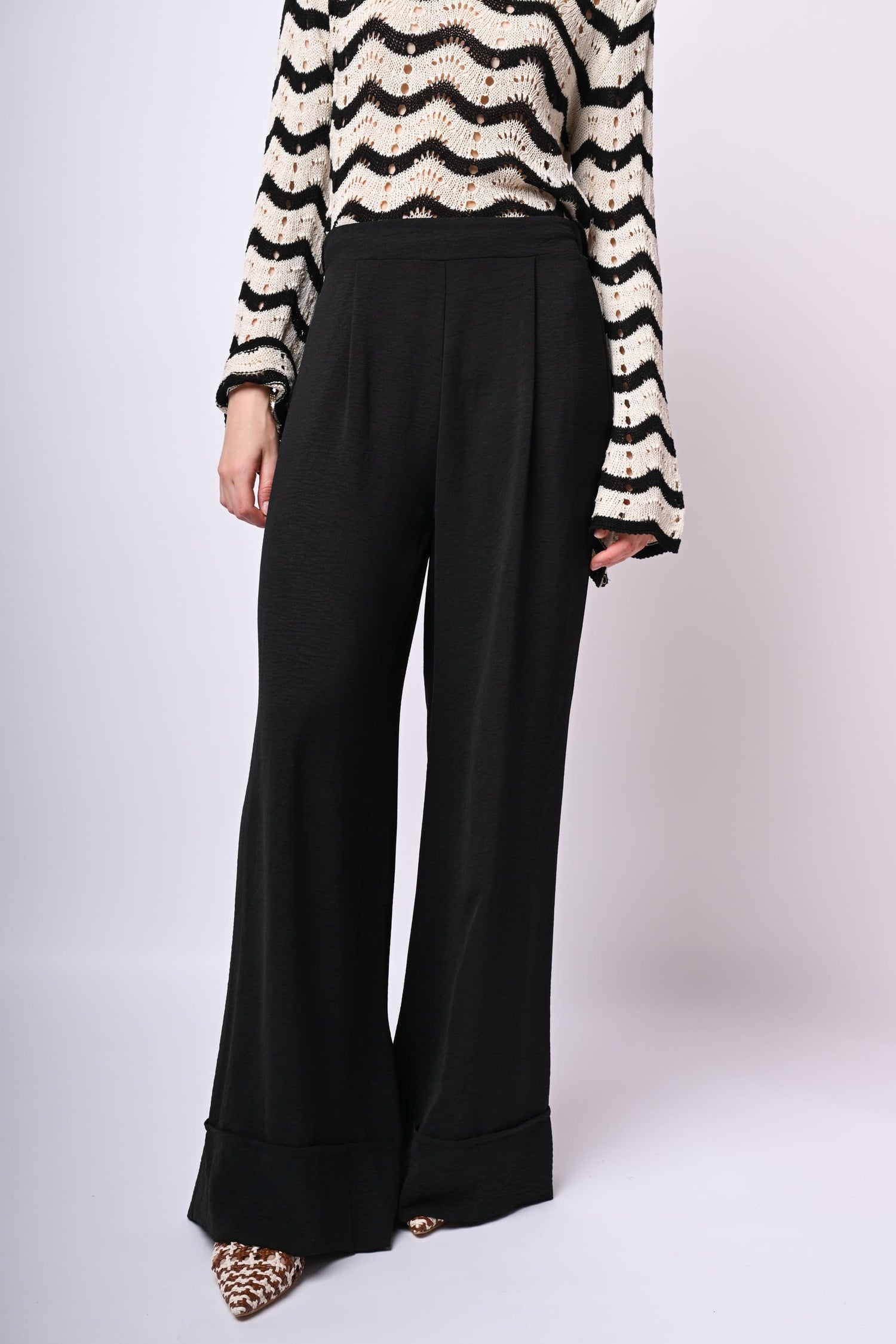 Pantaloni palazzo in tessuto nero con vita elasticizzata sul retro, pieghe sul davanti e risvolto al fondo.