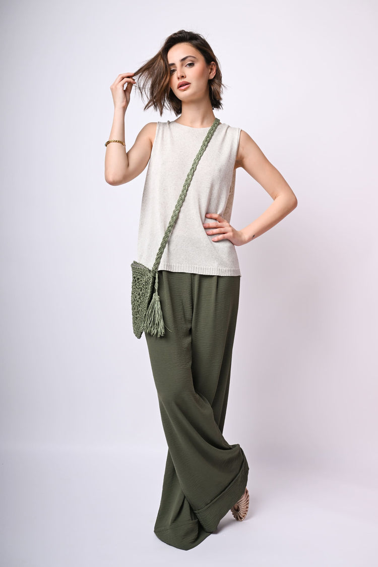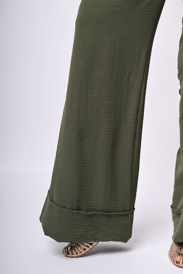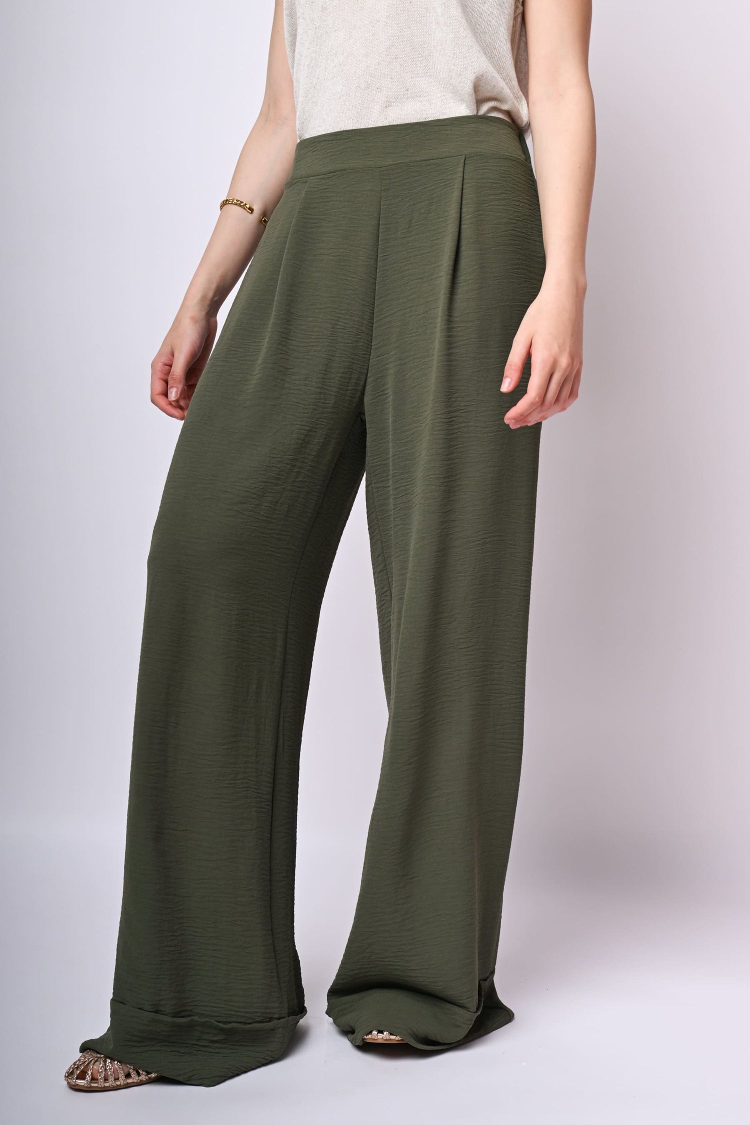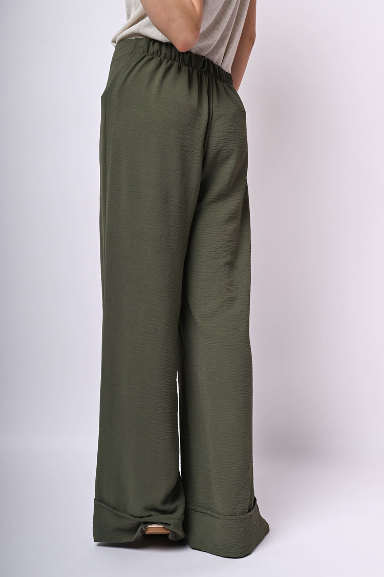 Pantaloni palazzo in tessuto verde oliva con vita elasticizzata sul retro, pieghe sul davanti e risvolto al fondo.