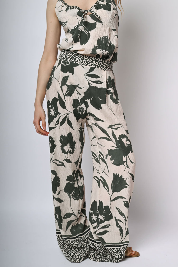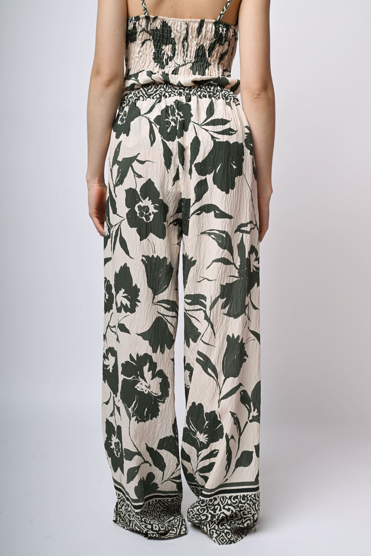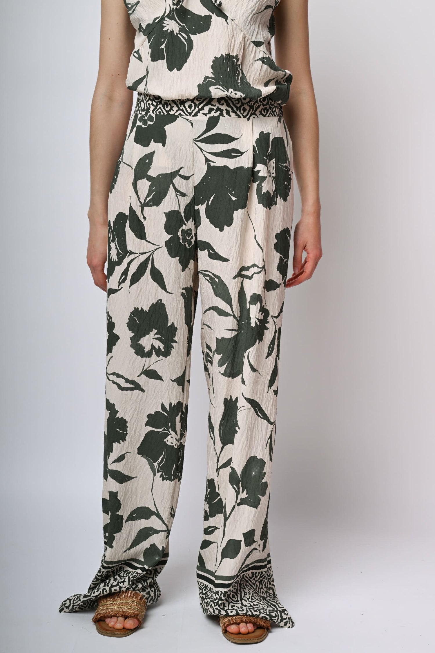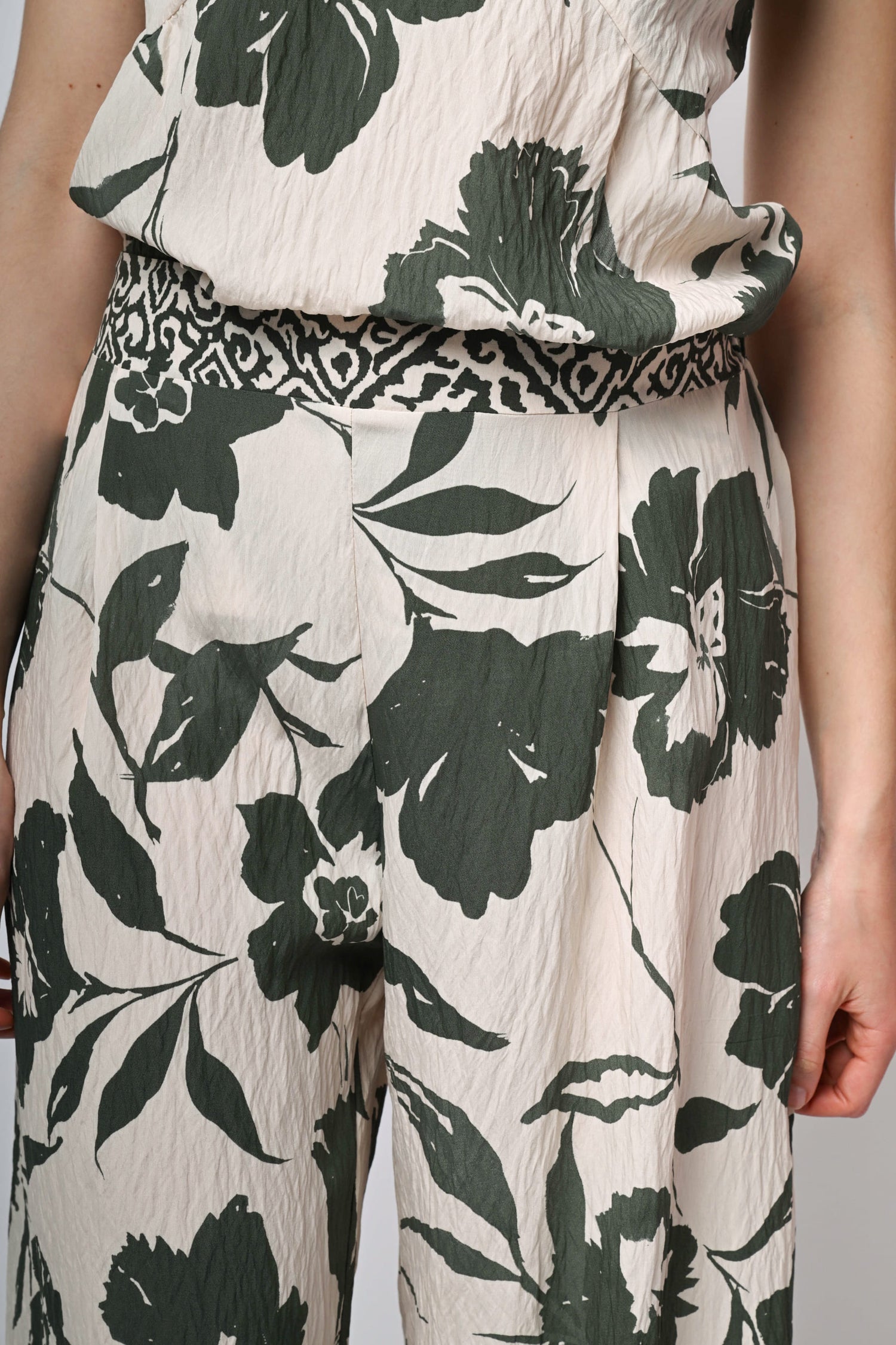 Pantaloni palazzo in tessuto misto viscosa effetto stropicciato con stampa macro floreale verde militare su fondo beige, vita elasticizzata e pinces frontali.