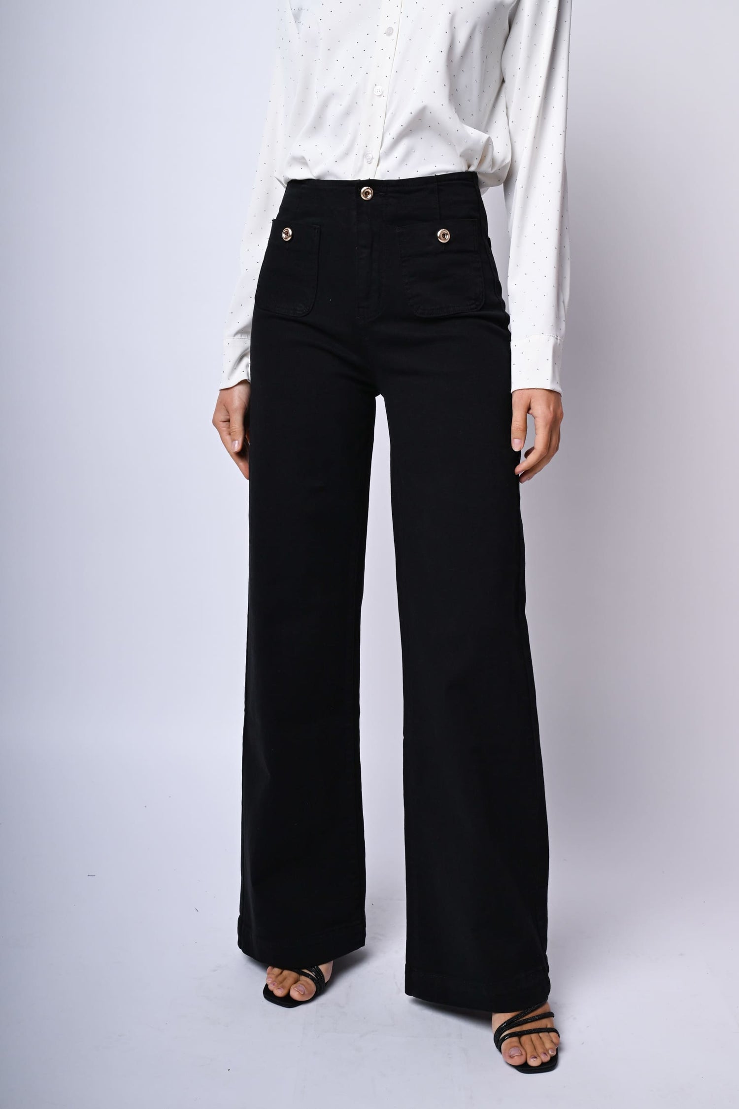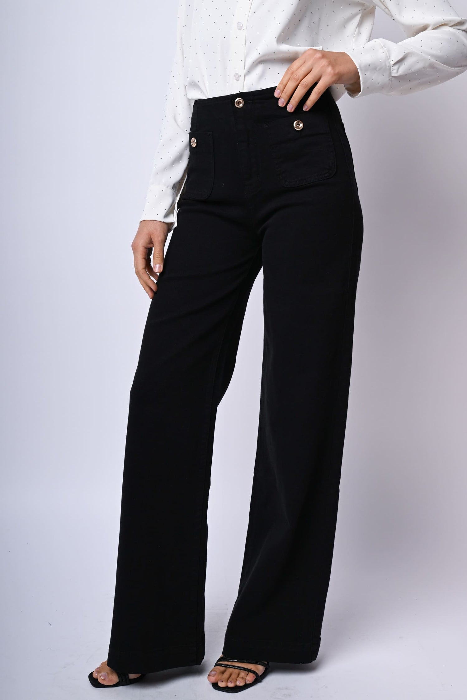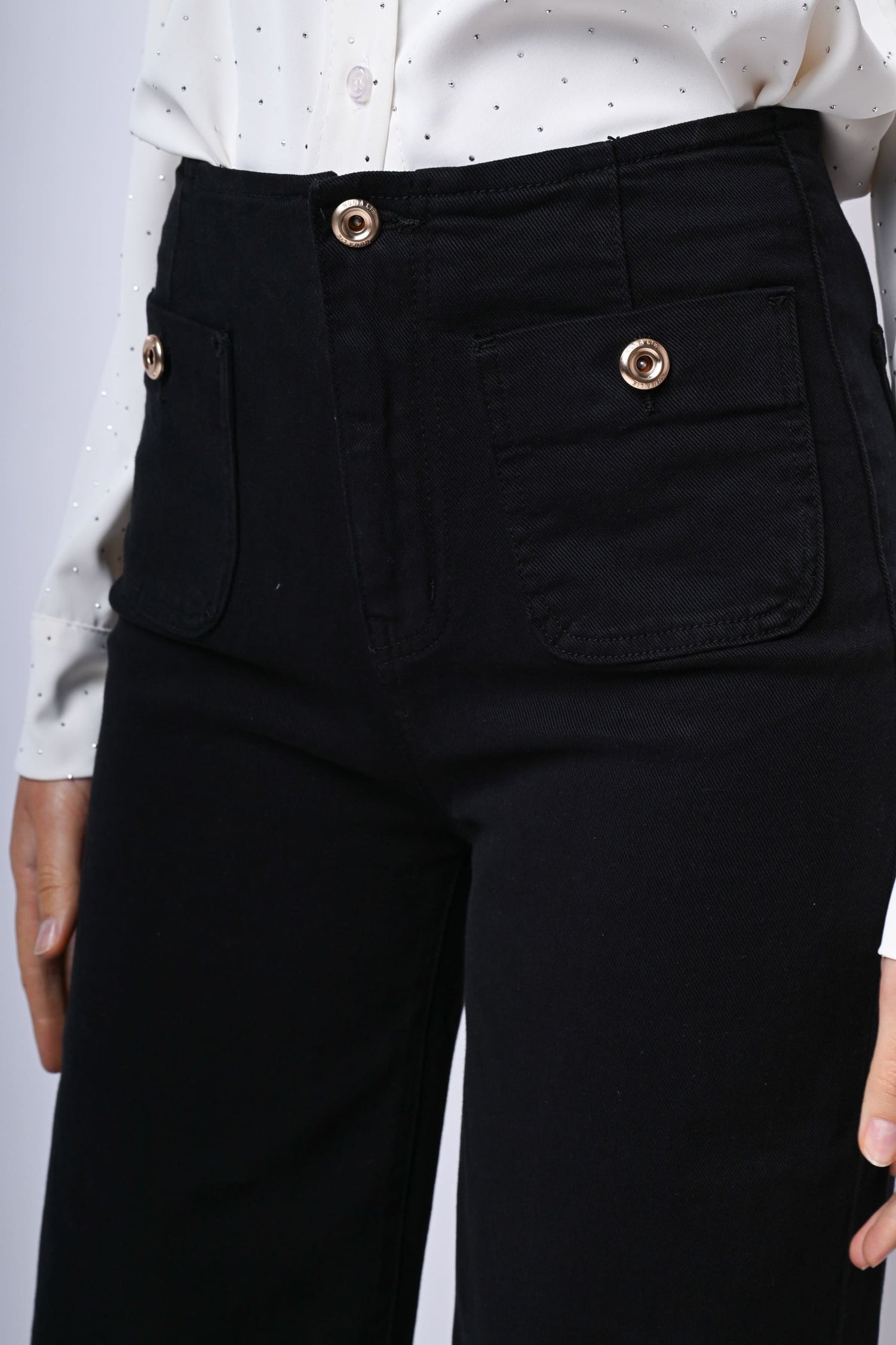 Pantaloni palazzo in twill di cotone nero con bottone e zip di chiusura, tasche applicate sul davanti con bottoni dorati e tasche applicate sul retro.