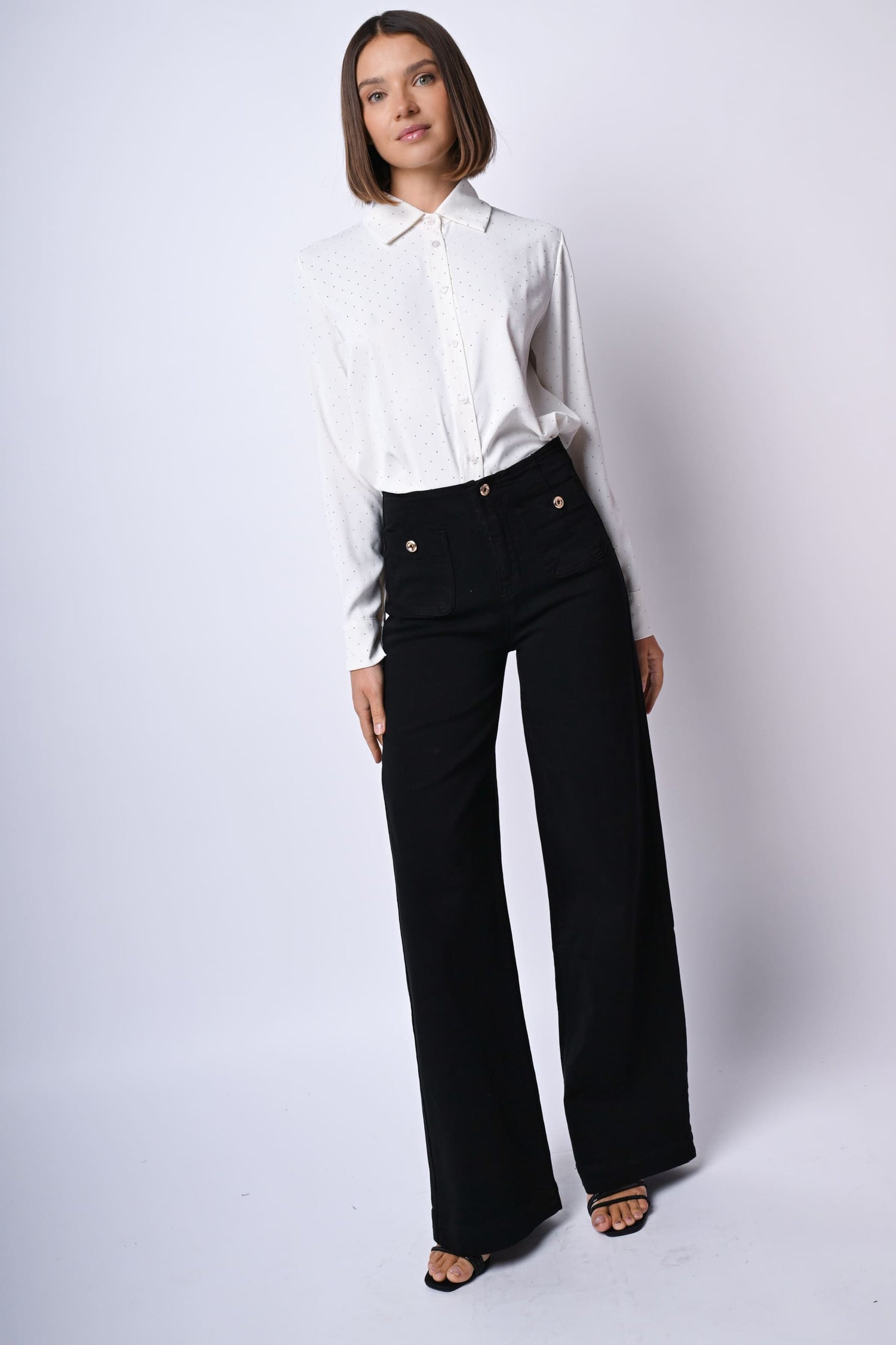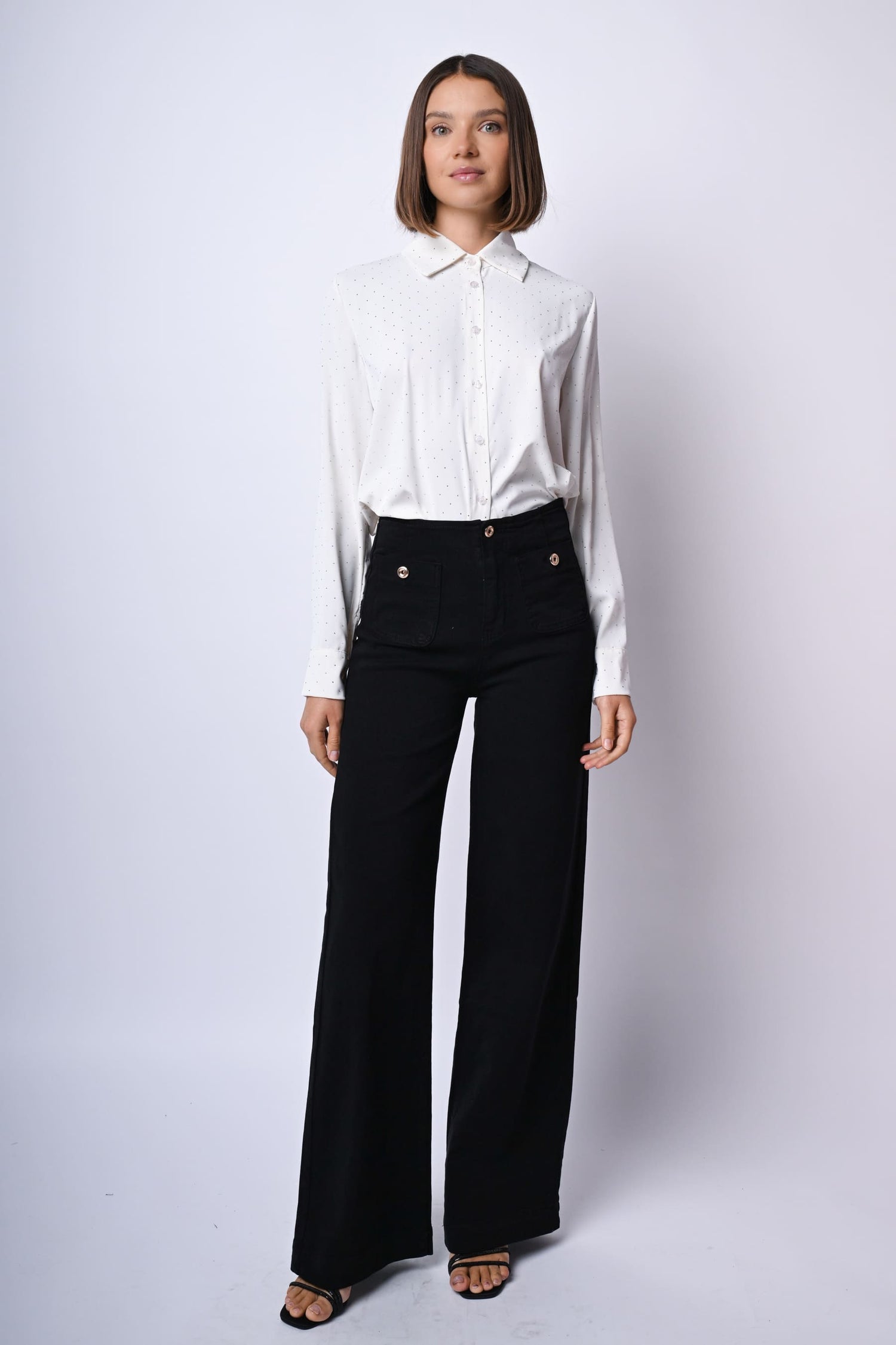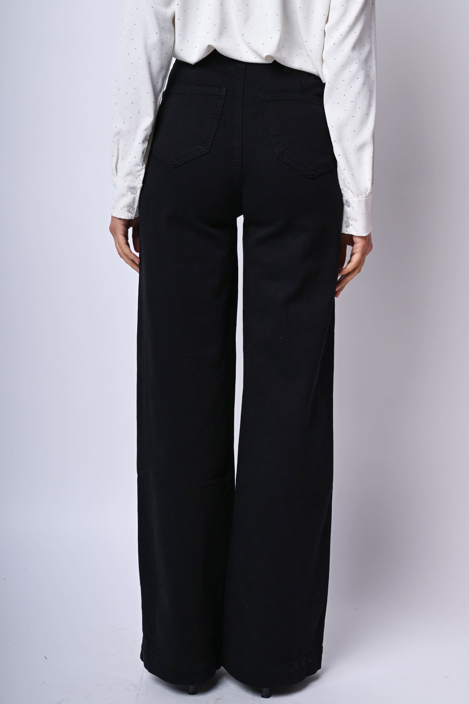 Pantaloni palazzo in twill di cotone nero con bottone e zip di chiusura, tasche applicate sul davanti con bottoni dorati e tasche applicate sul retro.