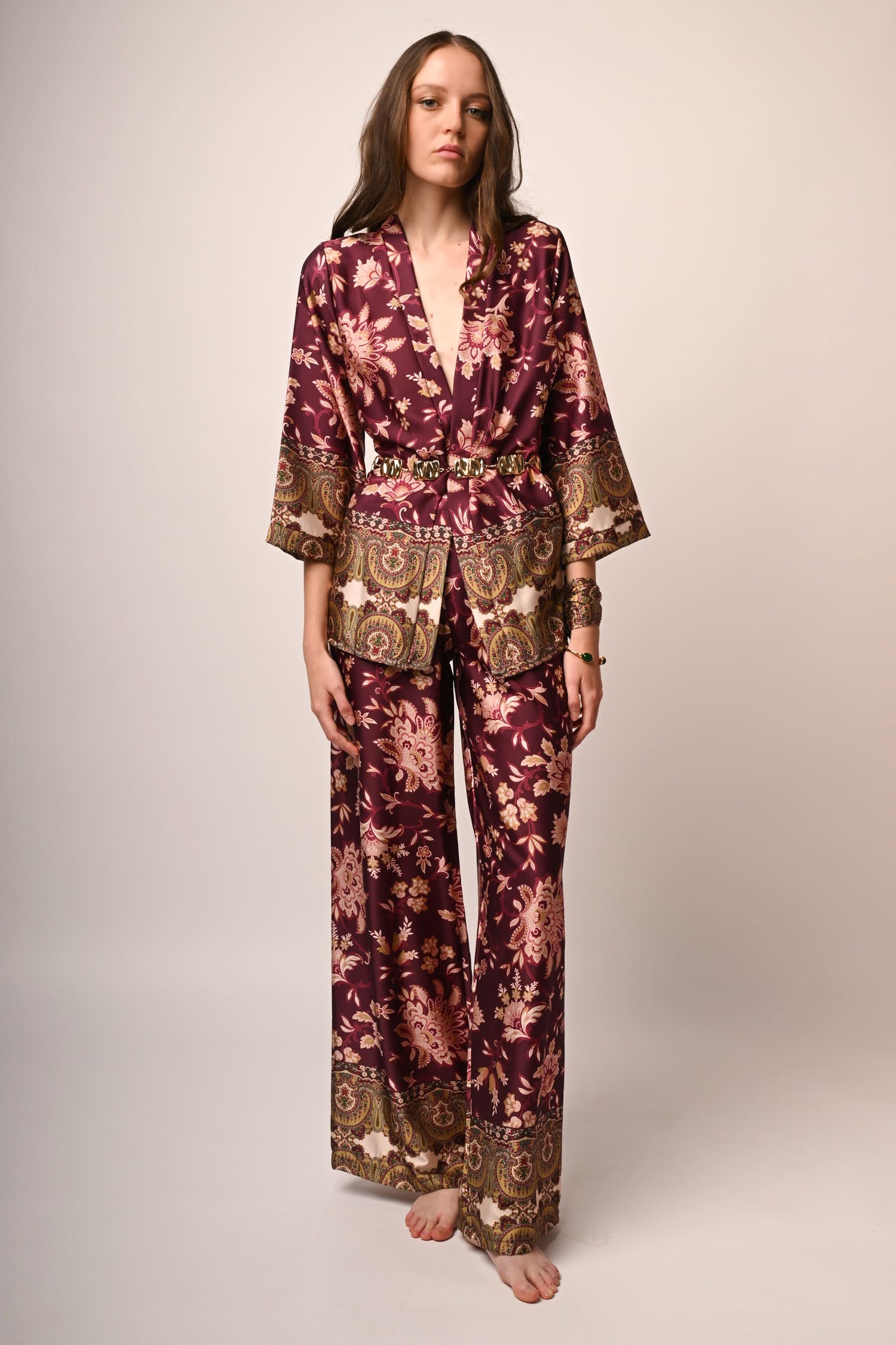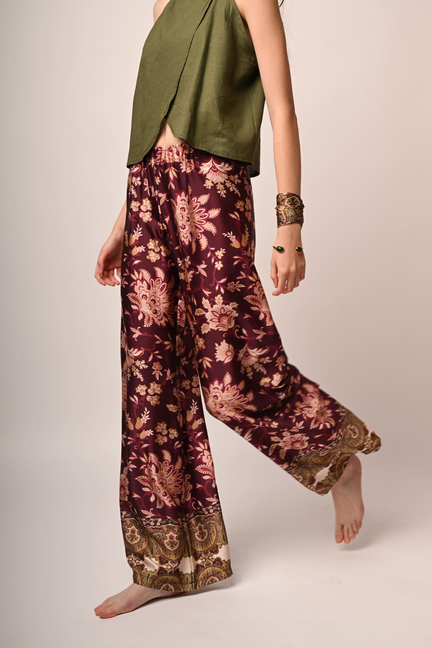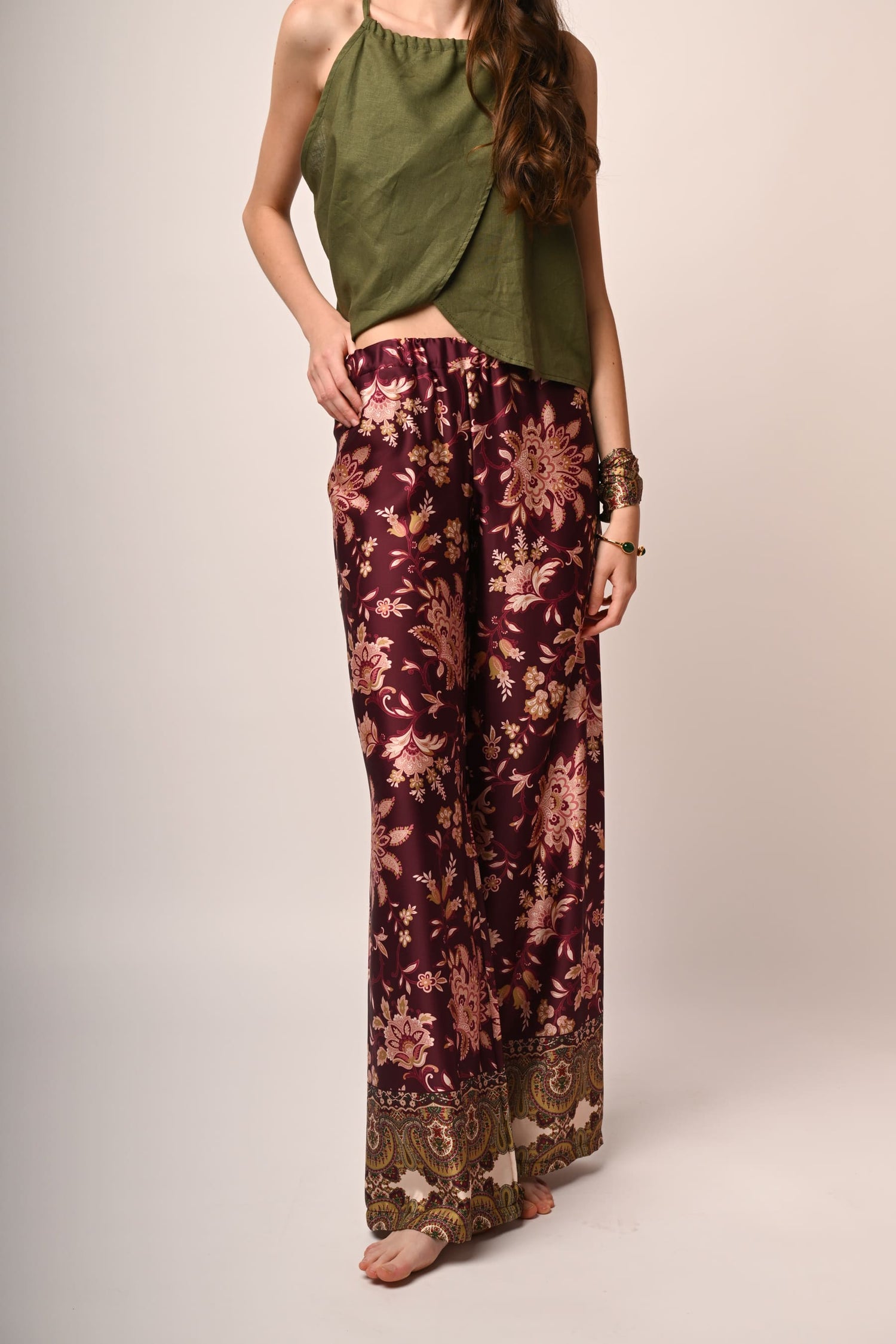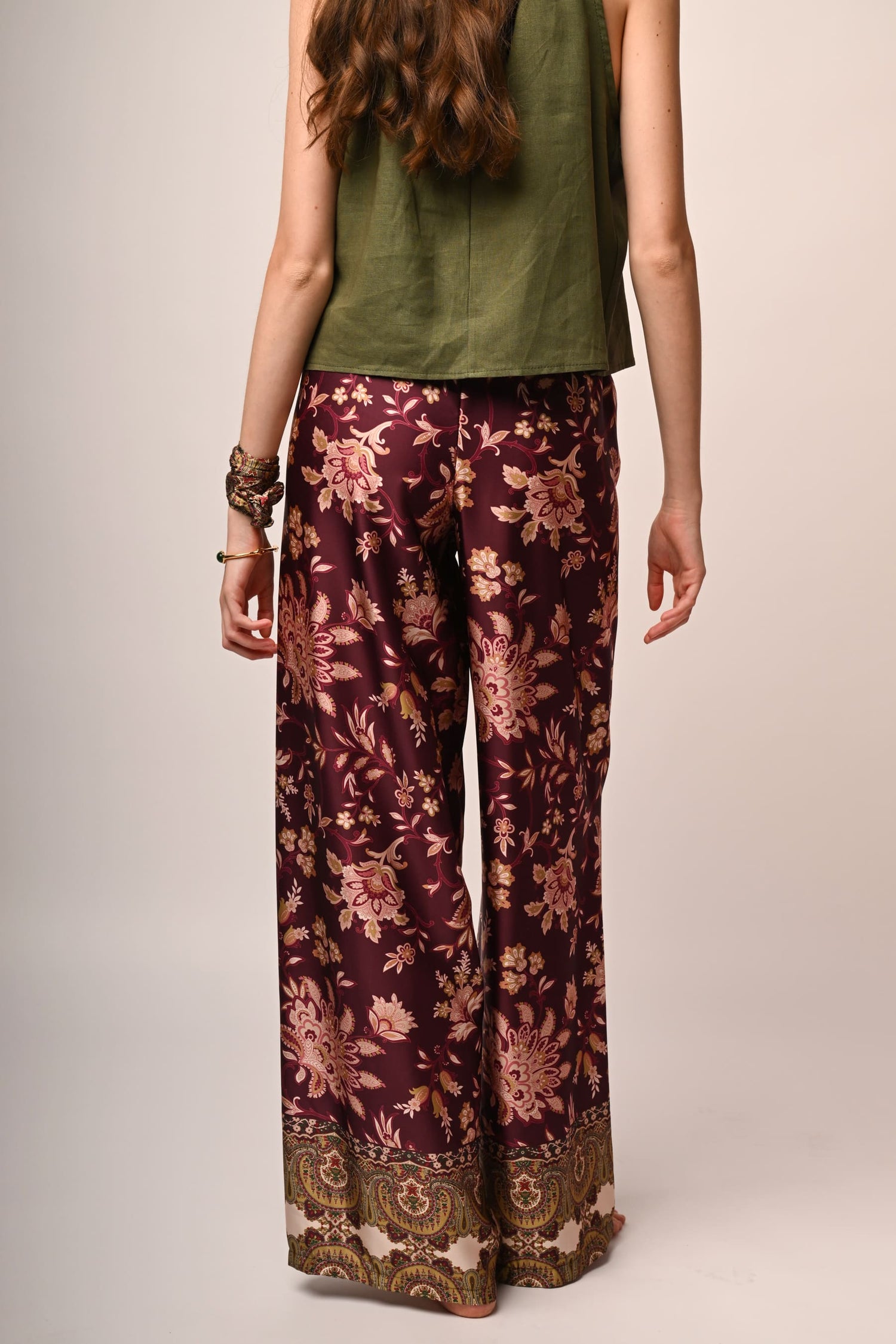 Pantaloni palazzo a stampa etnica multicolor su fondo bordeaux con vita elasticizzata.