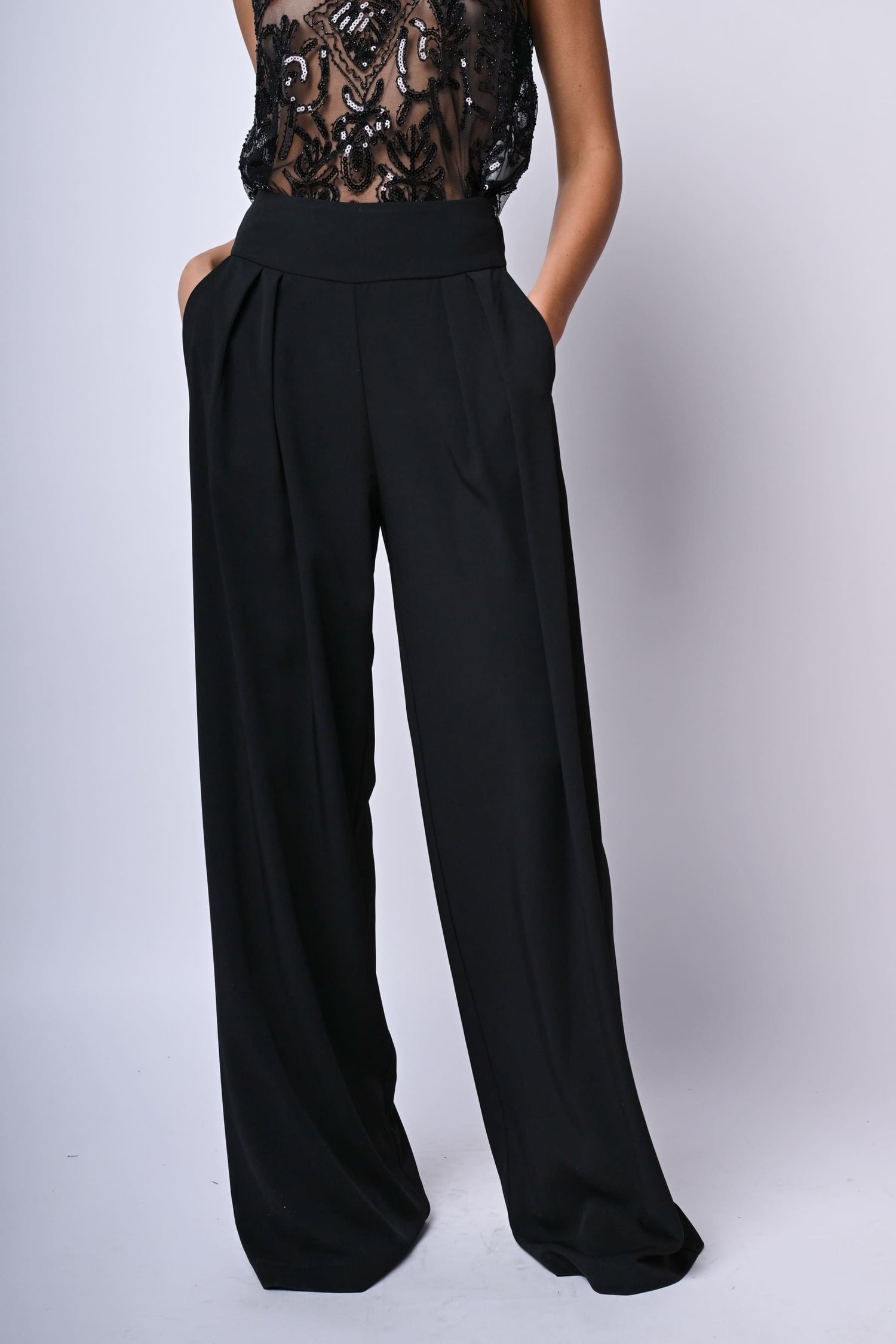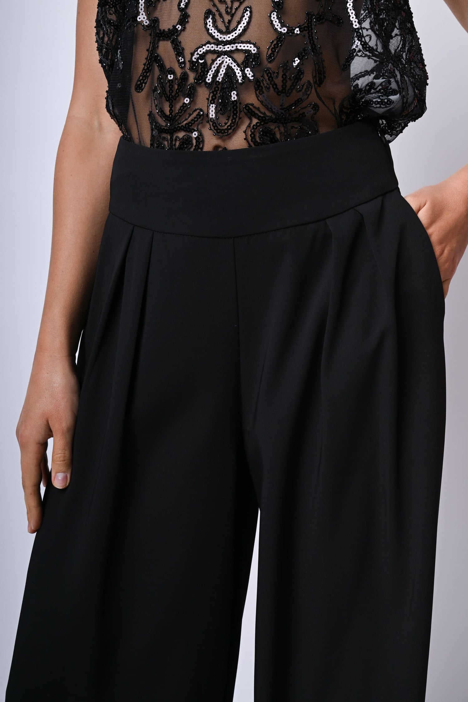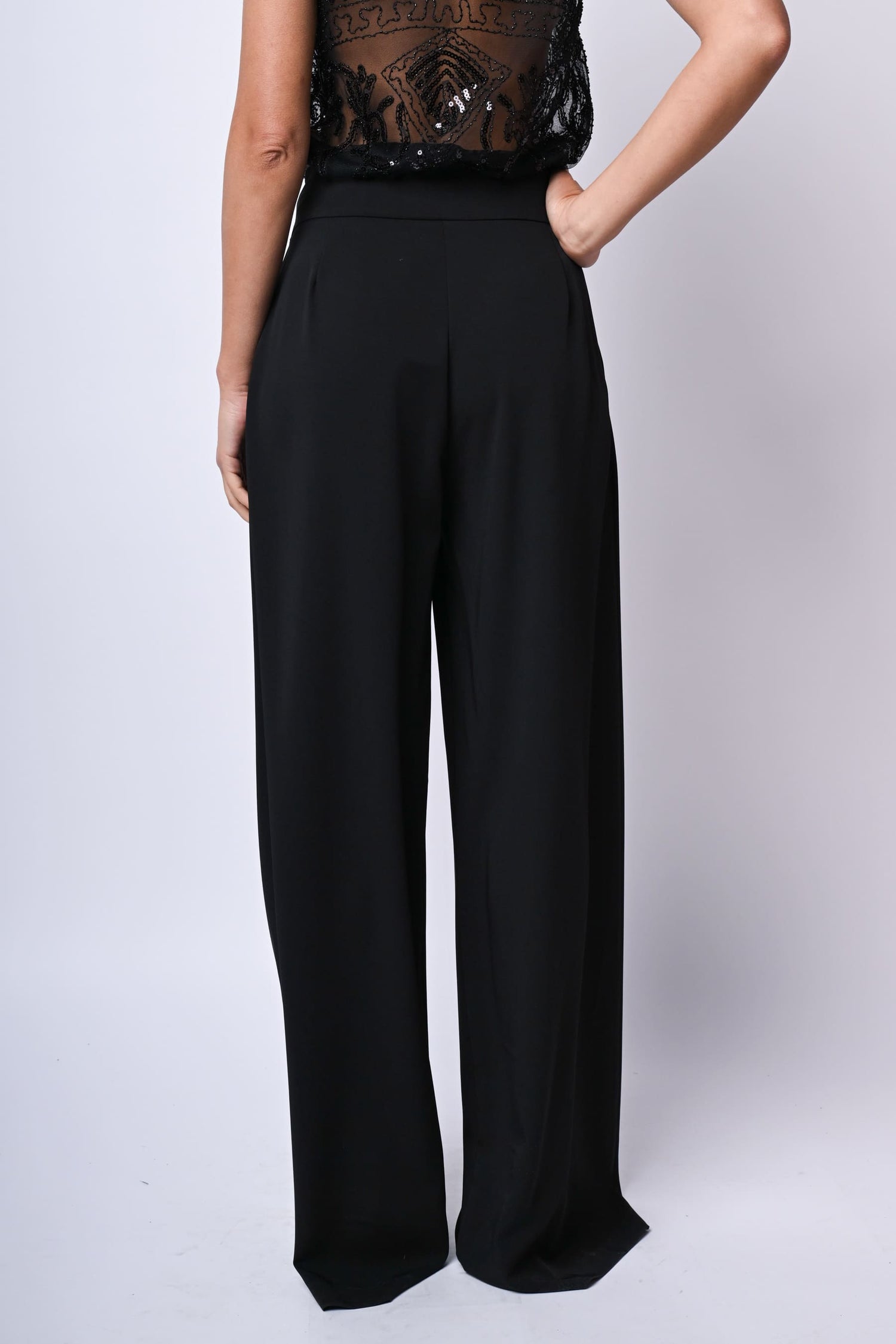 Pantaloni palazzo in tessuto stretch nero con fascia alta in vita, chiusura laterale con zip, doppie pinces frontali e tasche laterali.