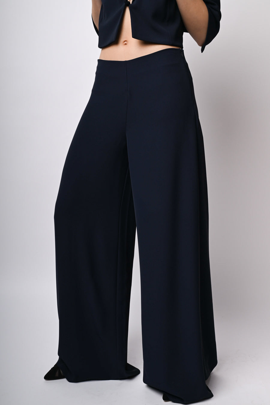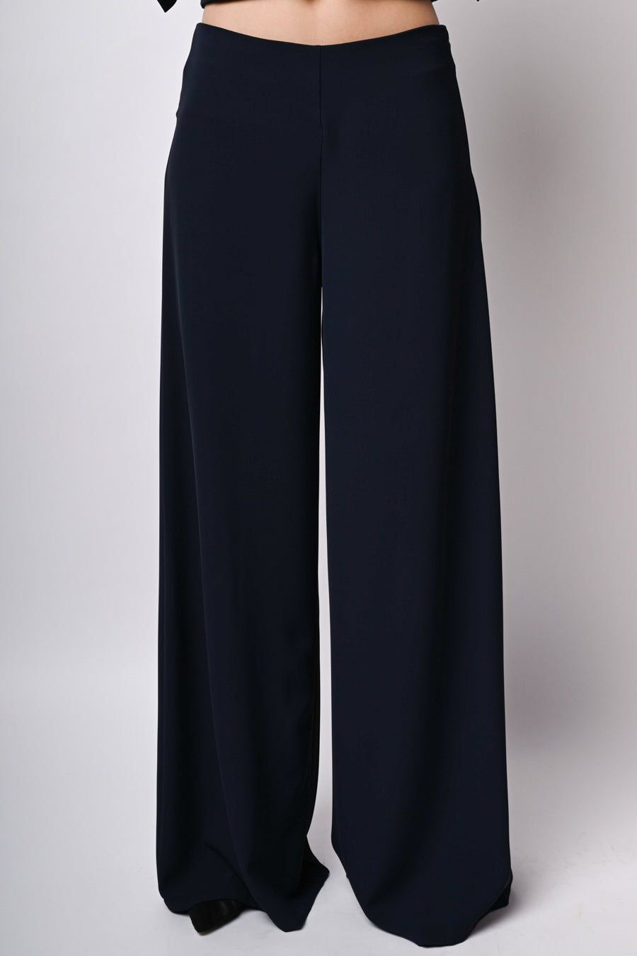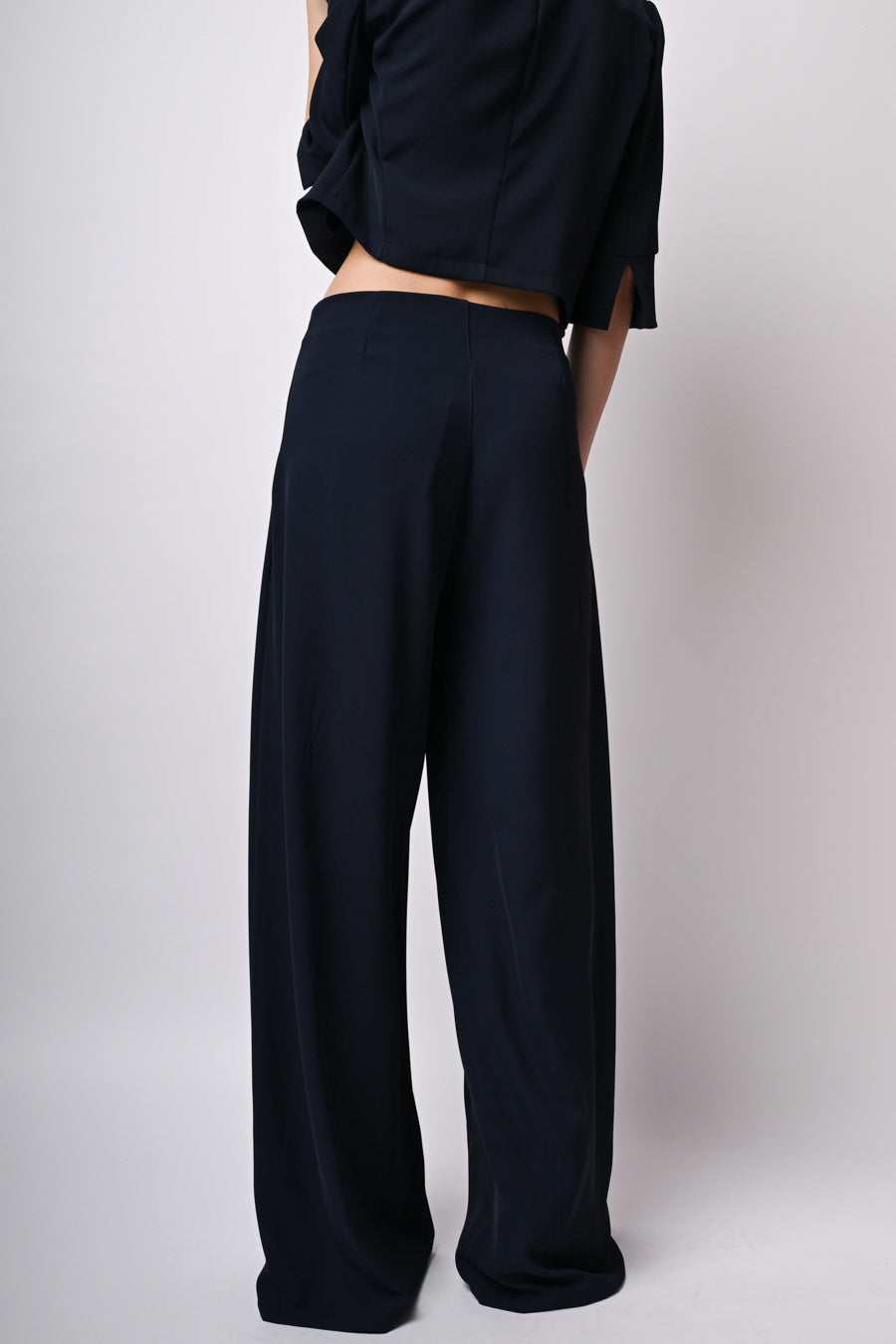 Pantaloni palazzo in tessuto stretch blu scuro con vita alta e zip di chiusura laterale.