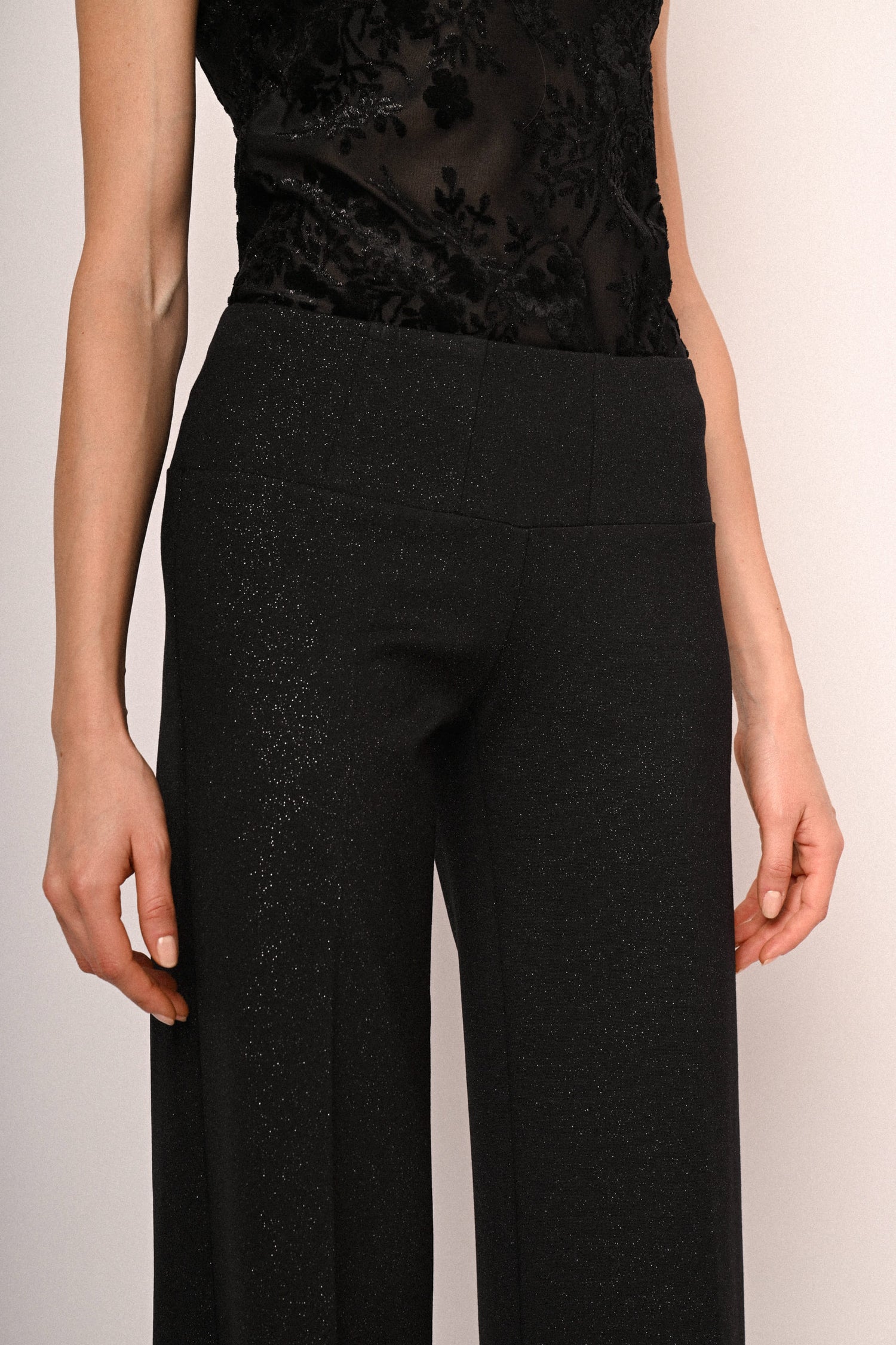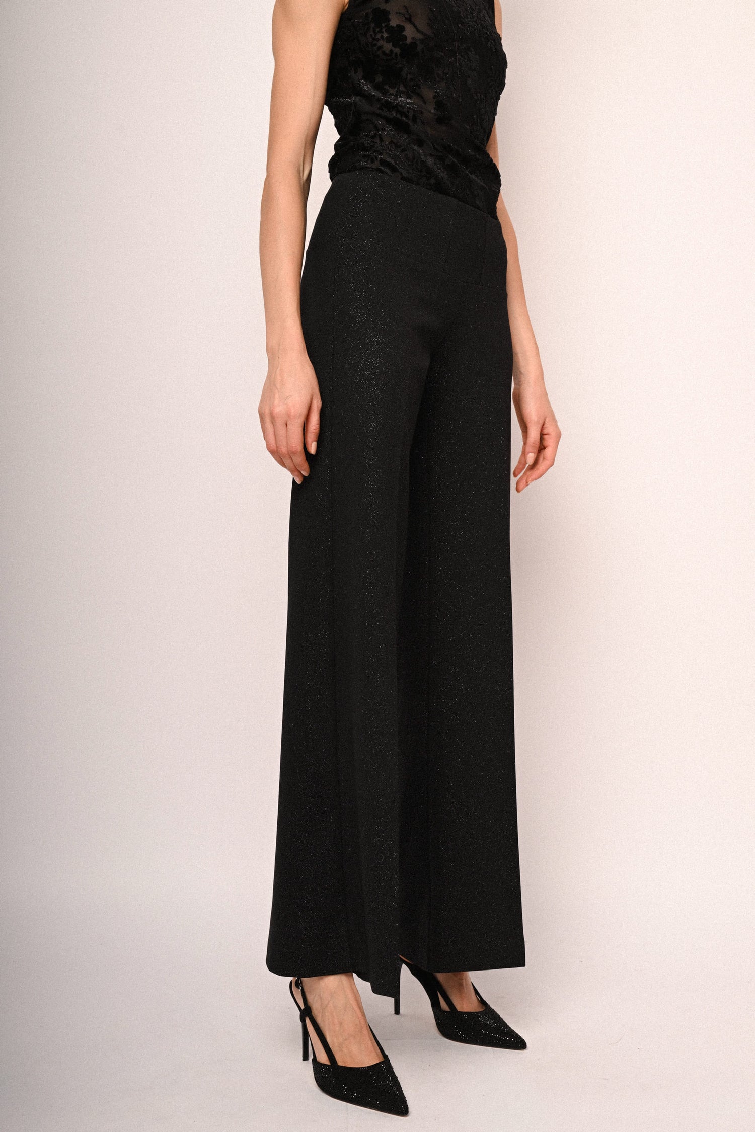 Pantaloni palazzo misto viscosa stretch nero con glitter all-over e banda alta in vita elasticizzata.