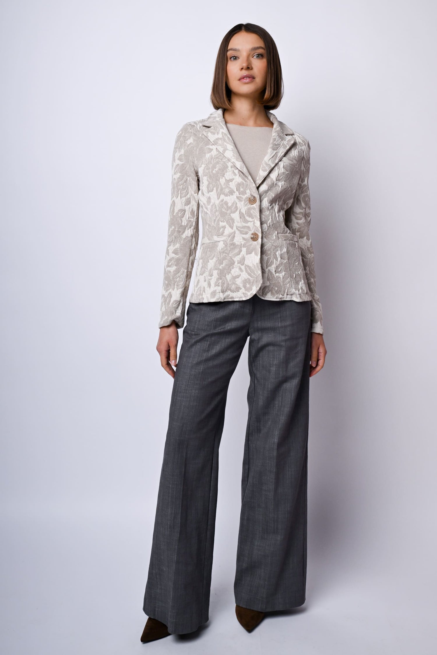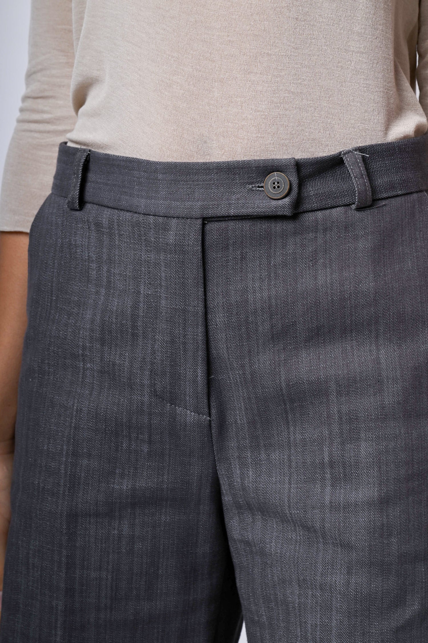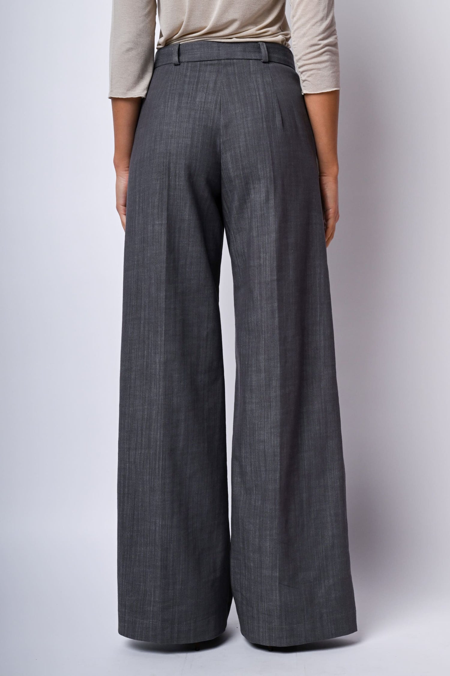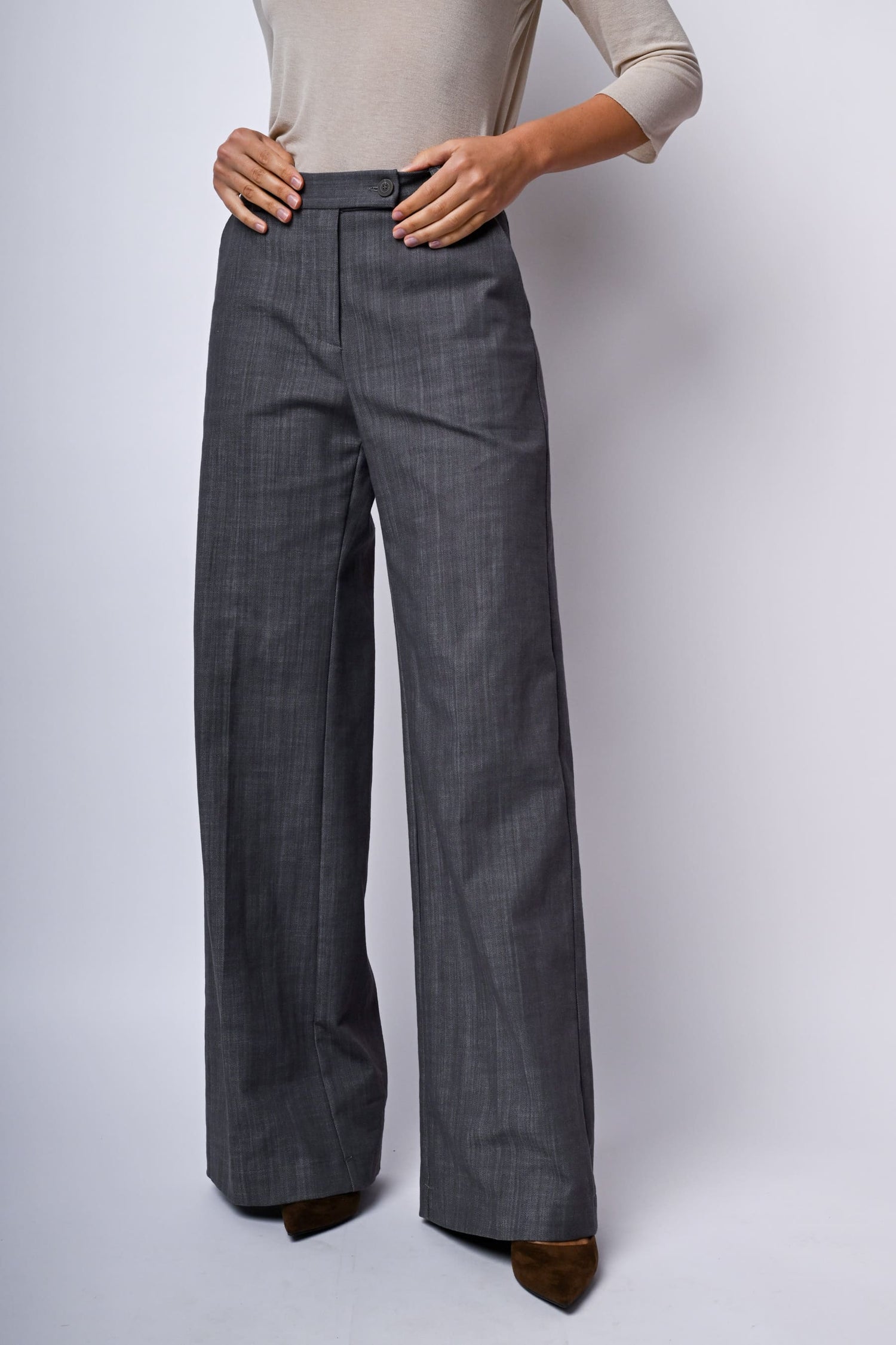 Pantaloni palazzo in misto cotone stretch grigio con passanti per cintura, chiusura con linguetta, bottone e zip nascosta, tasche laterali e piega stirata.