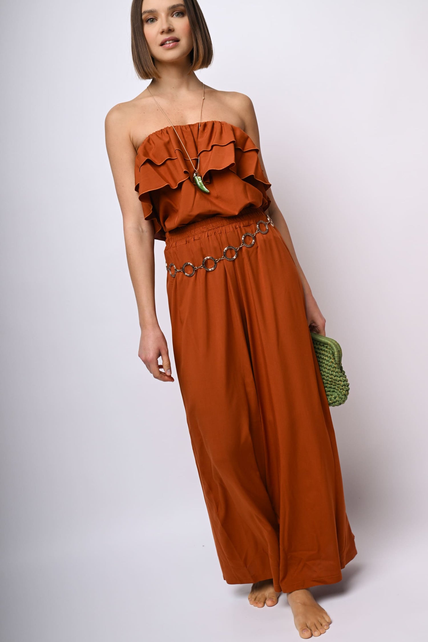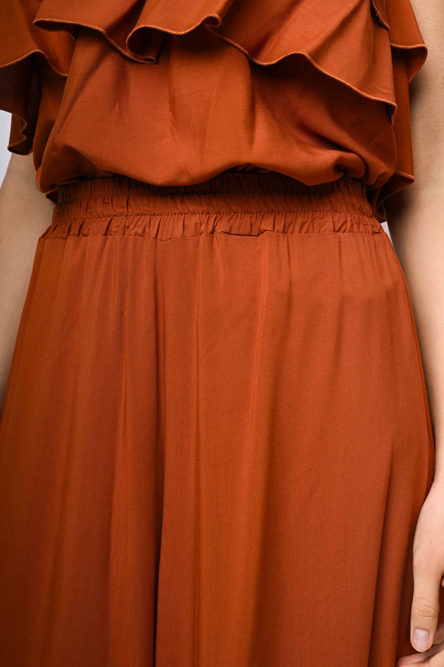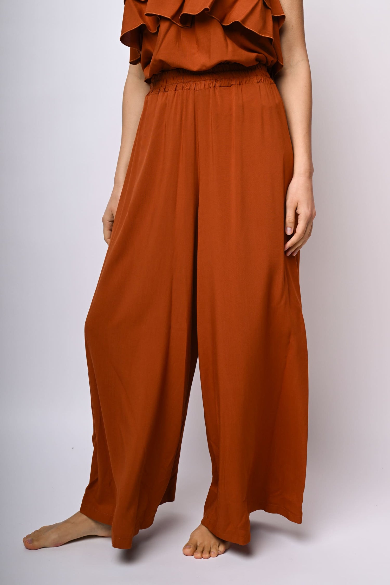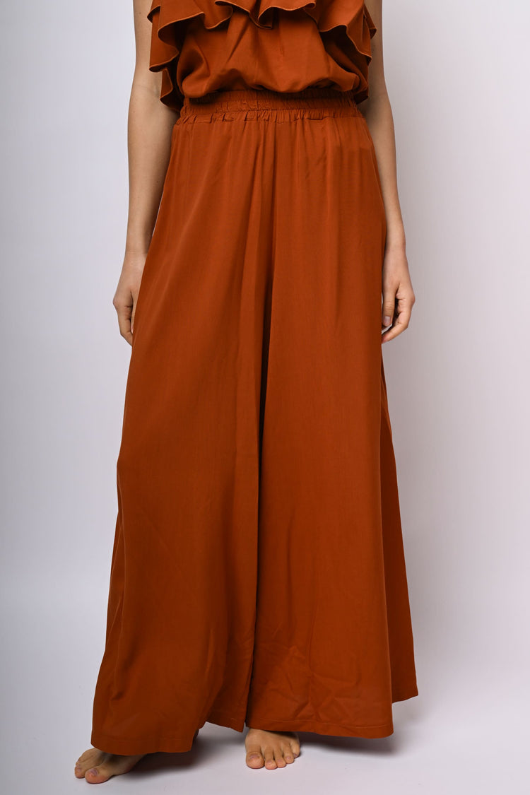 Pantaloni palazzo in viscosa nuance coccio con vita elasticizzata e gamba molto ampia.
