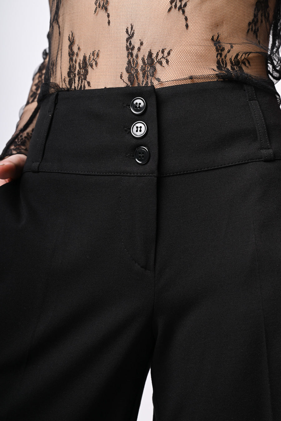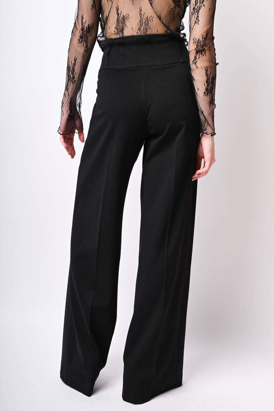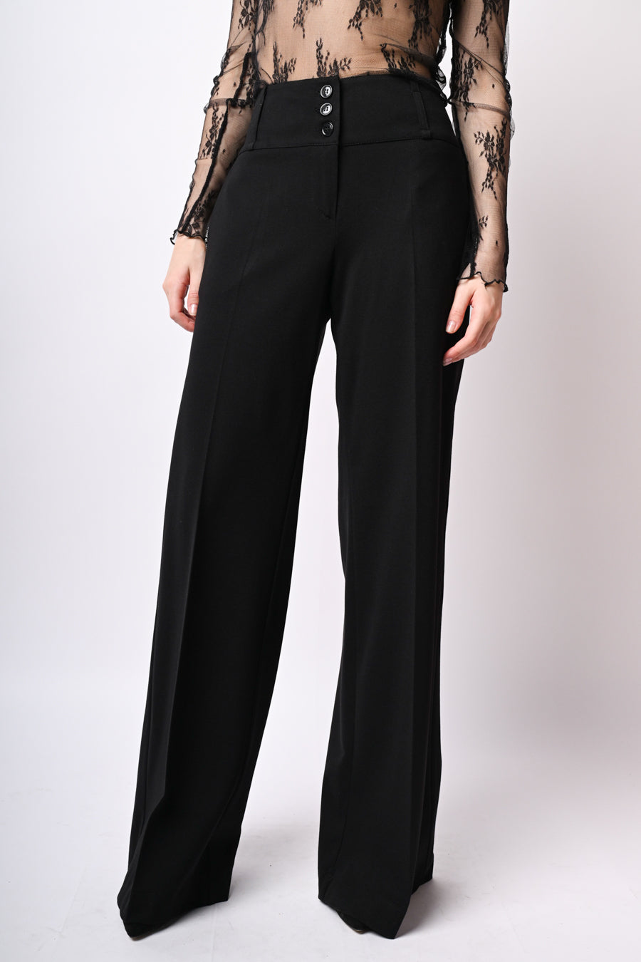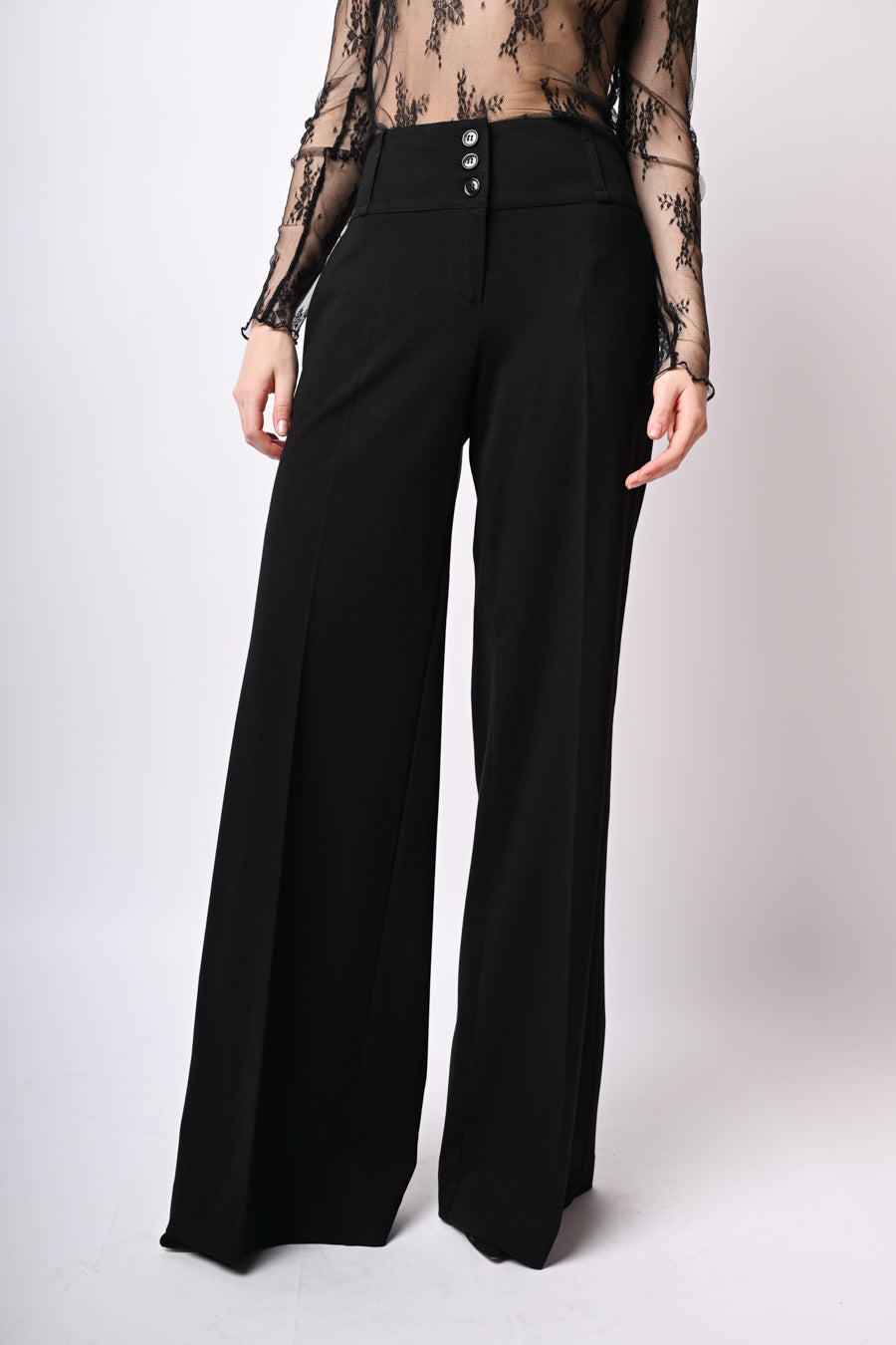 Pantaloni palazzo misto viscosa stretch nero con vita alta, passanti per cintura, chiusura con tre bottoni e zip, tasche laterali e piega stirata.