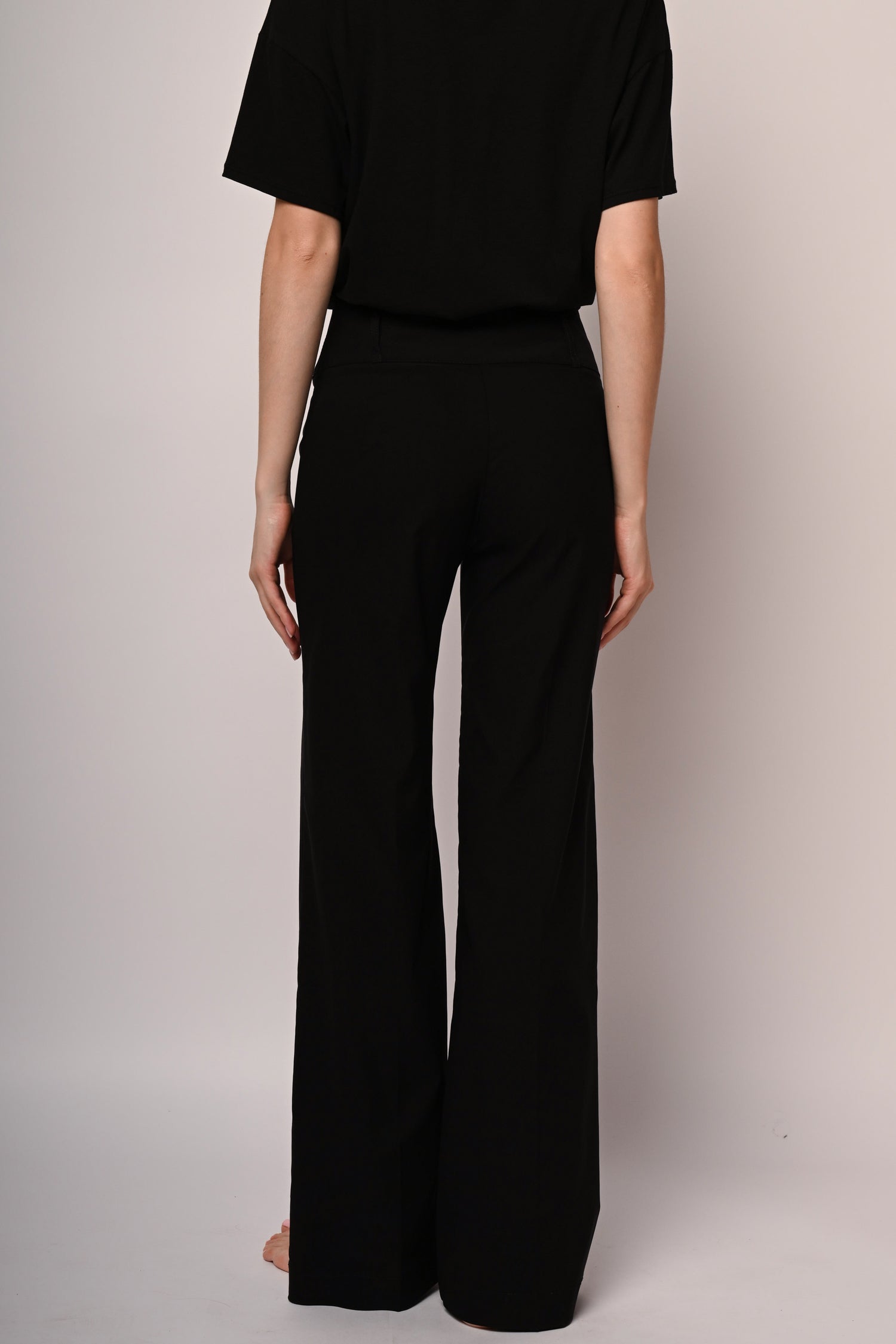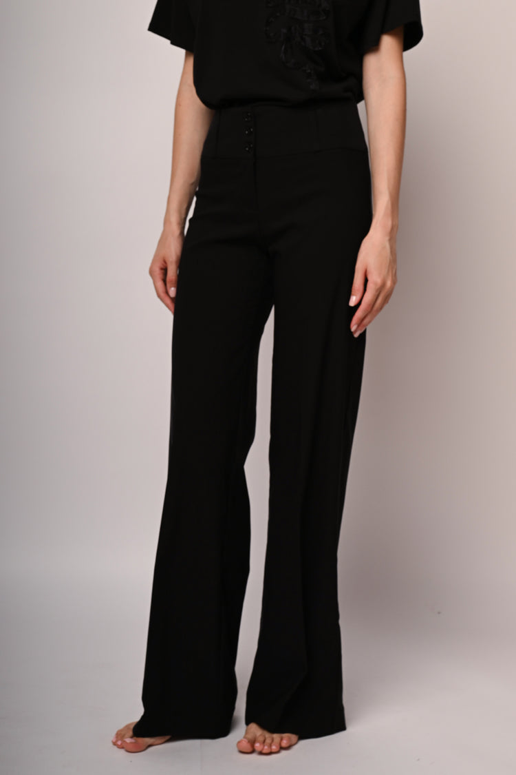 Pantaloni palazzo misto viscosa stretch nero con passanti per cintura , tre bottoni e zip di chiusura.