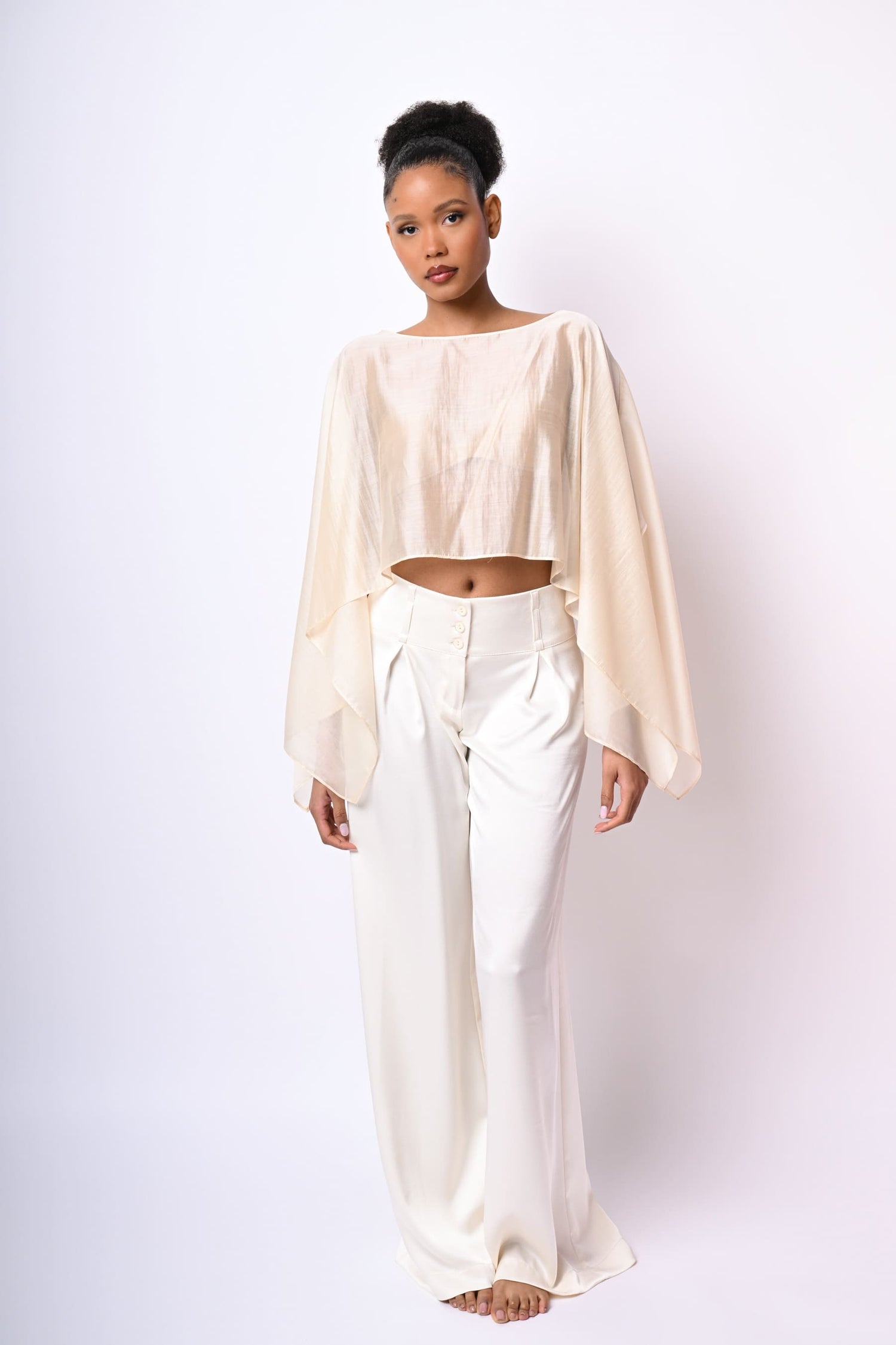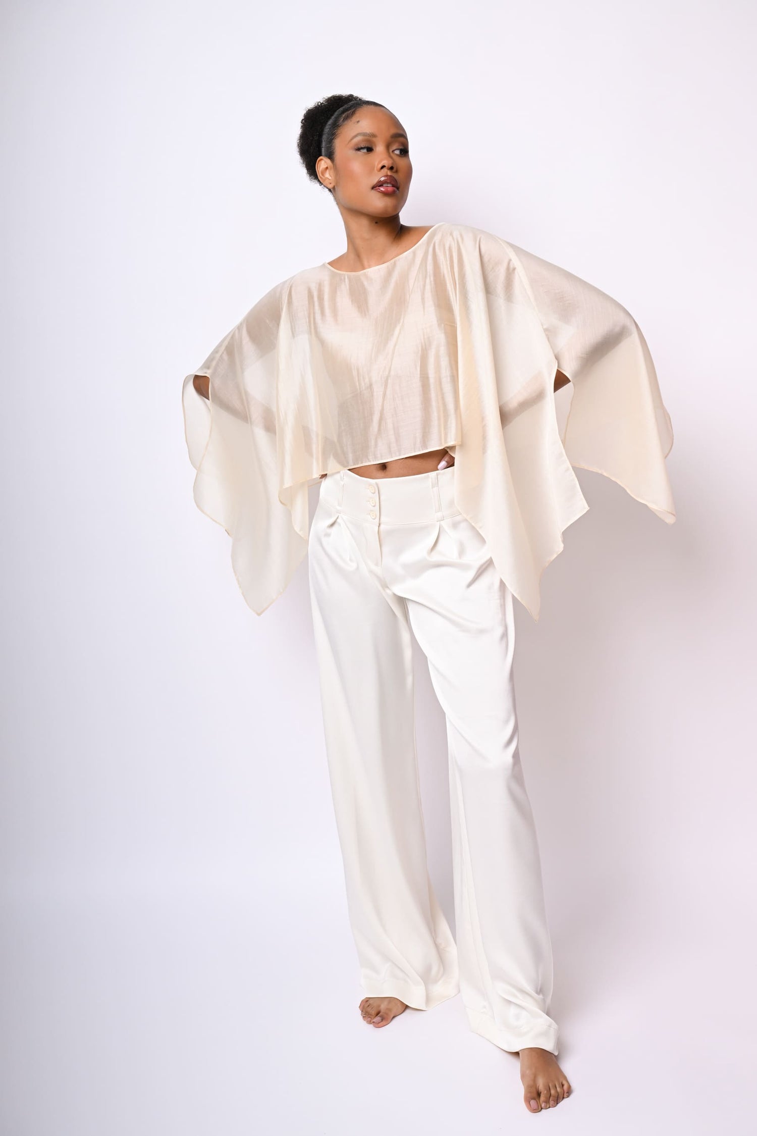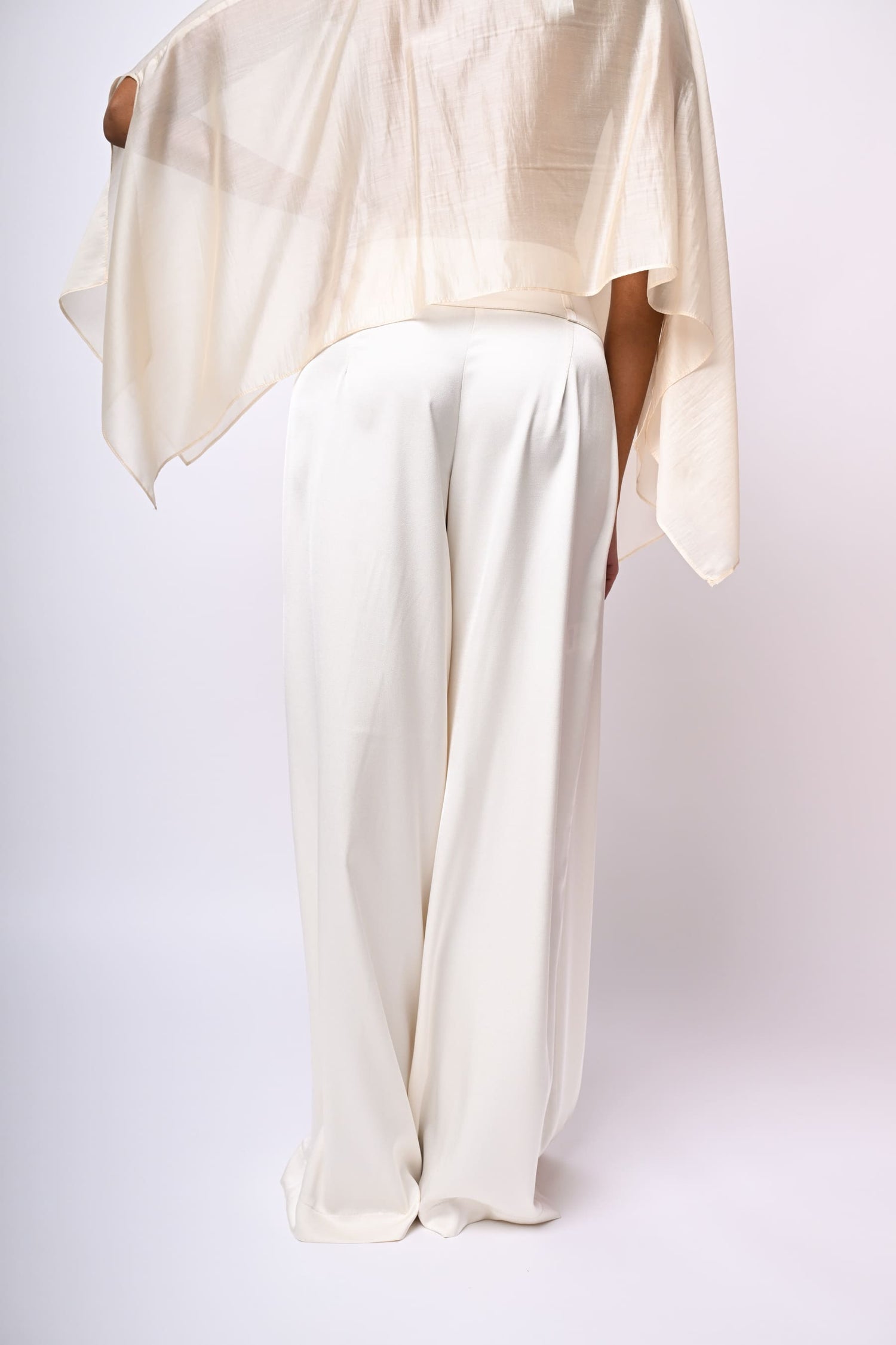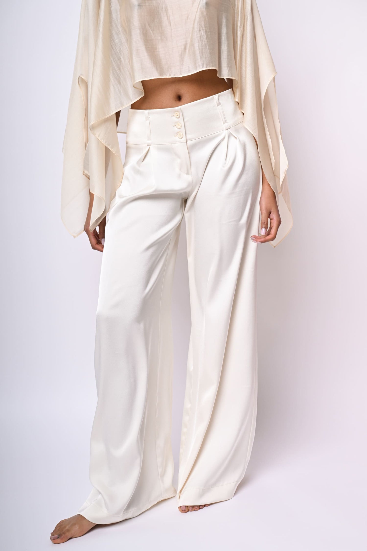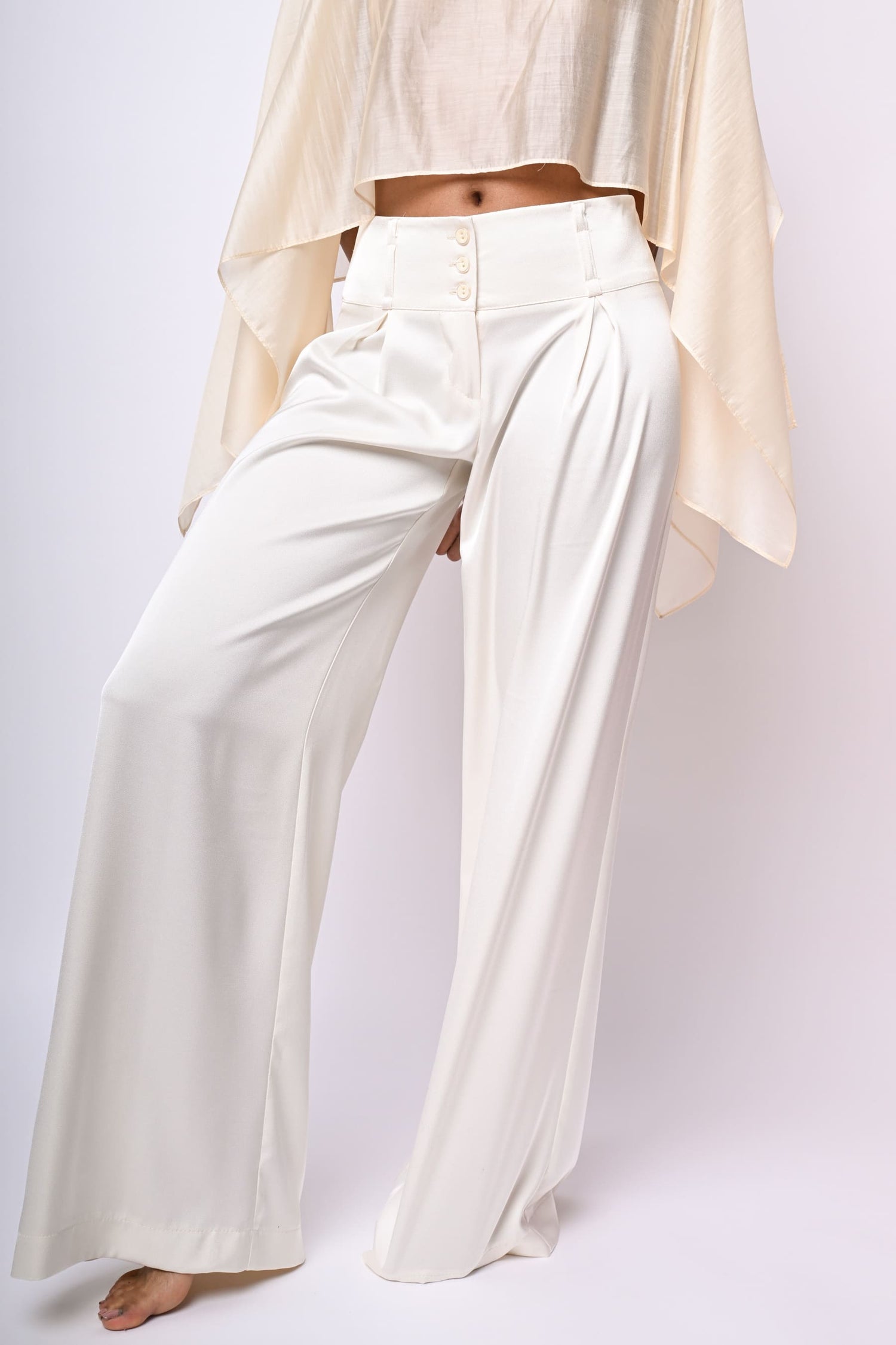 Pantaloni palazzo in raso bianco con fascia alta in vita, passanti per cintura, chiusura con tre bottoni e zip e pinces sul davanti e sul retro.