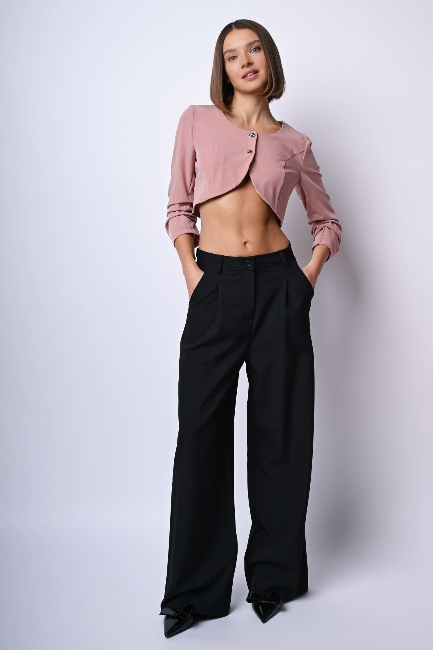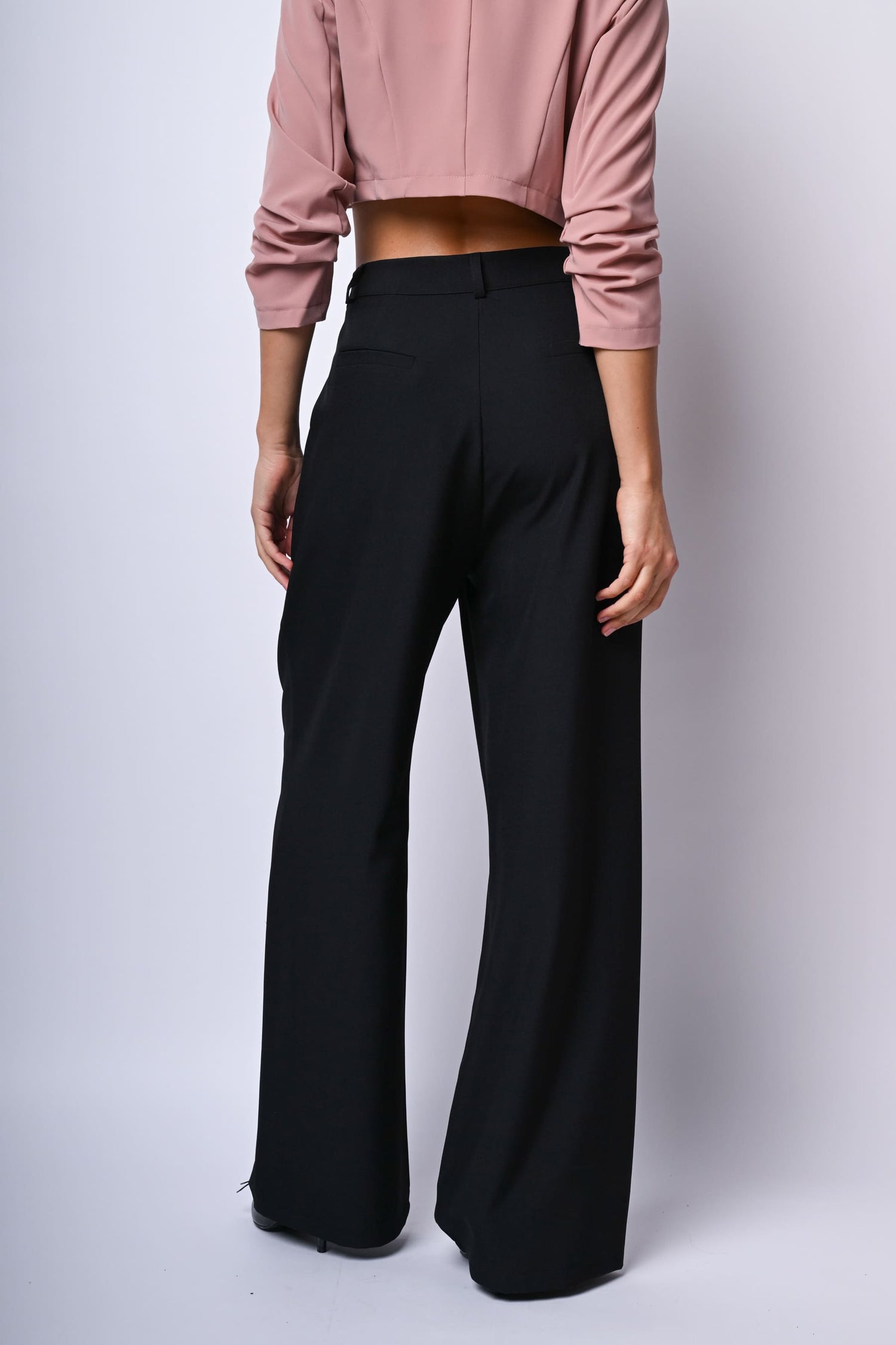 Pantaloni palazzo in tessuto stretch nero con passanti per cintura, chiusura con bottone e zip, tasche laterali e pinces sul davanti.