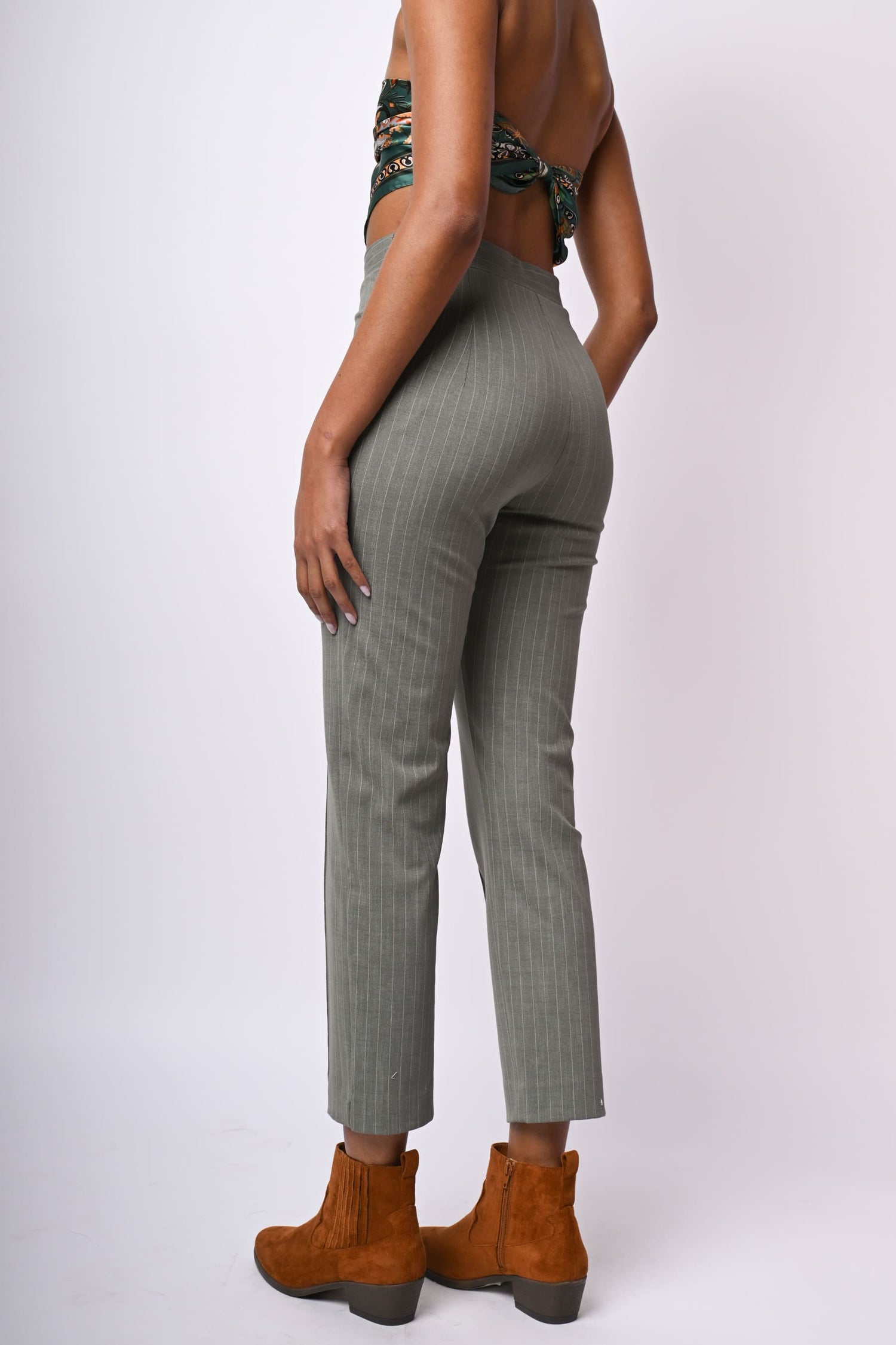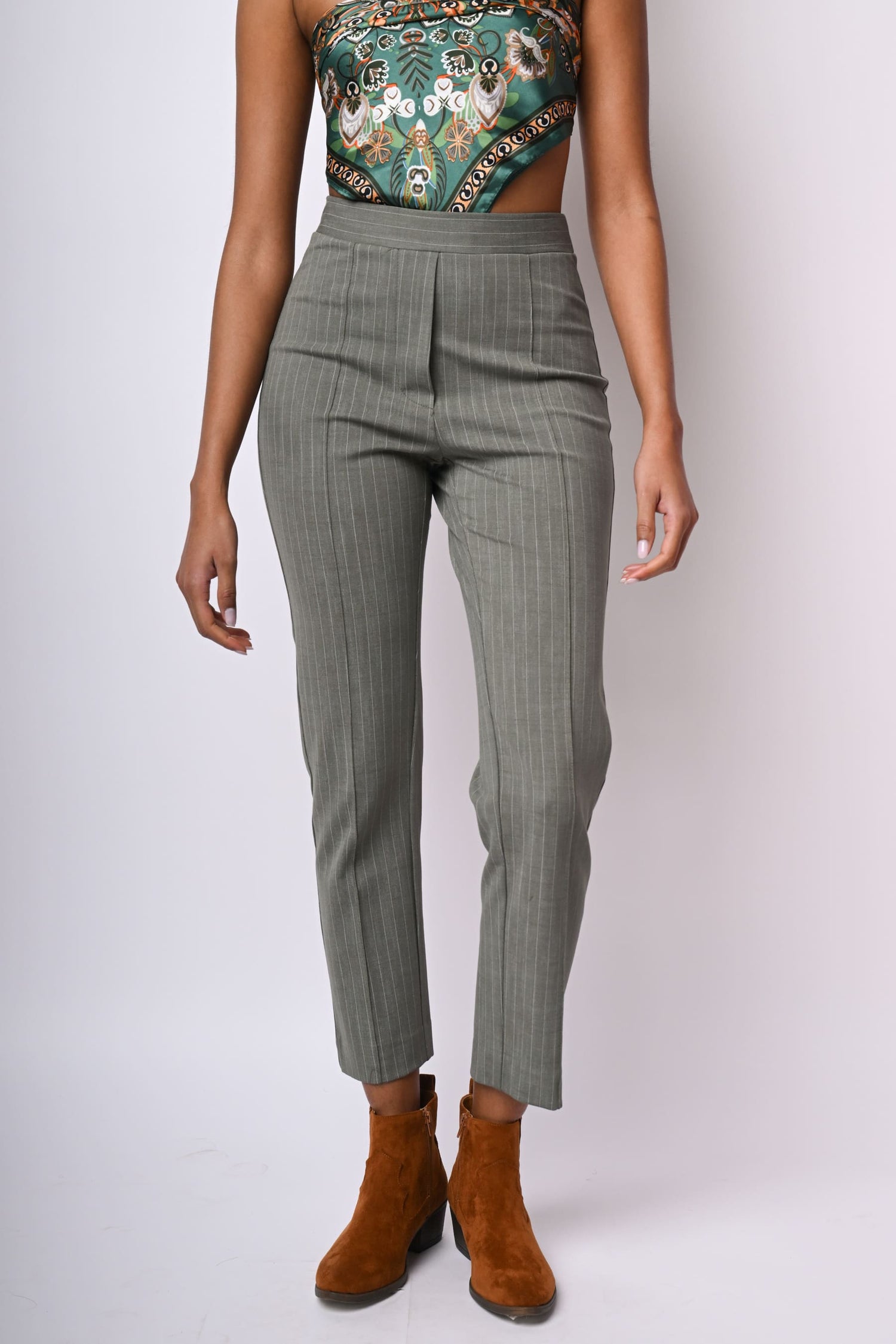 Pantaloni slim-fit in misto viscosa stretch verde salvia gessato bianco con vita alta elasticizzata, impuntura centrale e gamba leggermente crop.