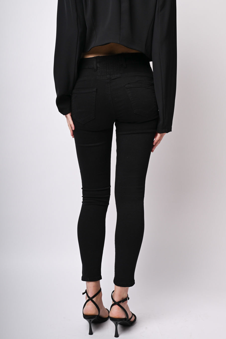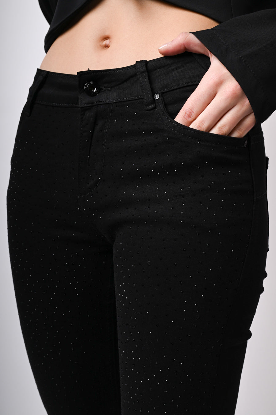 Pantaloni skinny in cotone stretch nero con glitter sulla parte frontale, passanti per cintura, inserto elasticizzato al centro dietro, chiusura con bottone e zip e taglio cinque tasche.