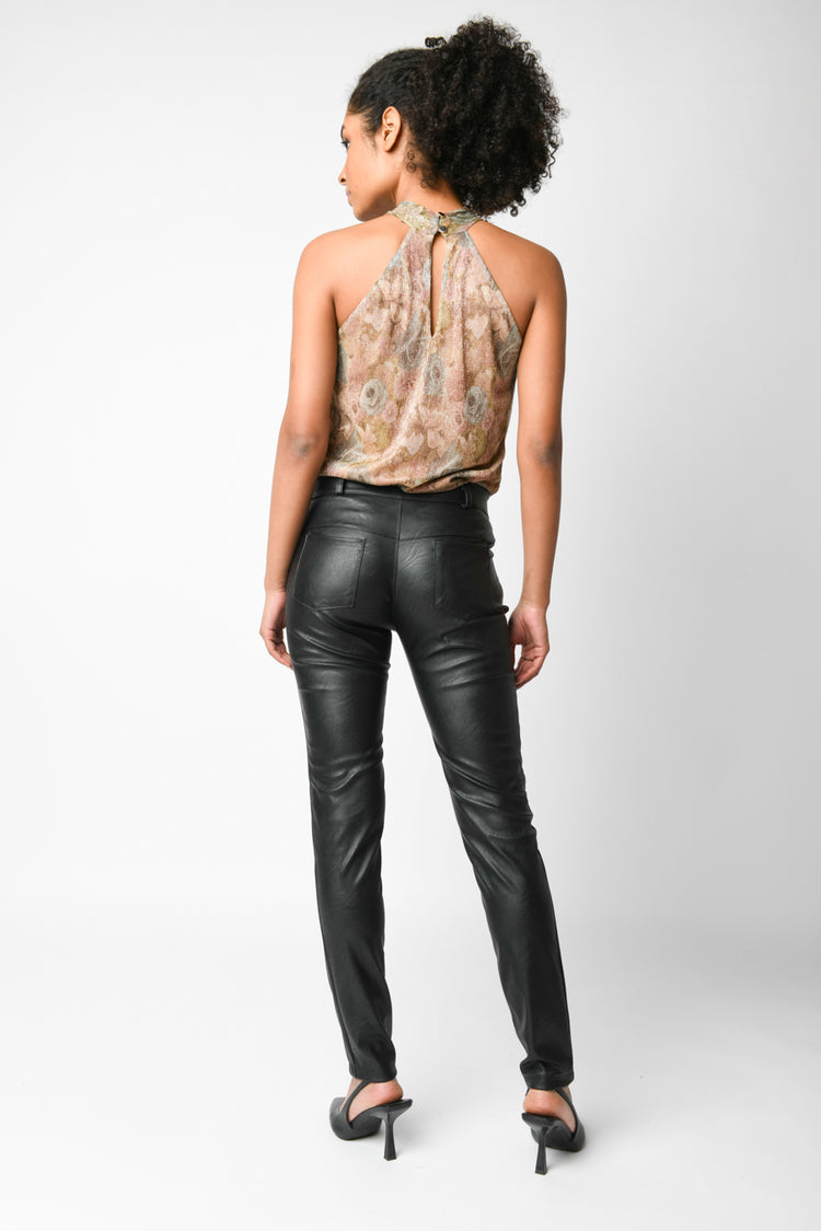 Pantaloni skinny in similpelle nera con vita alta, passanti per cintura, chiusura con bottone e zip e taglio cinque tasche.
