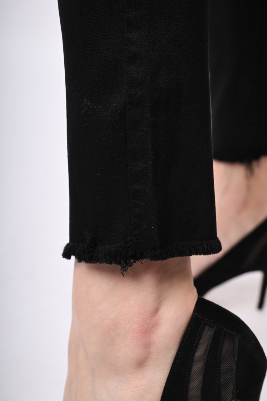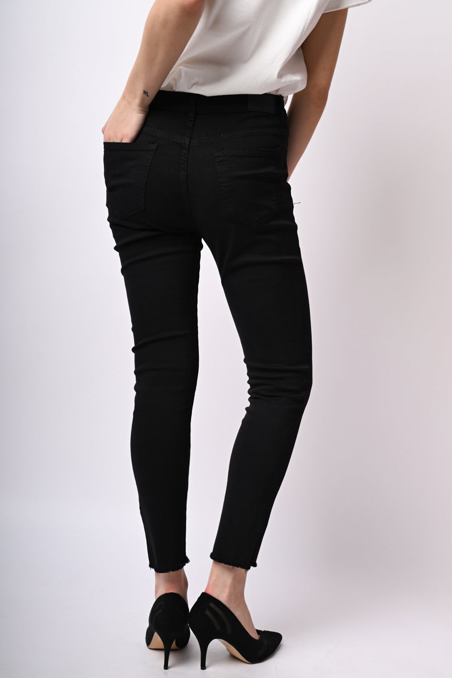 Pantaloni slim-fit in misto cotone stretch nero con passanti per cintura, chiusura con bottoni, taglio cinque tasche e orlo sfrangiato.