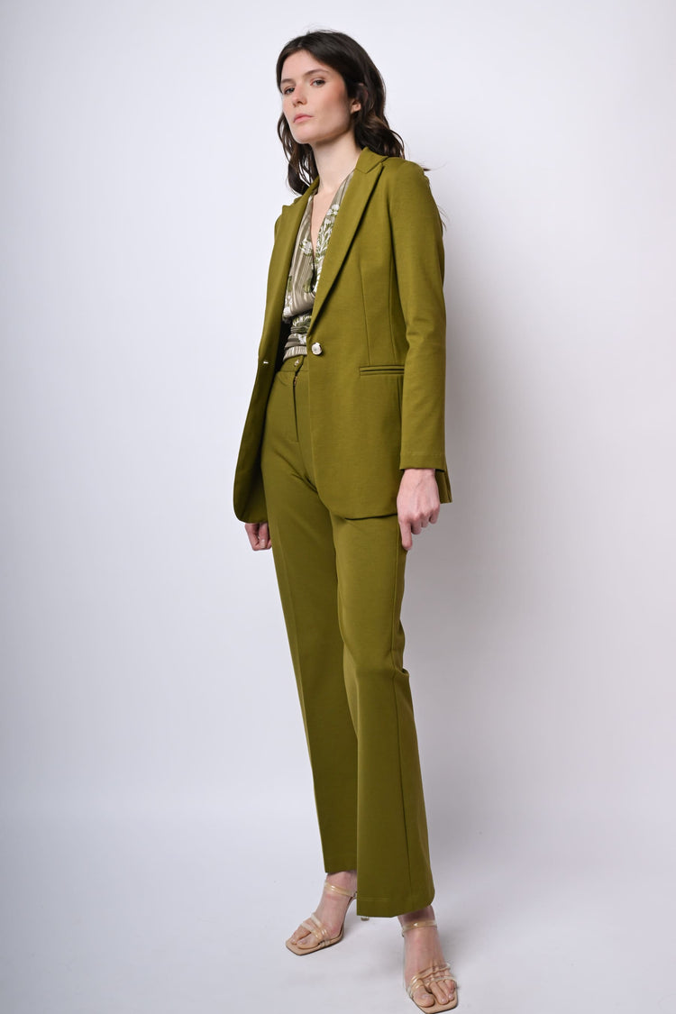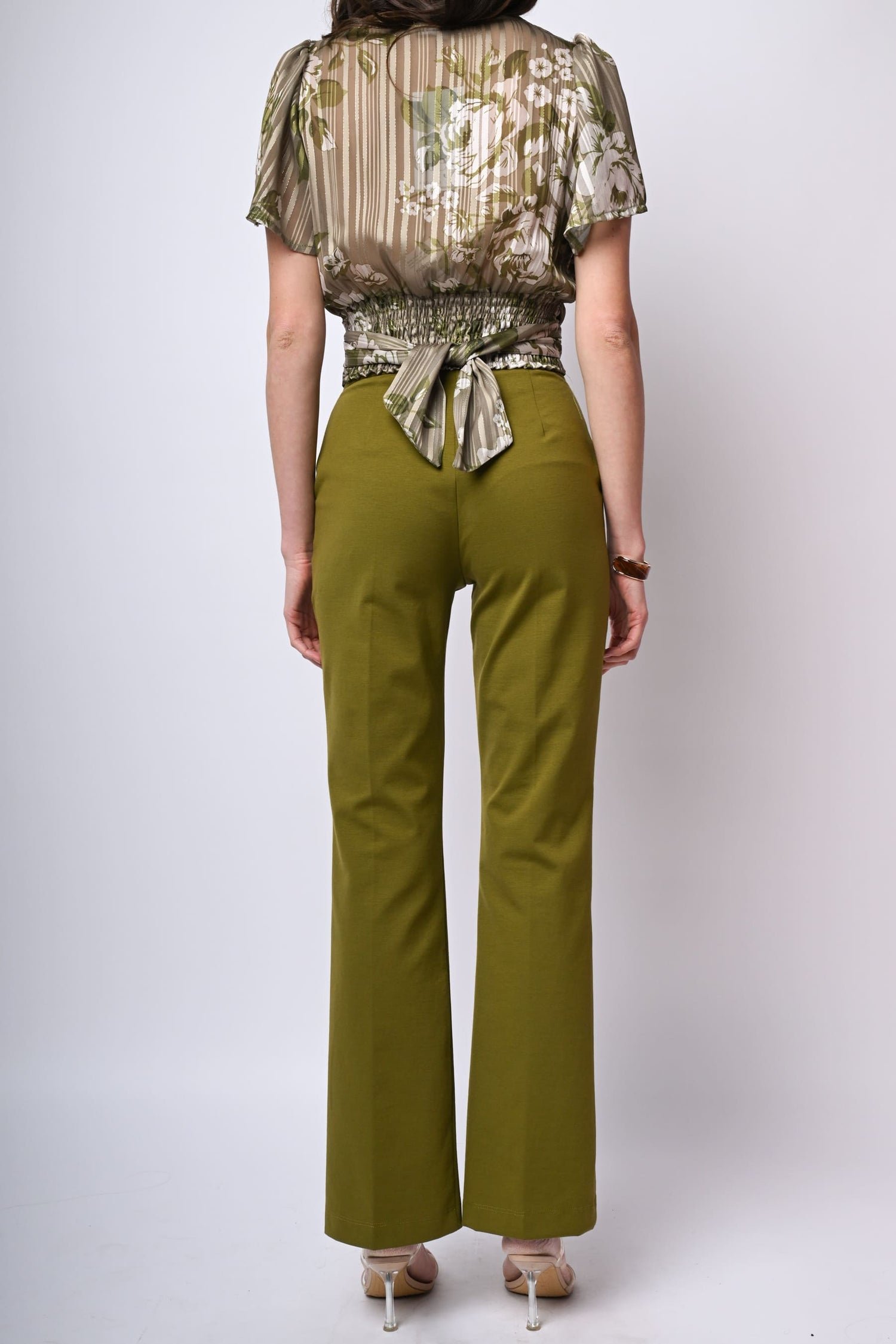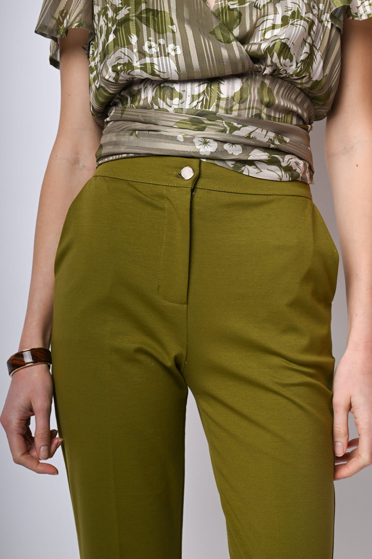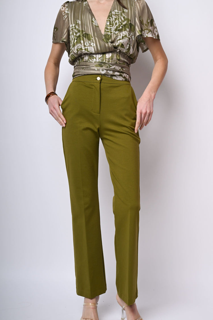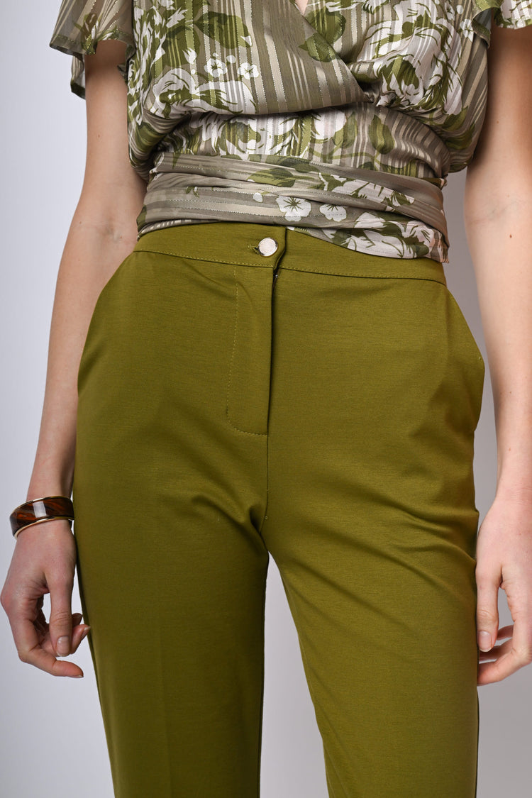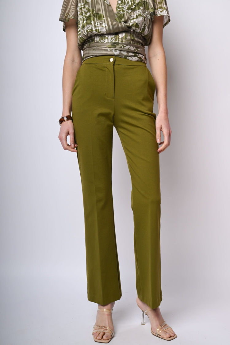 Pantaloni misto cotone e nylon stretch verde muschio con bottone di chiusura in metallo dorato e zip, tasche laterali e gamba svasata con piega stirata.