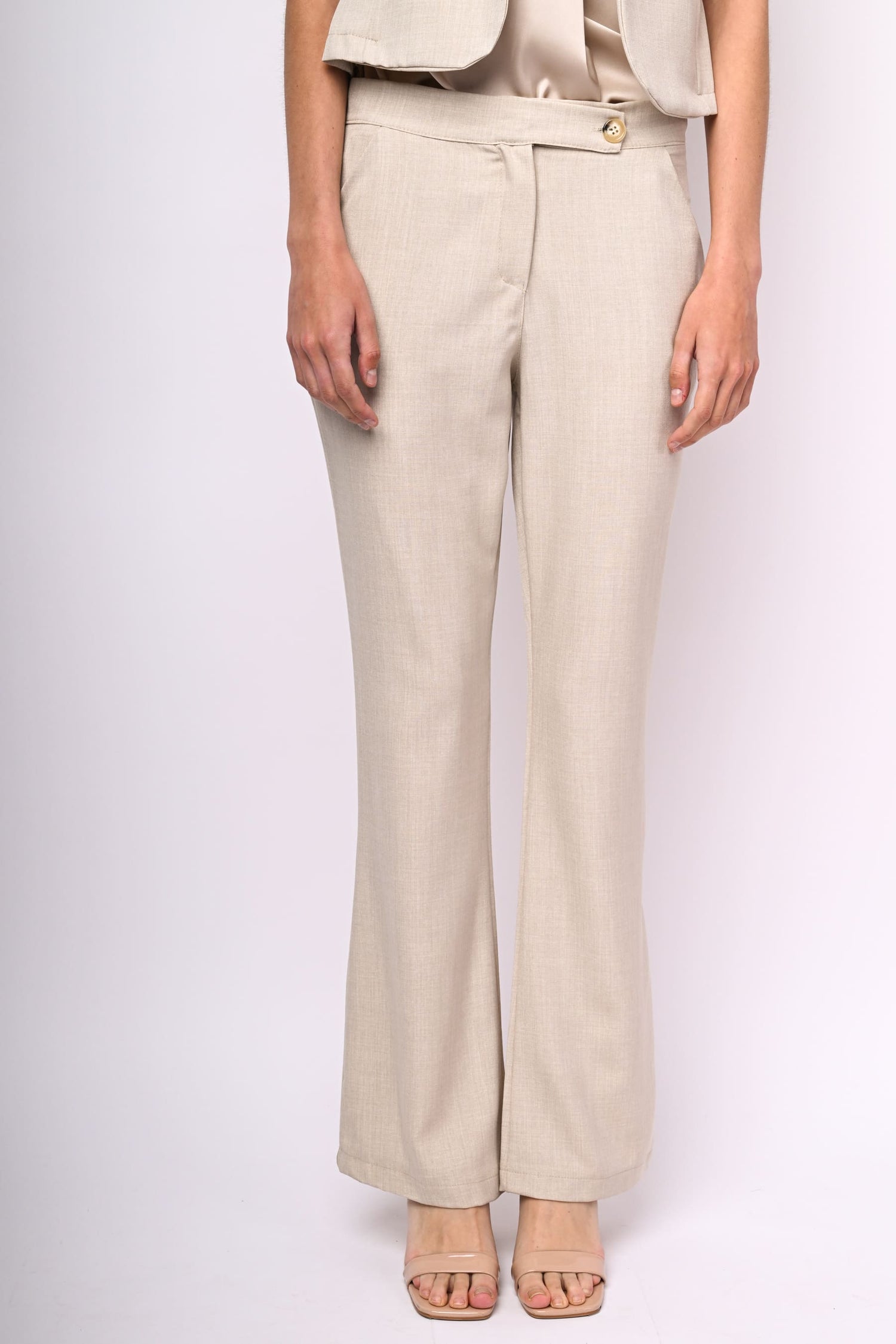 Pantaloni in tessuto beige con bottone e zip di chiusura, tasche laterali e gamba svasata.