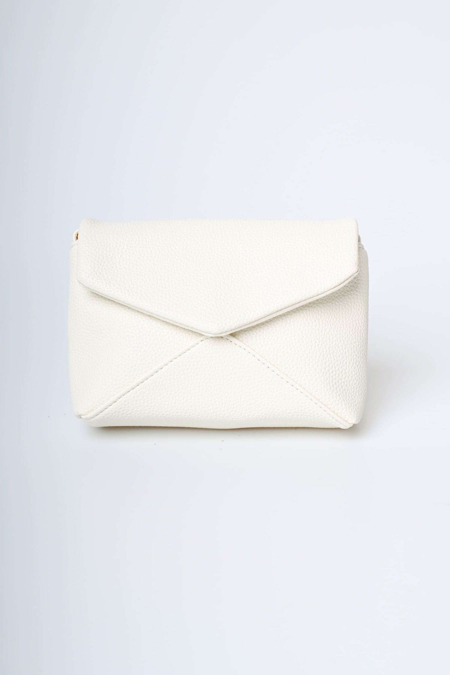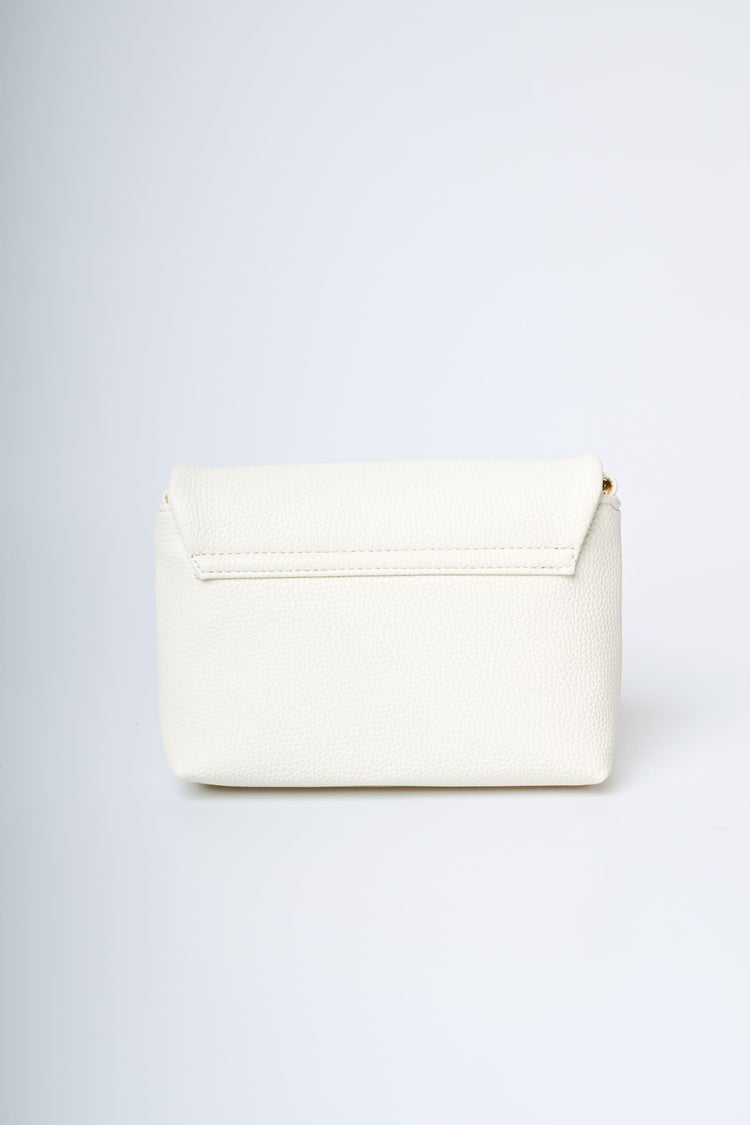 Borsa piccola crossbody in similpelle bianca con design a busta, risvolto con chiusura magnetica nascosta, tracolla con nodi, tasselli sfrangiati laterali e hardware in metallo dorato.