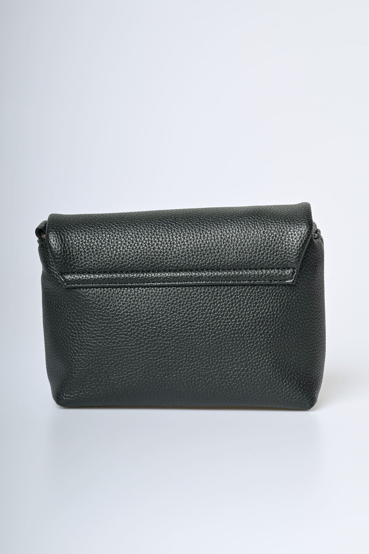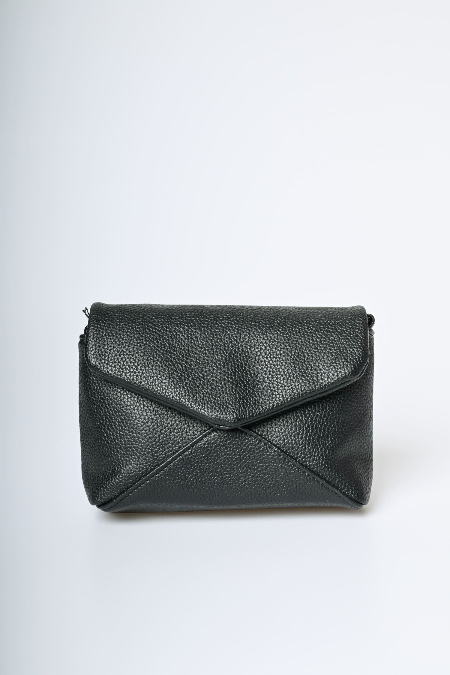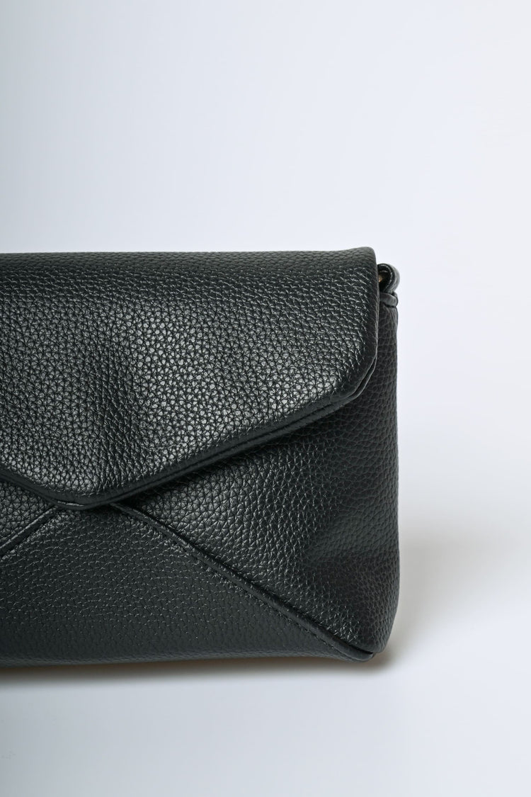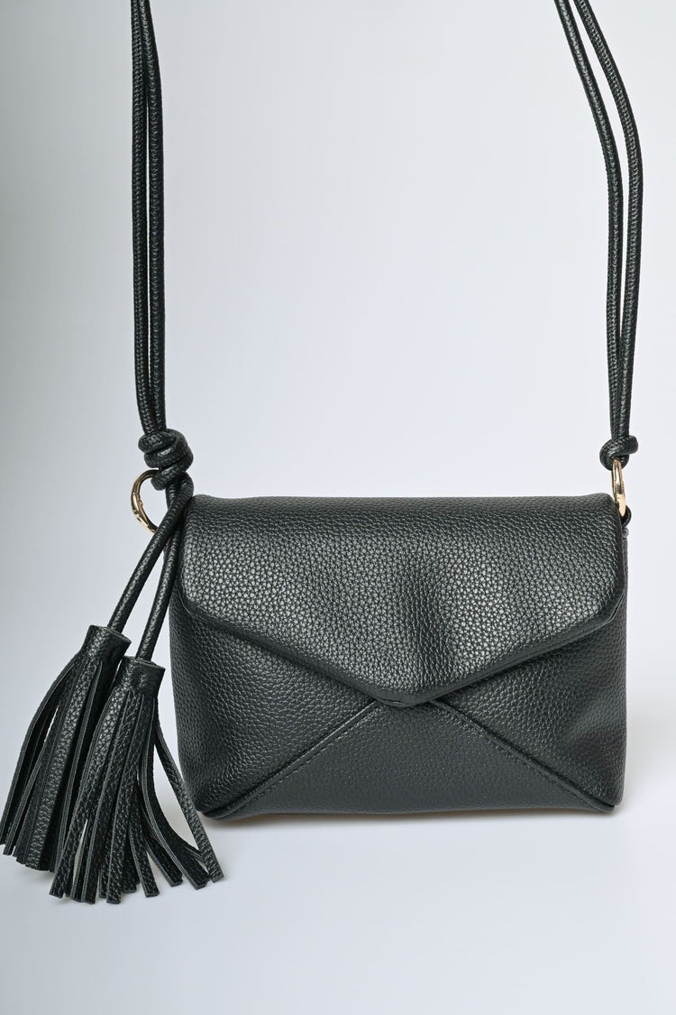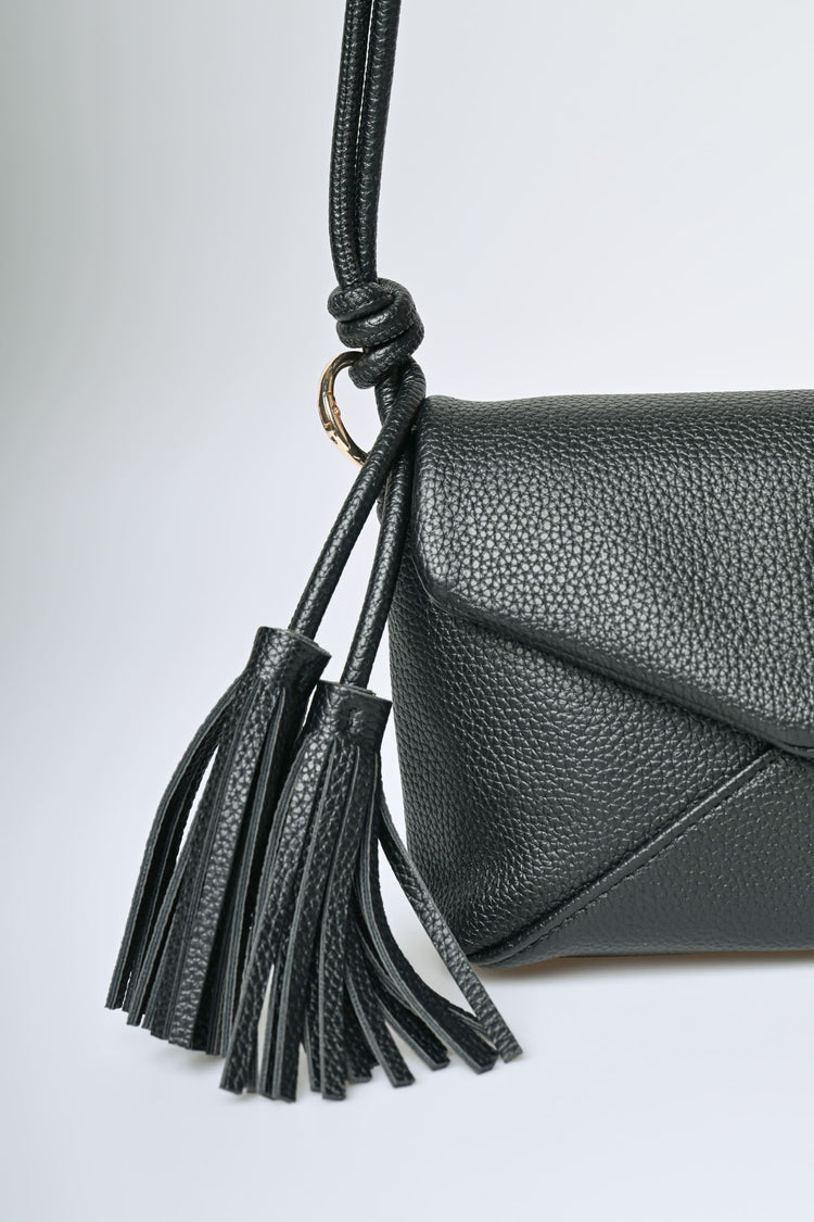 Borsa piccola crossbody in similpelle nera con design a busta, risvolto con chiusura magnetica nascosta, tracolla con nodi, tasselli sfrangiati laterali e hardware in metallo dorato.