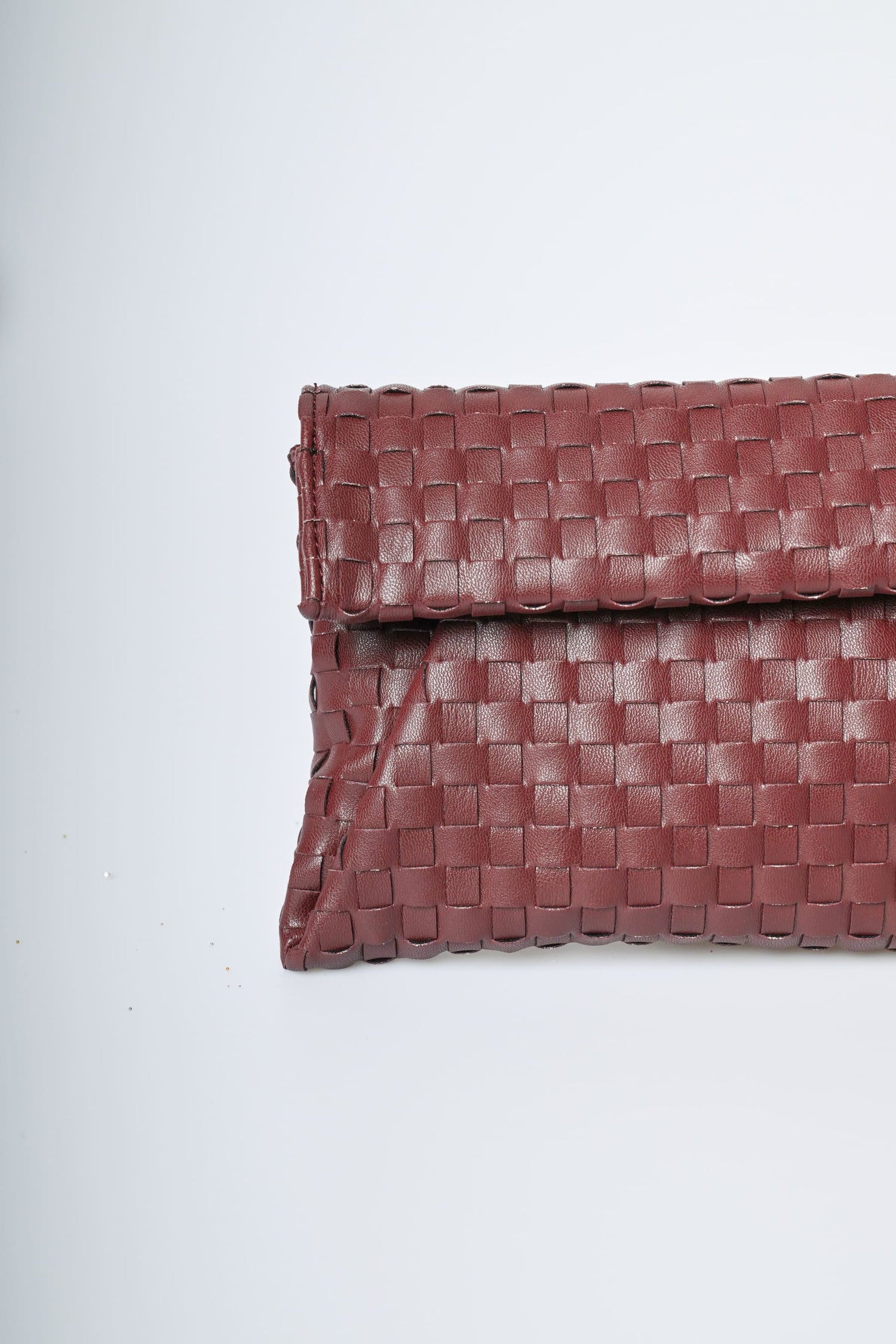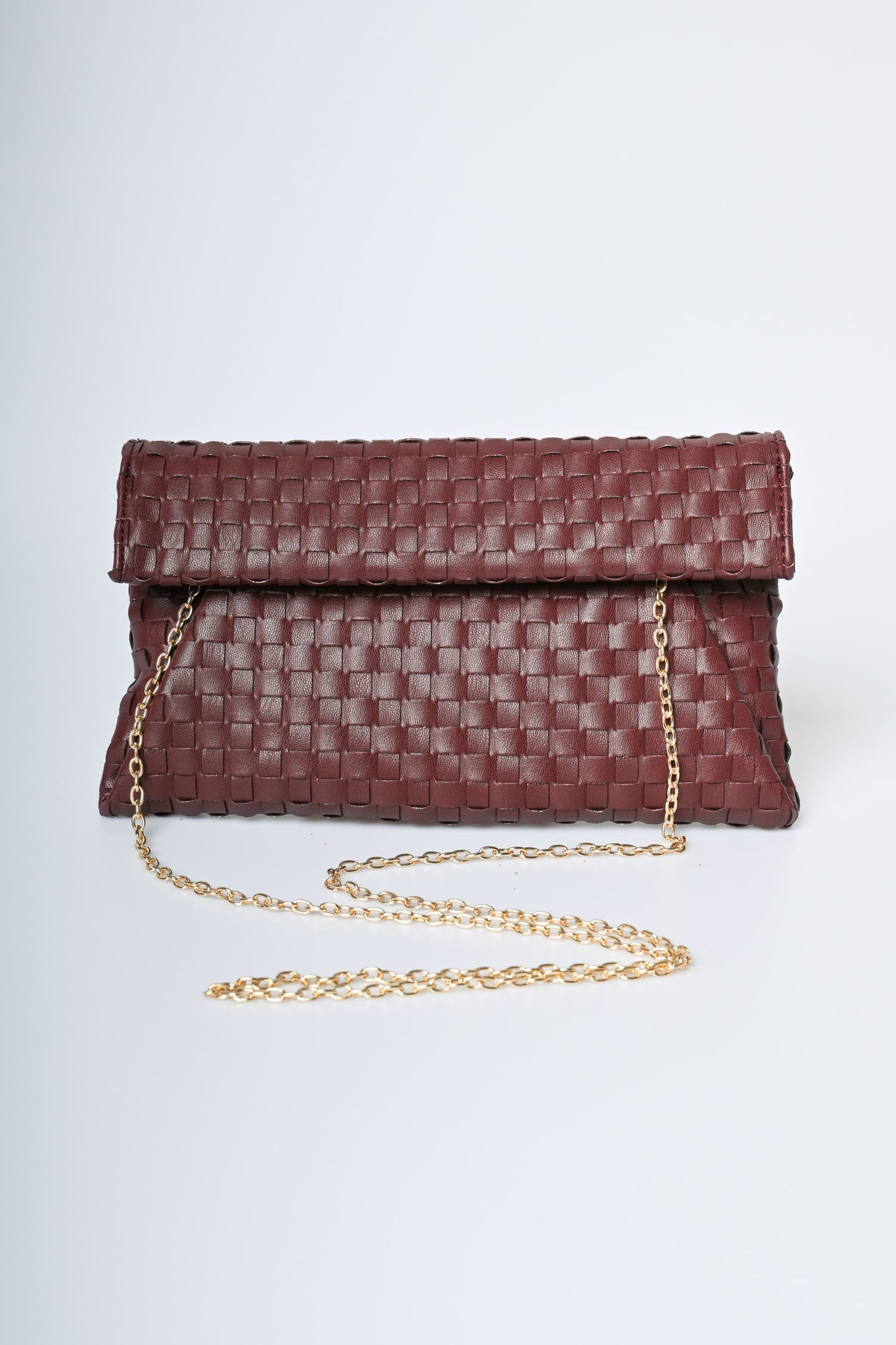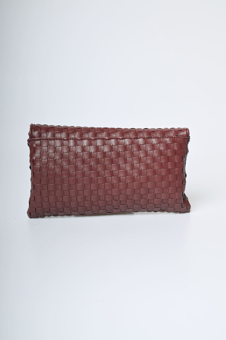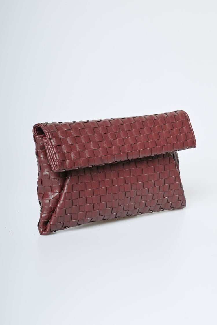Pochette a busta in similpelle intrecciata bordeaux con chiusura magnetica nascosta, tracolla a catenella rimovibile e hardware in metallo dorato.