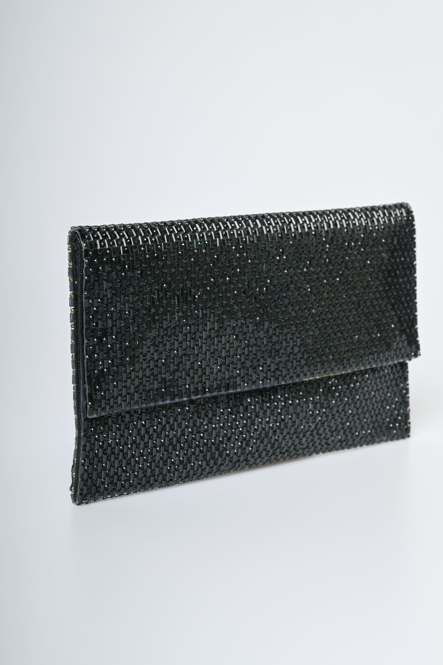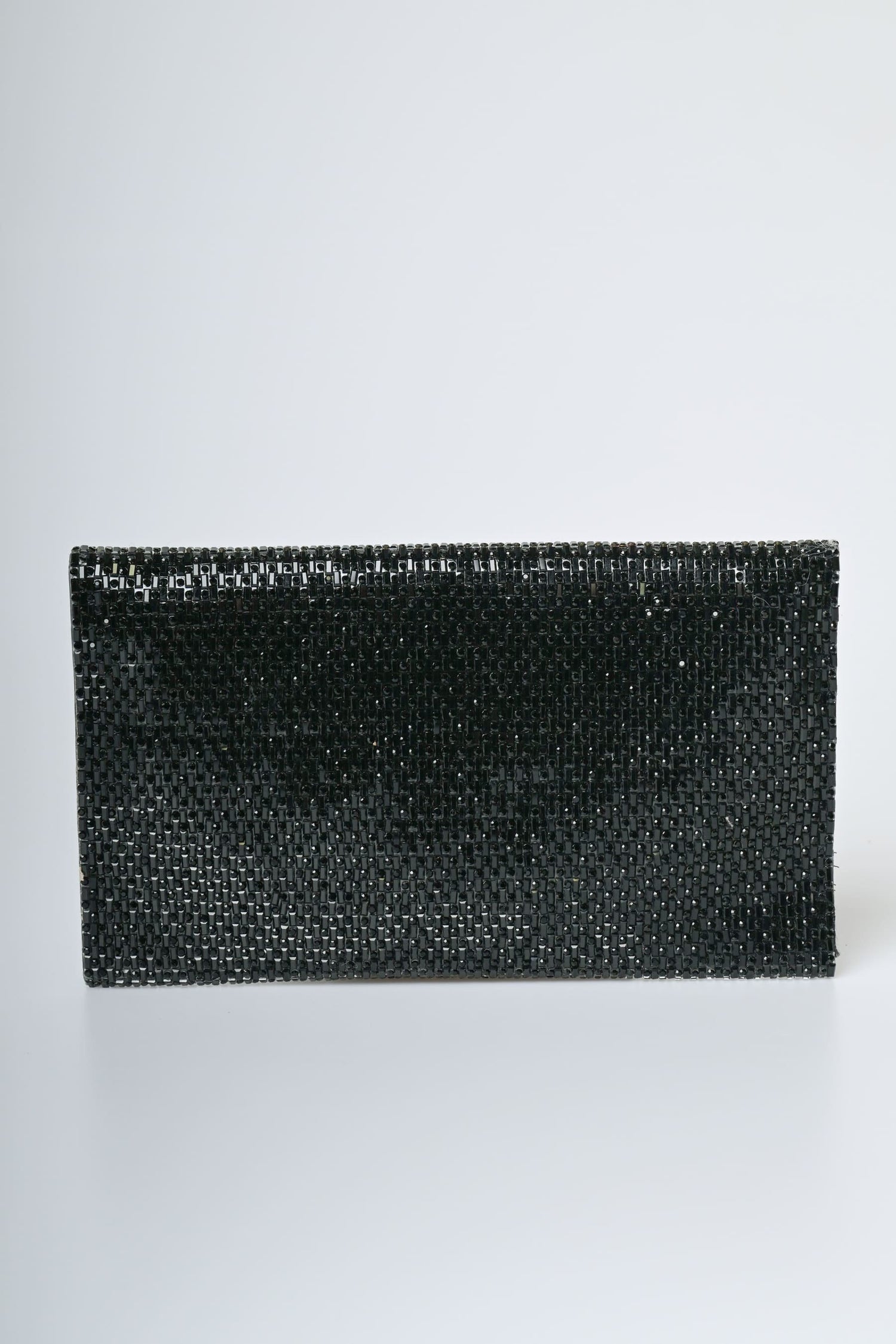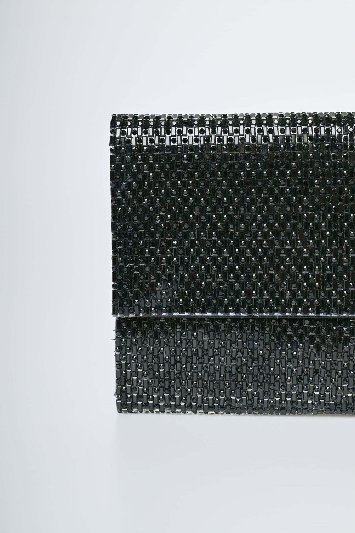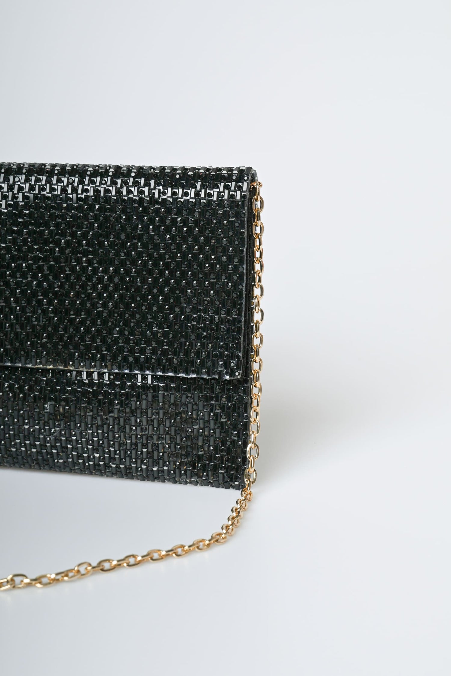 Pochette piatta in similpelle impreziosita da strass neri all-over con risvolto e tracolla a catenella rimovibile in metallo dorato.
