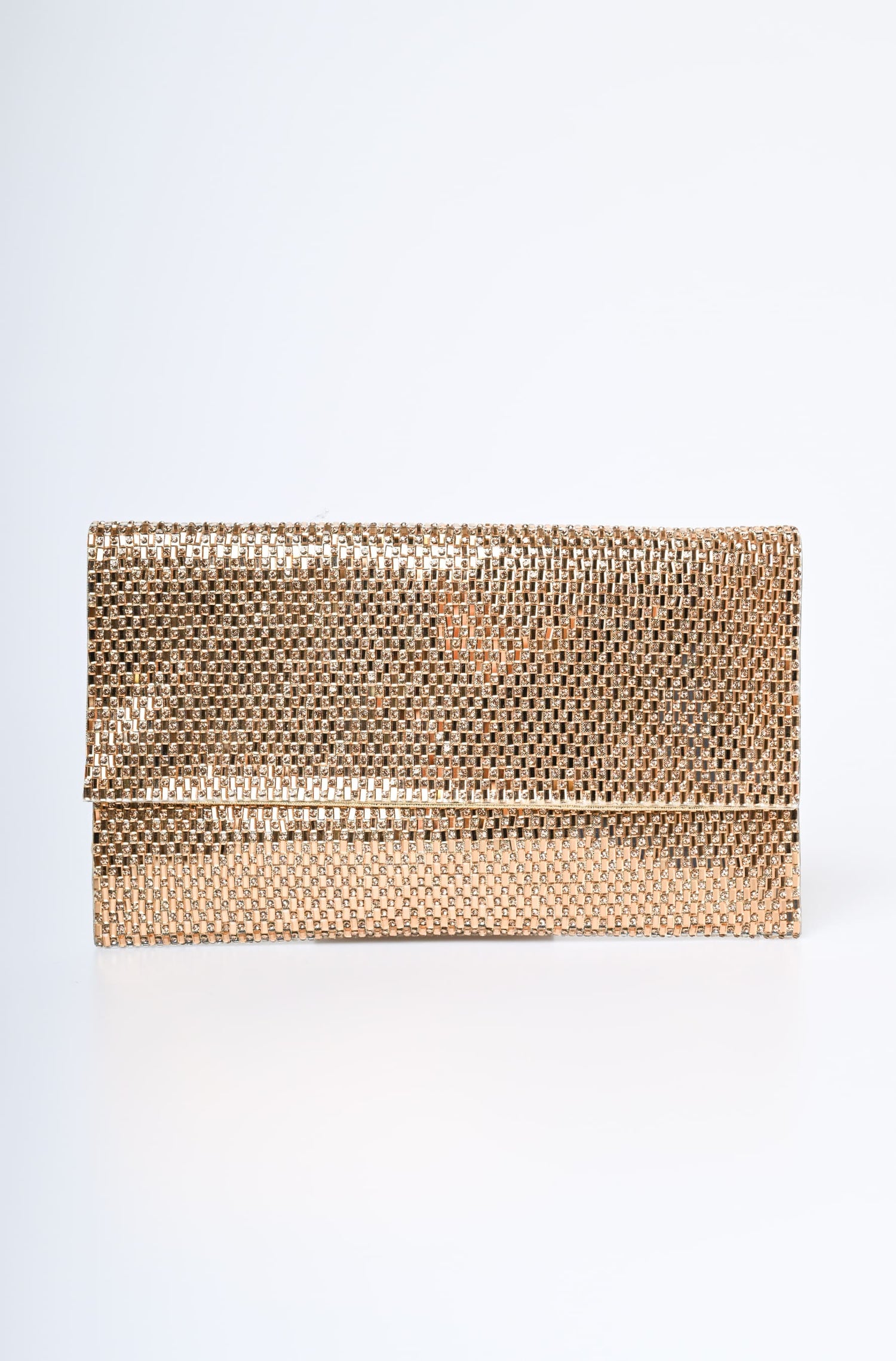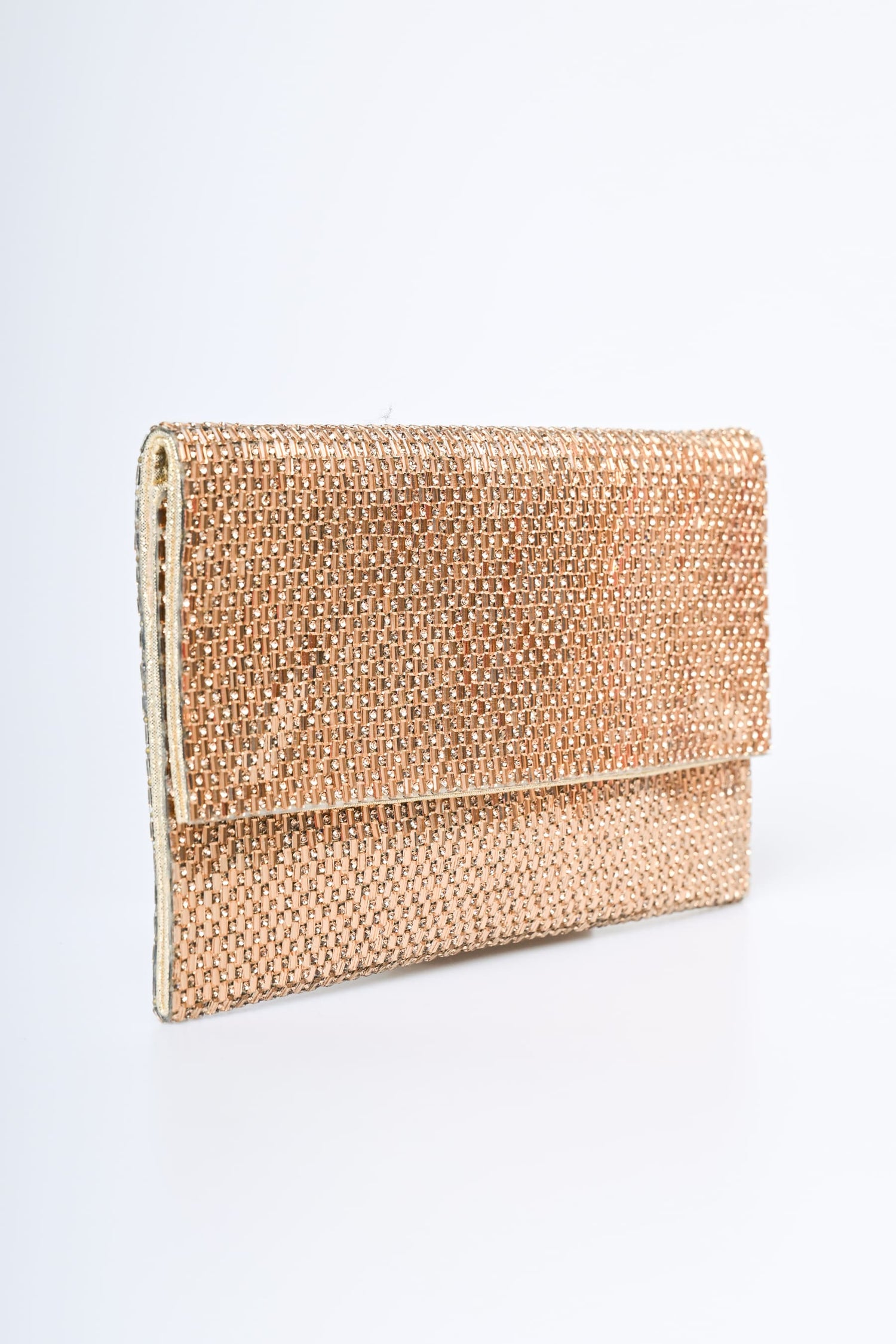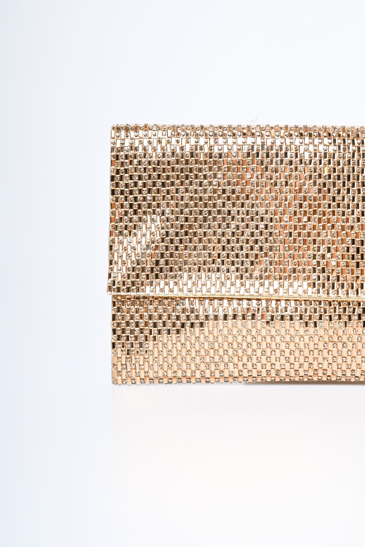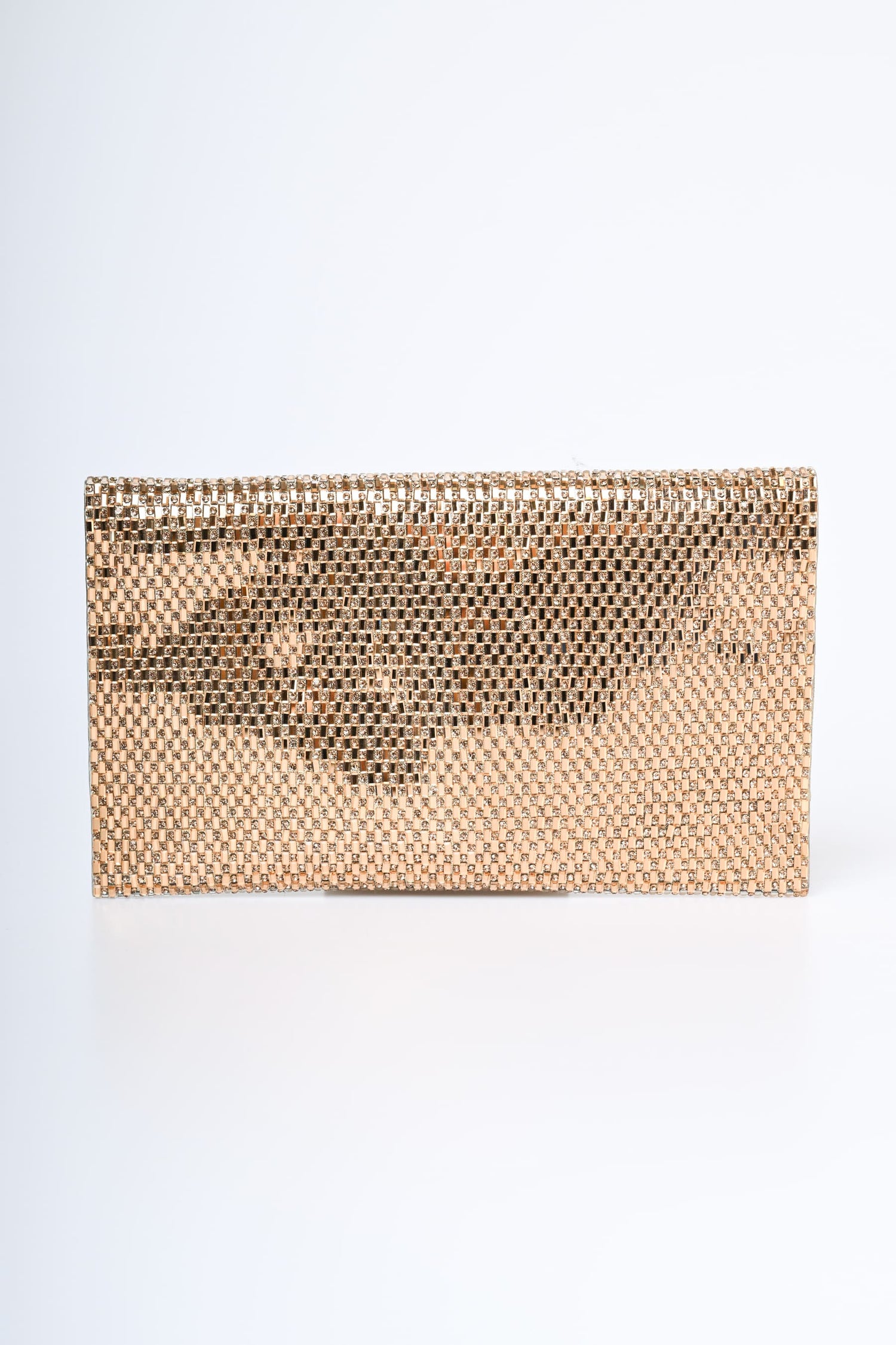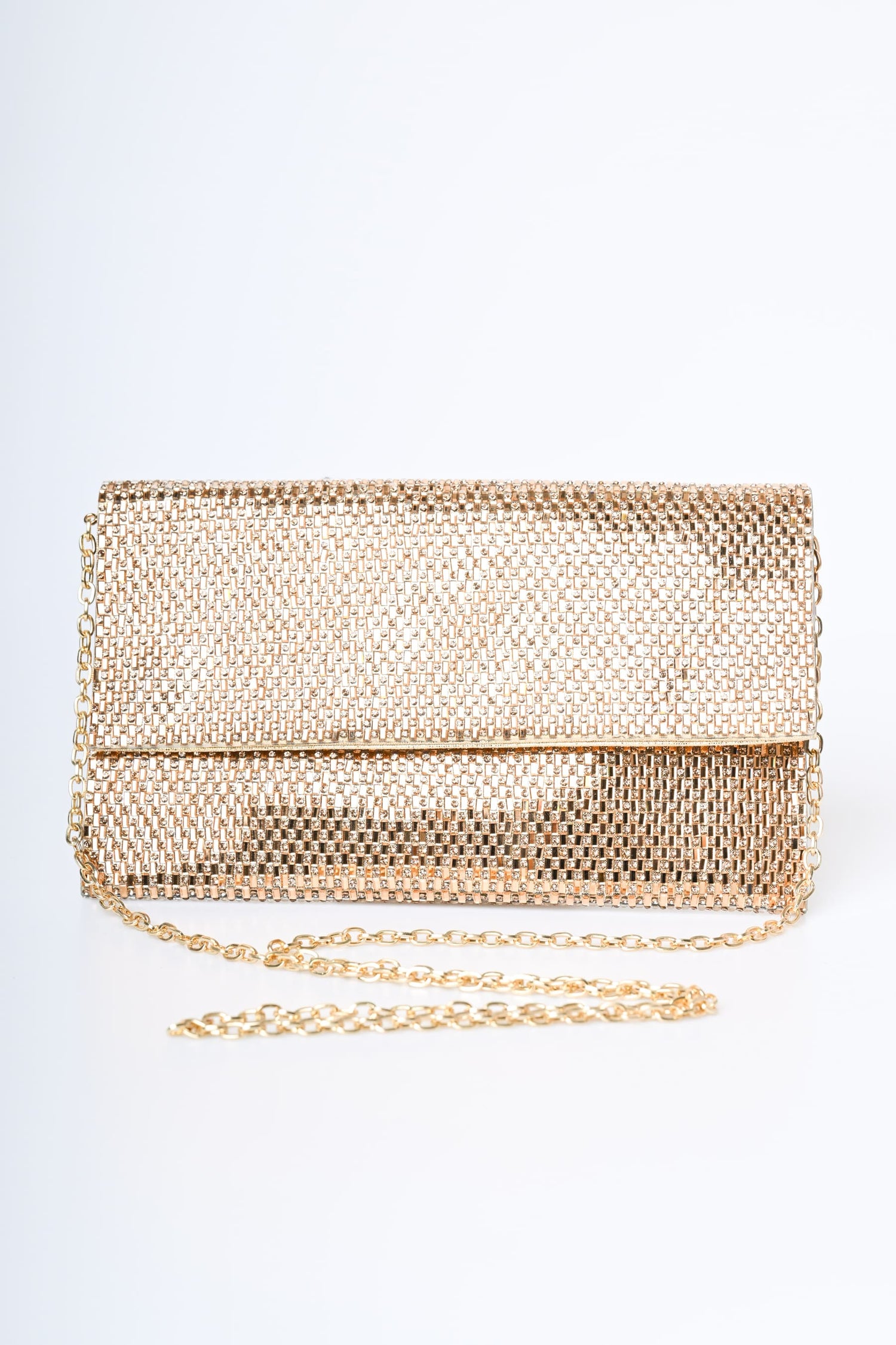 Pochette piatta in similpelle impreziosita da strass dorati all-over con risvolto e tracolla a catenella rimovibile.